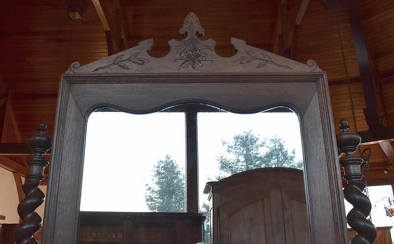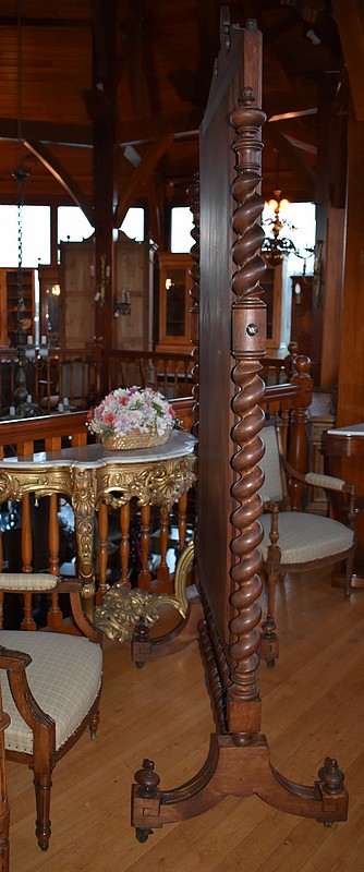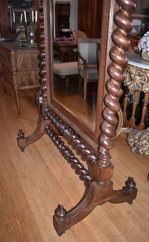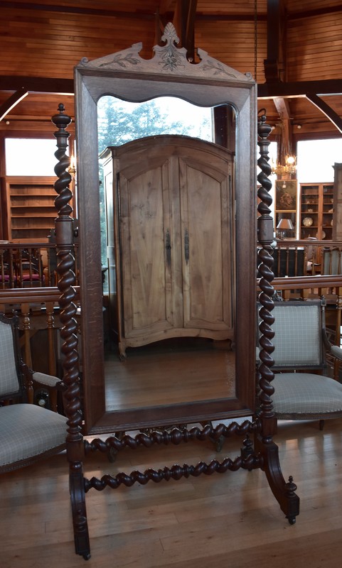 Grande psyché de style Louis XIII en chêne. Le miroir, avec encadrement surmonté d’un fronton sculpté de feuilles, est entouré de 2 colonnes torsadées.