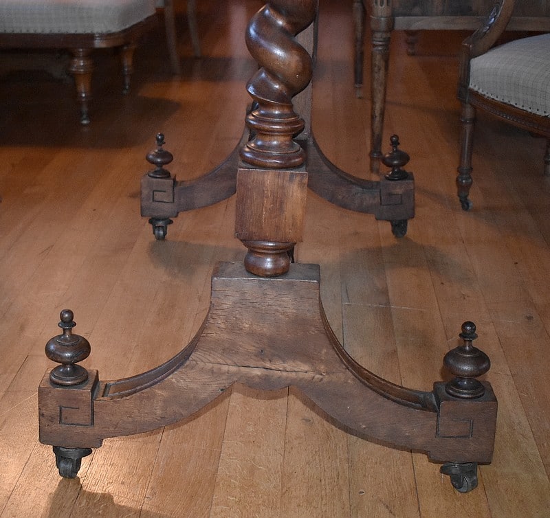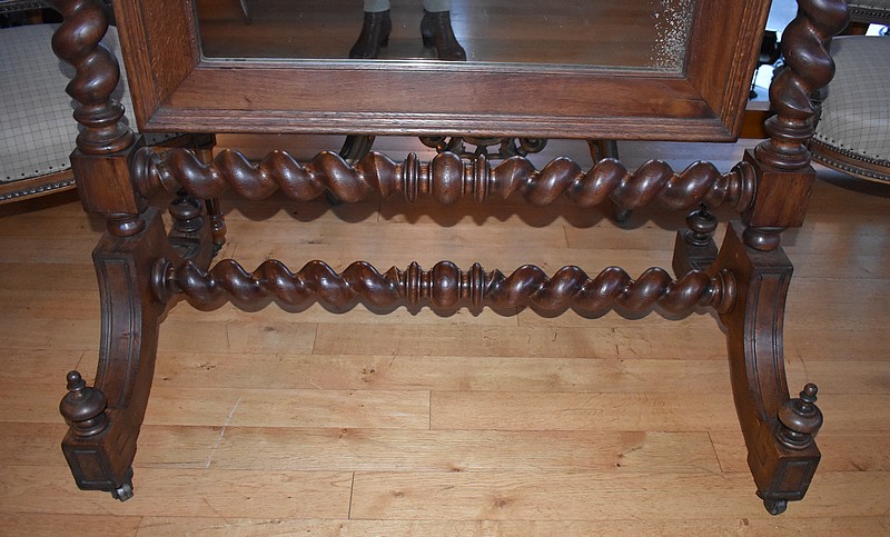 Elle repose sur un piètement entretoisé par 2 colonnes torsadées et posé sur roulettes.