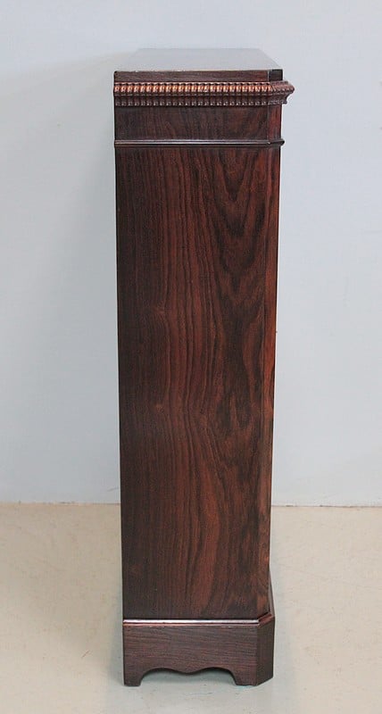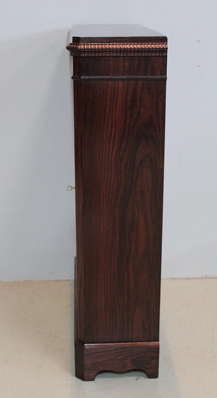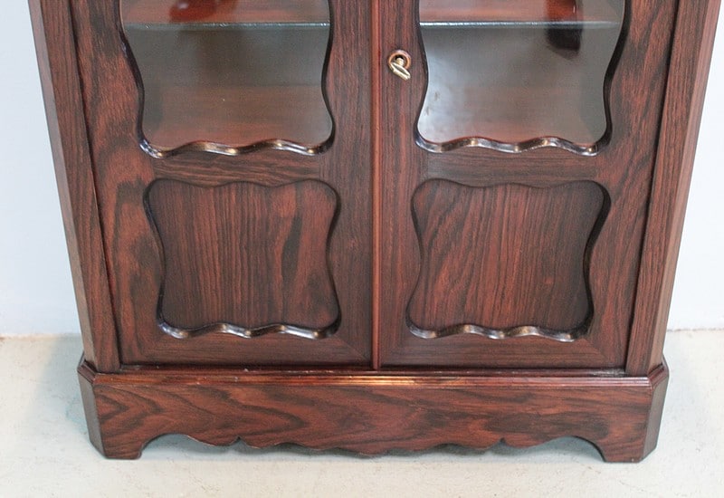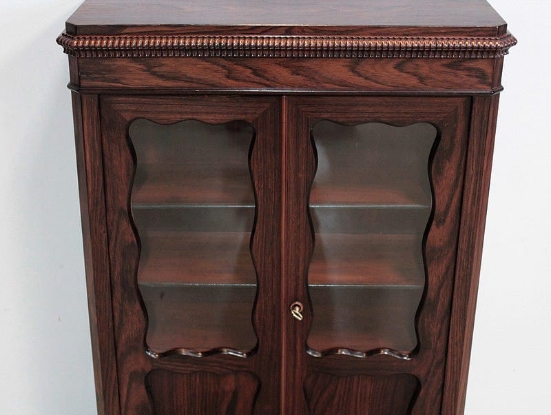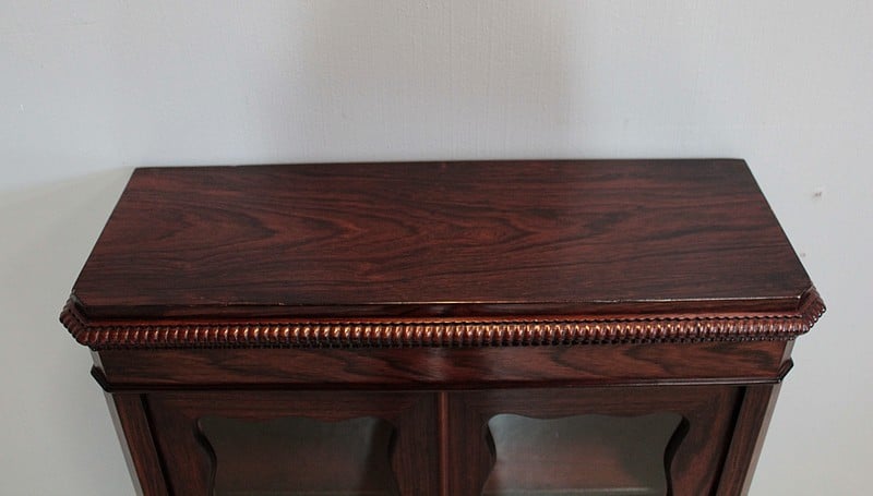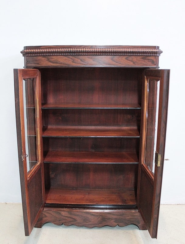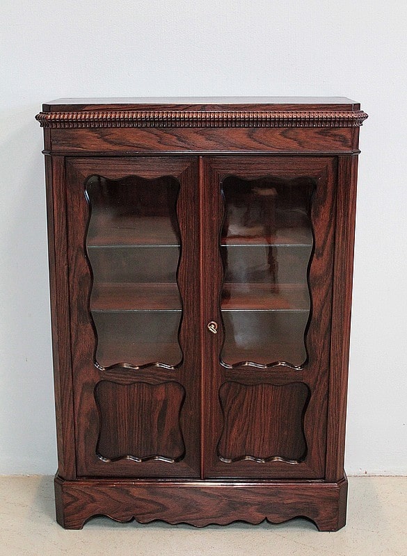 Rare petite bibliothèque d’enfant en placage de palissandre ouvrant à 2 portes haut vitré. Dessus entouré d’une moulure. Les vitres, les panneaux du bas et la traverse basse sont chantournés. Vitres d’origine.
