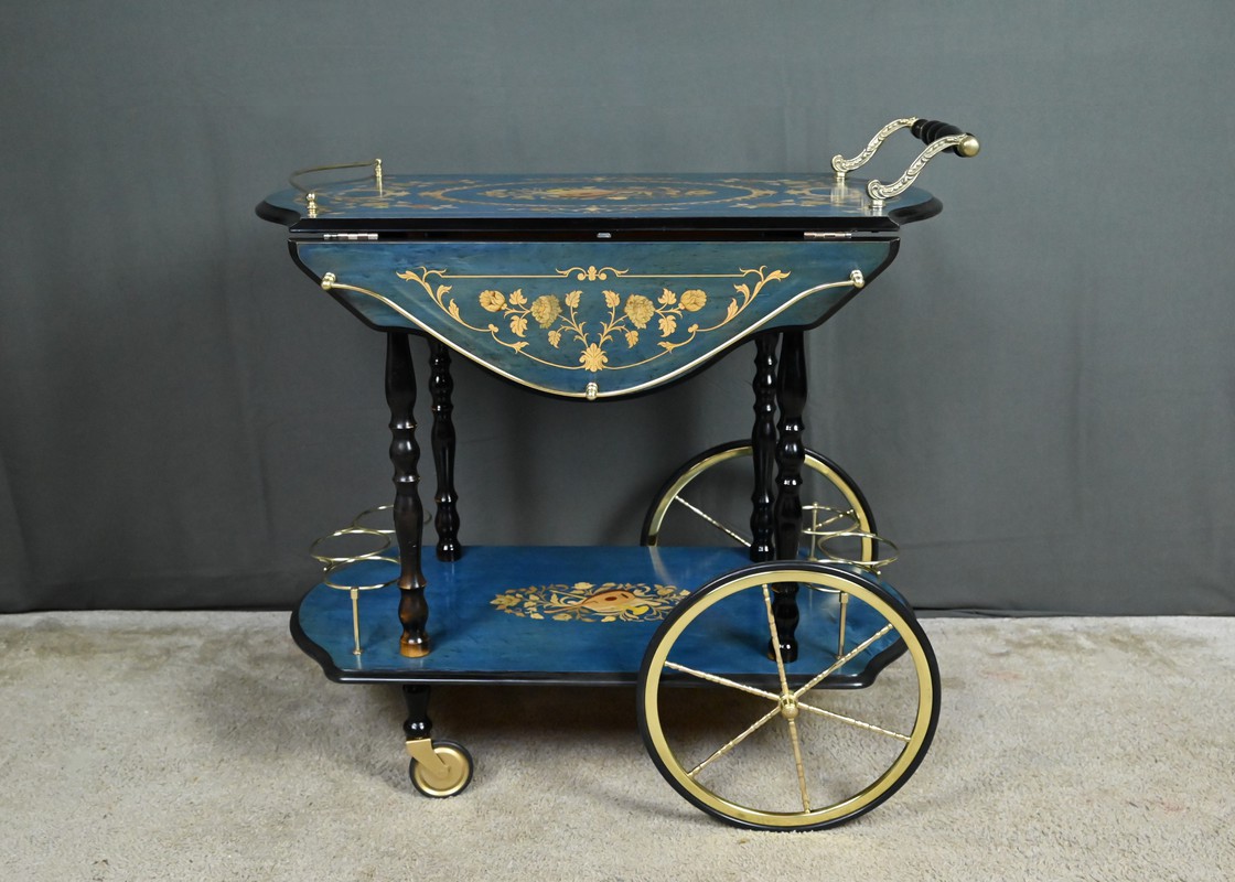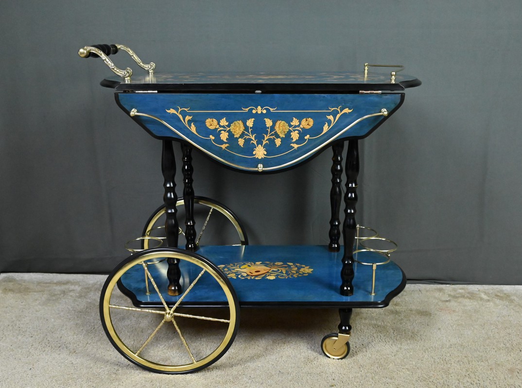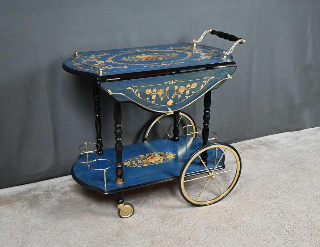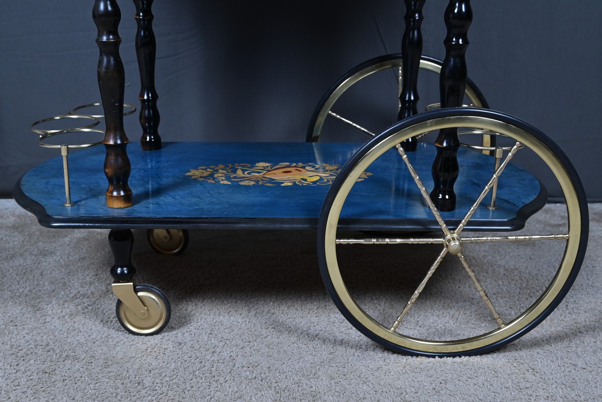 D’un bleu azur lumineux, ce rare chariot de service à rabats, réalisé en marqueterie italienne dans les années 1960, incarne avec panache l’élégance artisanale et le raffinement décoratif propres au mobilier d’époque.