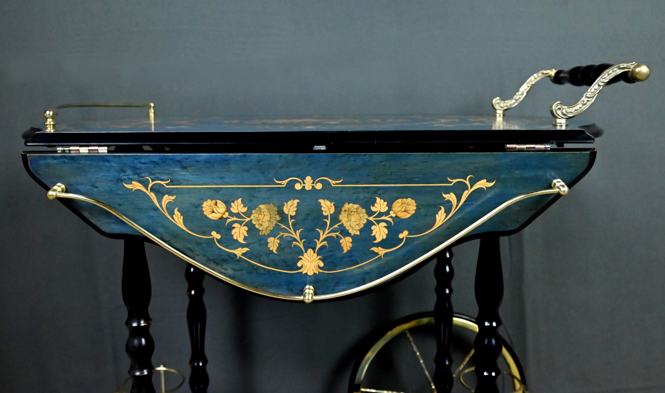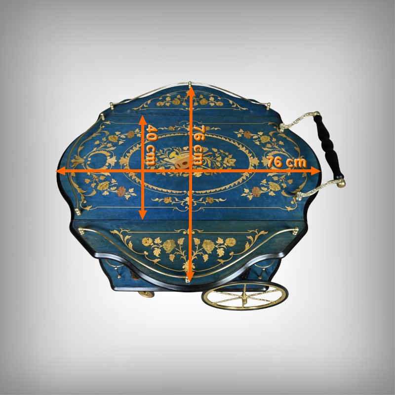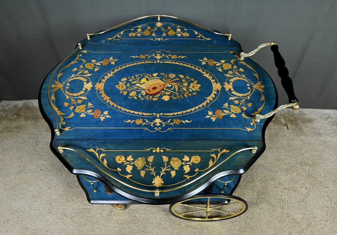 D’un bleu azur lumineux, ce rare chariot de service à rabats, réalisé en marqueterie italienne dans les années 1960, incarne avec panache l’élégance artisanale et le raffinement décoratif propres au mobilier d’époque.