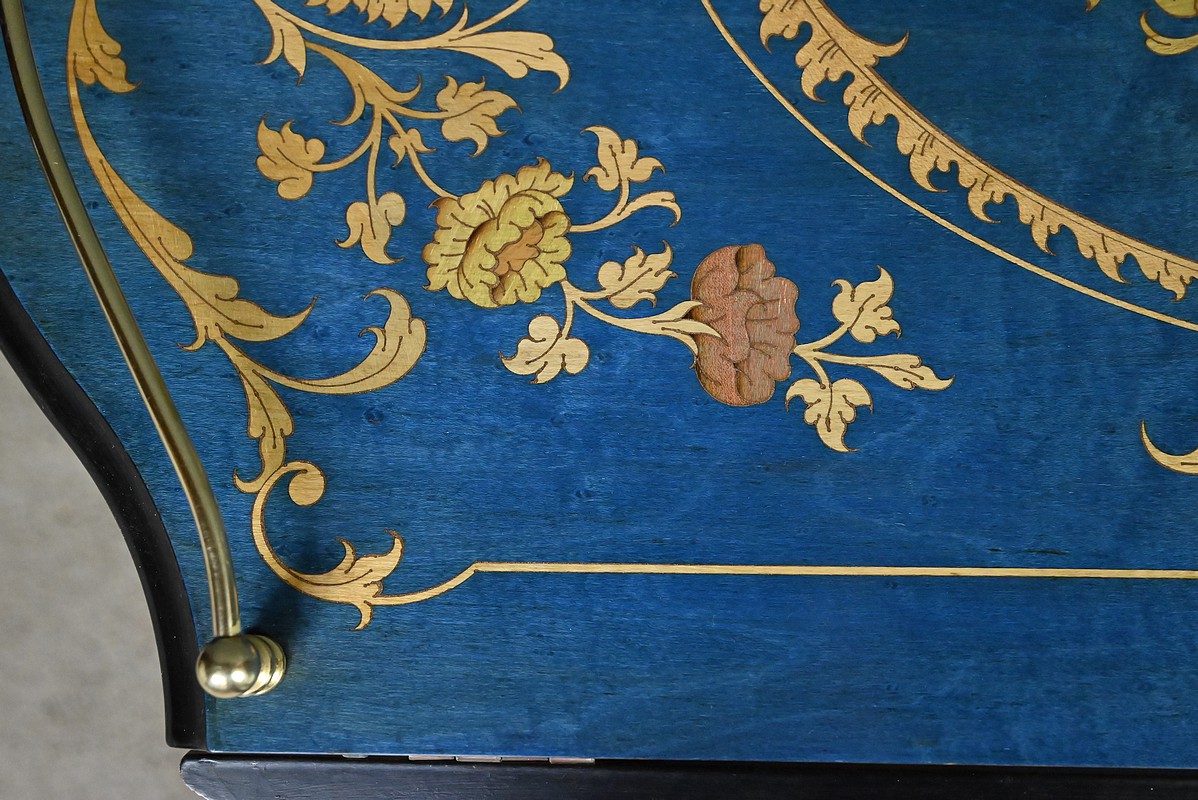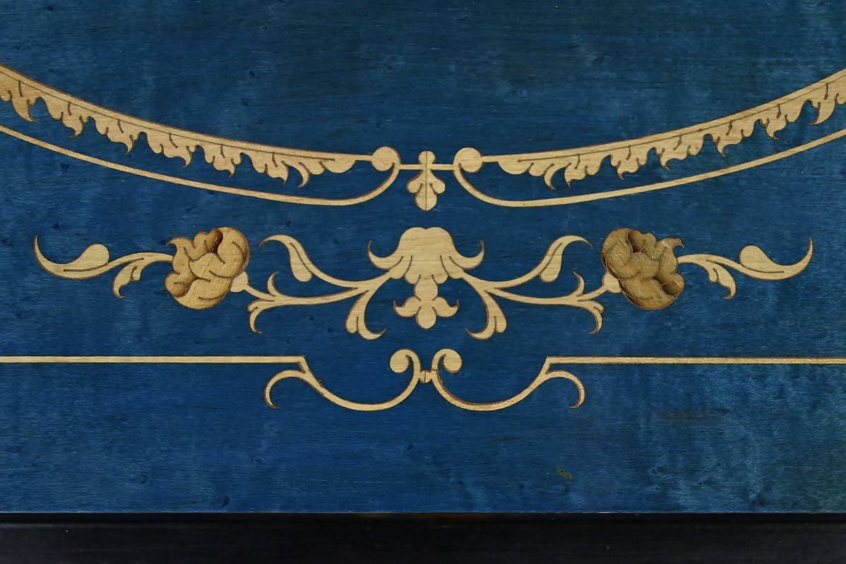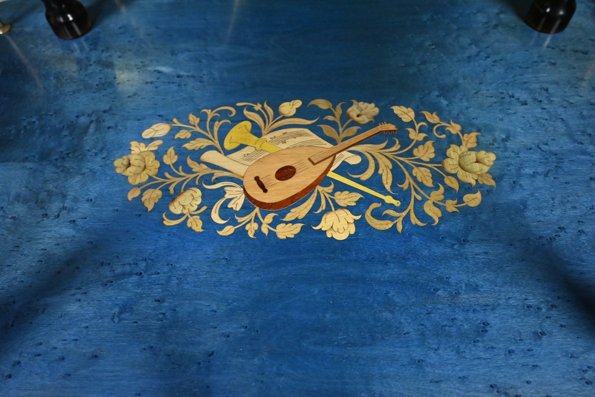 Sa structure en bois peint, finement travaillée, est sublimée par une marqueterie florale délicate et d’instruments, hommage subtil à la tradition décorative de la renaissance italienne.