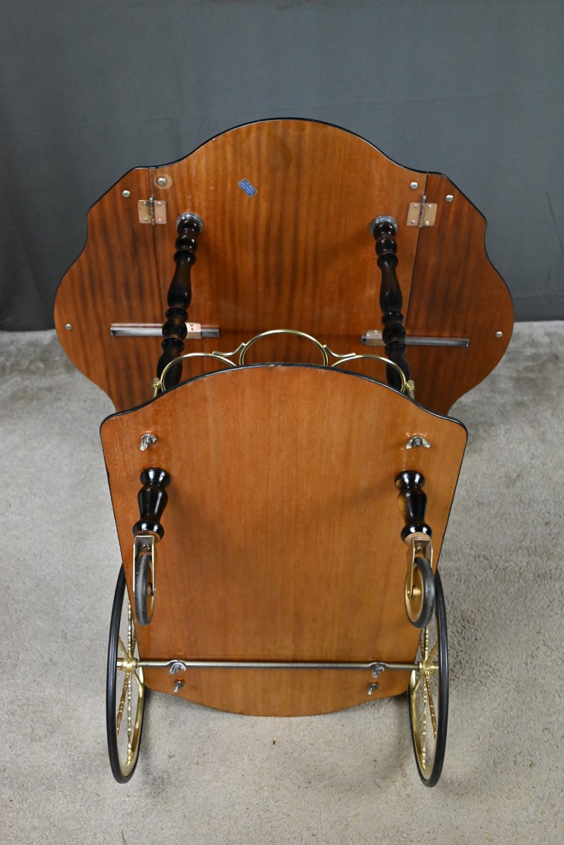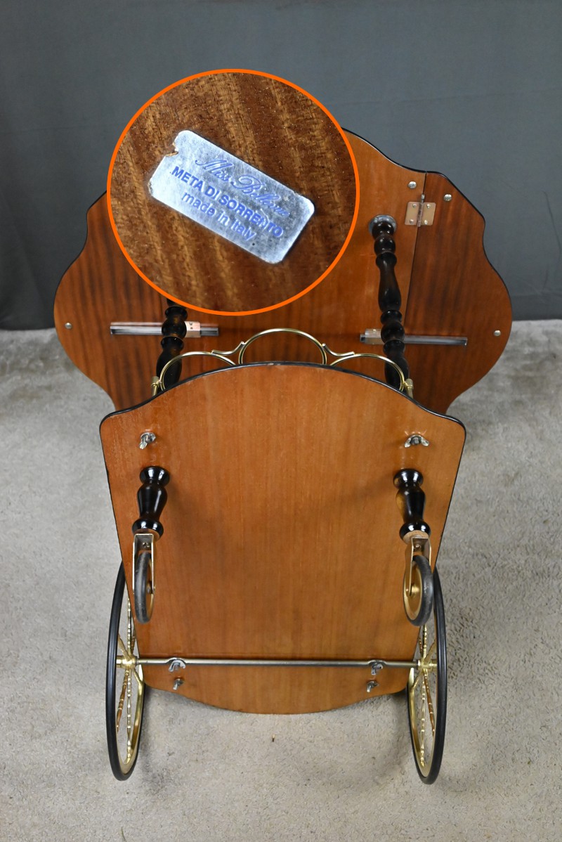 Les roues arrières à rayons et les roulettes avants en métal doré, associées à une poignée en bois tourné accompagnée également de métal doré, facilitent son déplacement tout en conservant son allure noble.
