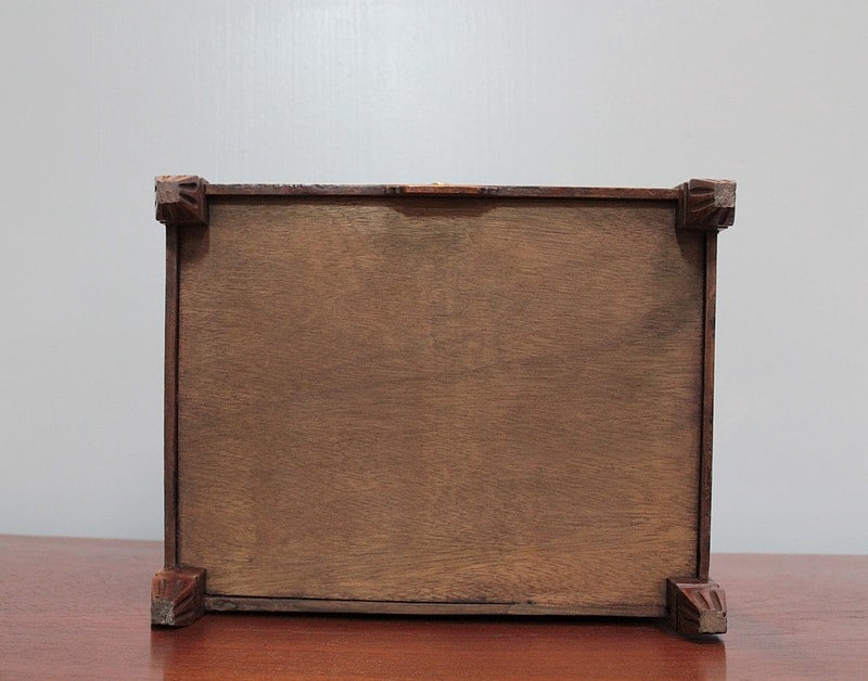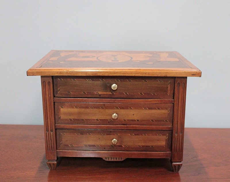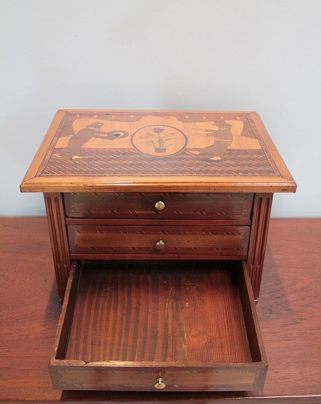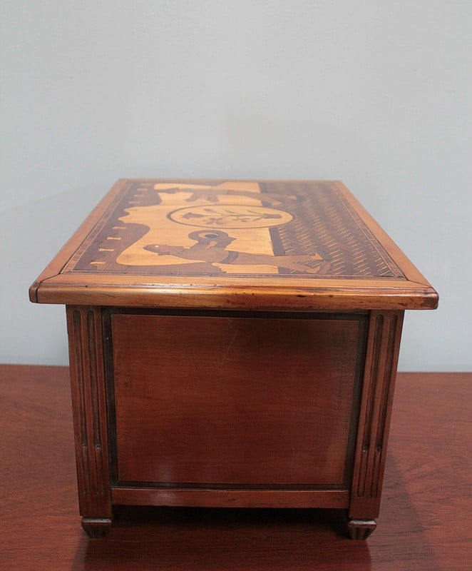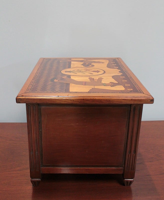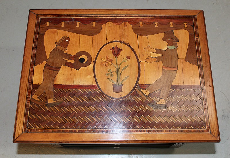 Le dessus est marqueté de merisier, palissandre et bois divers teintés, à décor naïf de personnages de théâtre et d’un médaillon de fleurs.