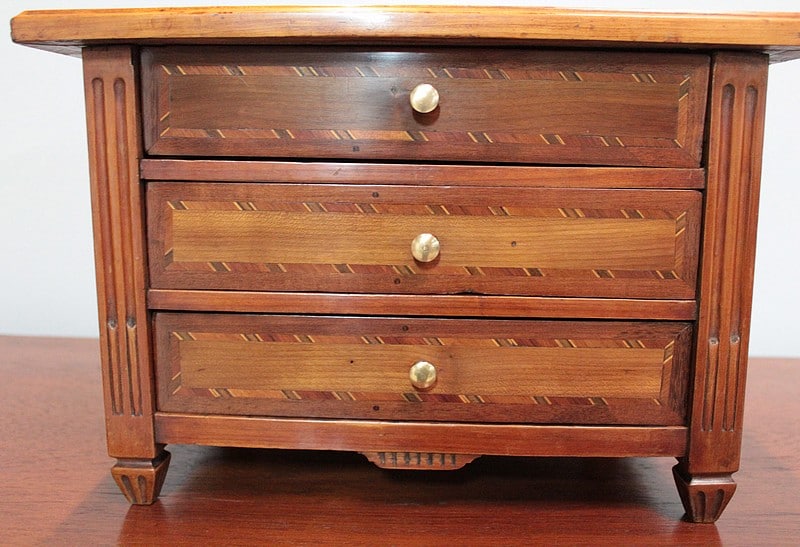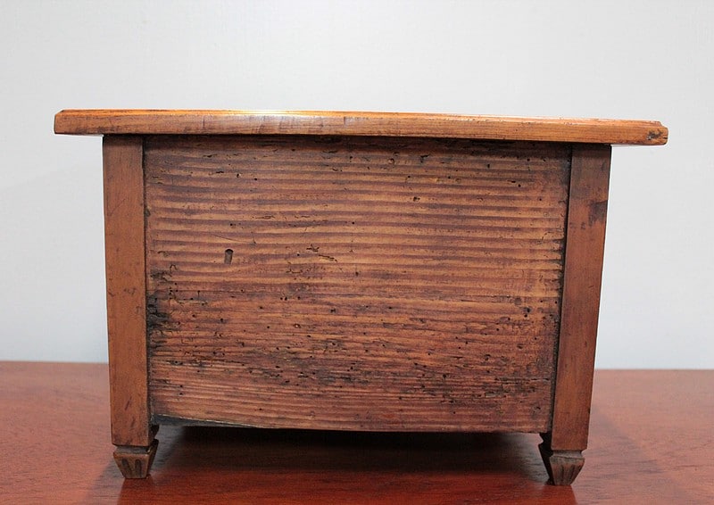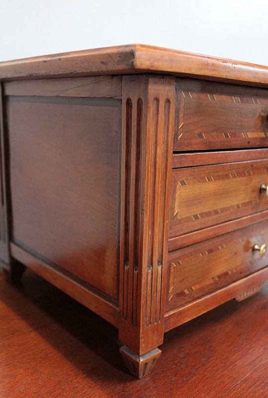 Petite commode de maîtrise Louis XVI en bois fruitier et placage ouvrant à 3 tiroirs.
