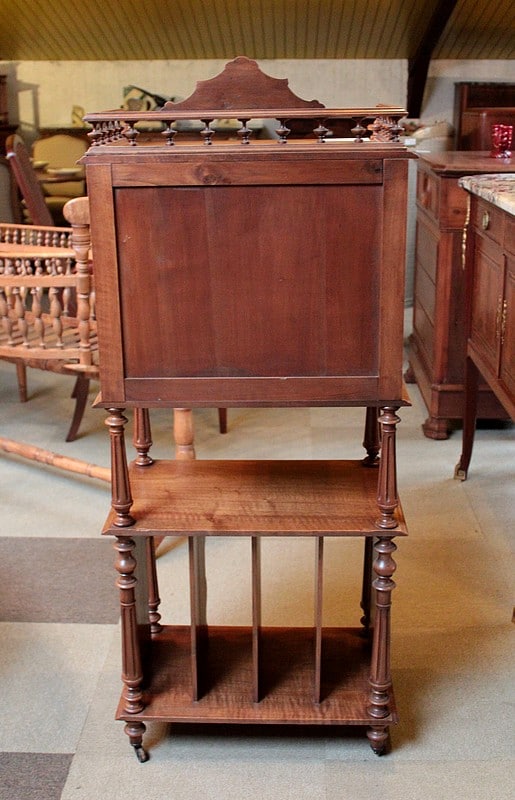 Étagère à musique en noyer dans le goût Louis XVI, époque 1920. La partie haute ouvre par 2 petites portes vitrées (avec verres biseautés) et est entourée sur 3 faces d’une galerie bois avec sculpture en fond. Les montant et les colonnes sont à cannelures. Elle repose sur 4 petits pieds ronds sur roulettes. Époque 1920.