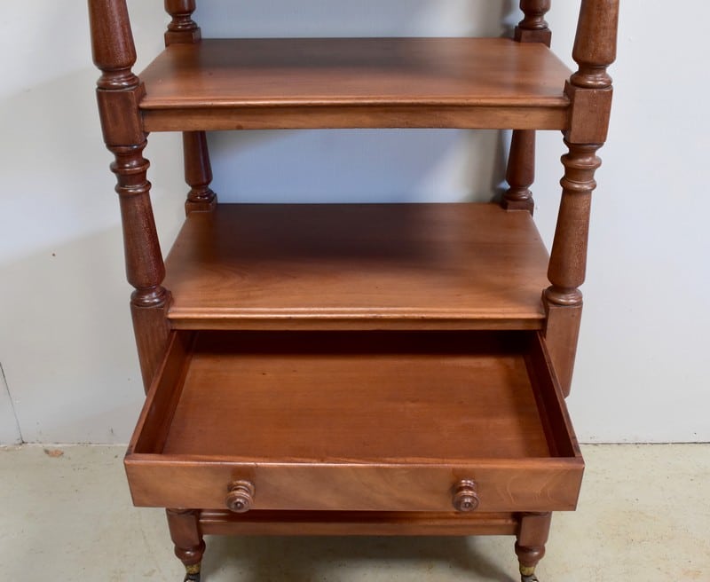 Étagère desserte en acajou blond à 4 plateaux et ouvrant par un tiroir sous le troisième plateau.
