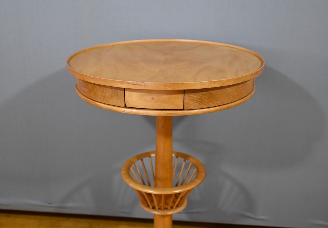 Ce guéridon-tricoteuse en merisier blond est une pièce de mobilier ingénieuse et élégante, parfaite pour les amateurs de meubles anciens et fonctionnels.