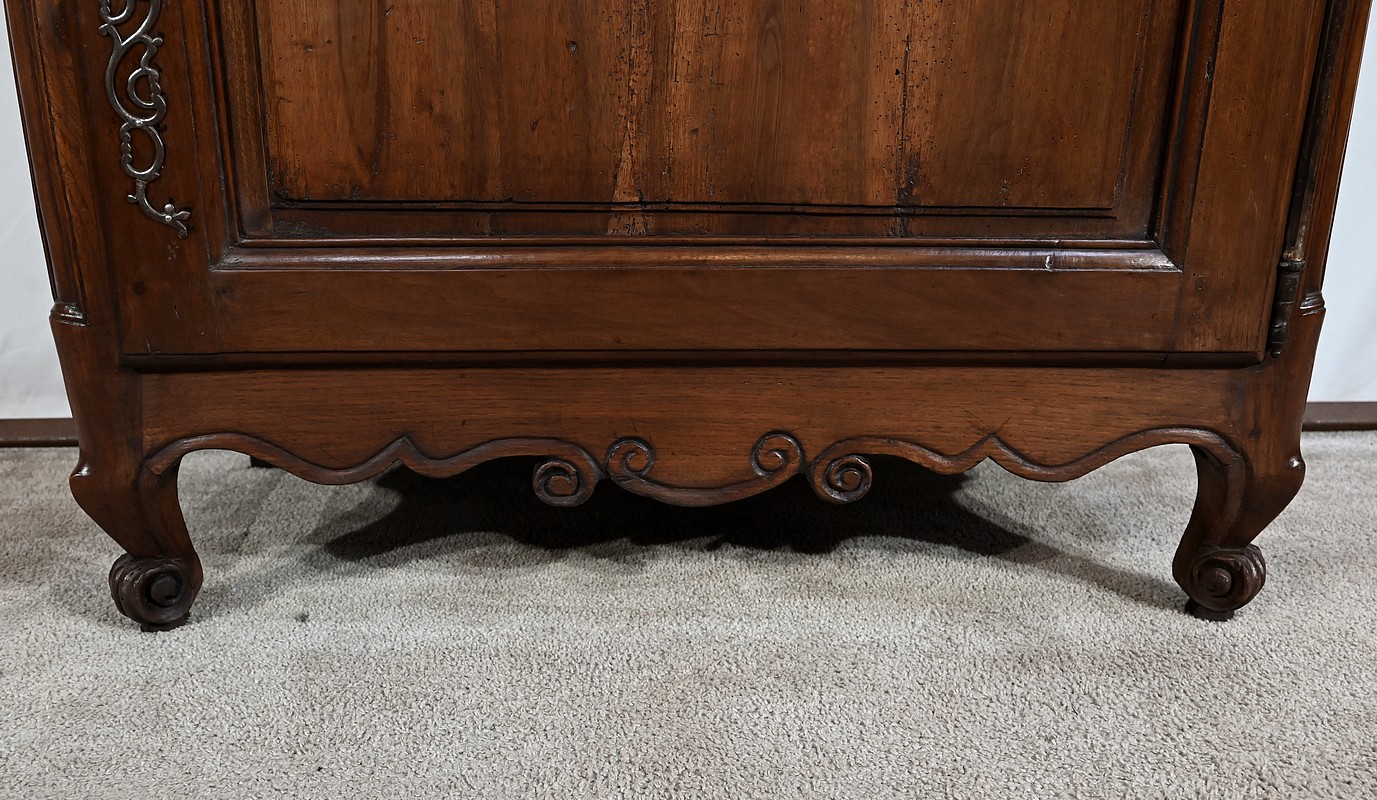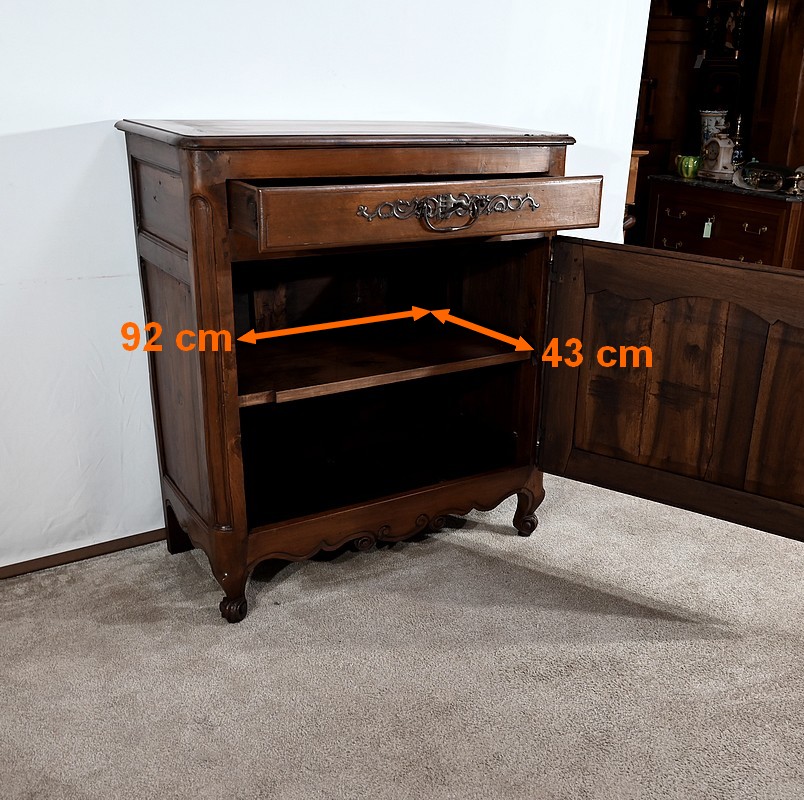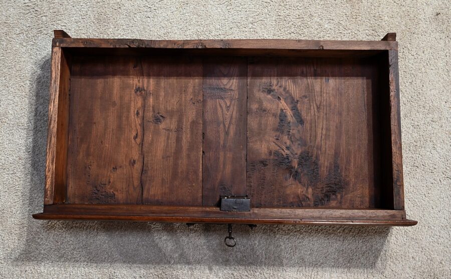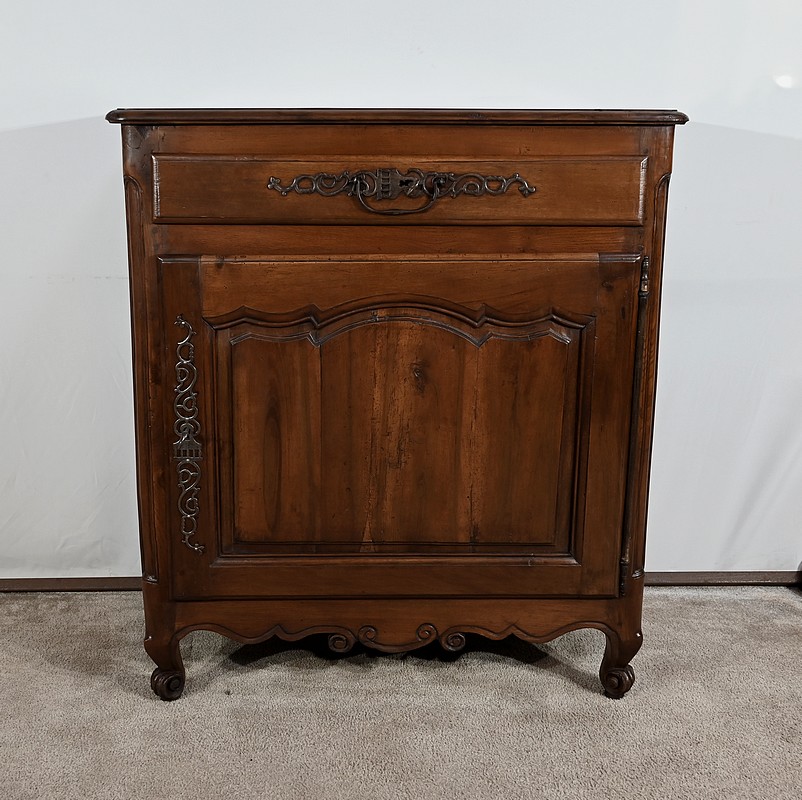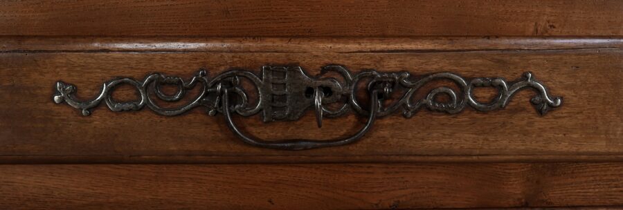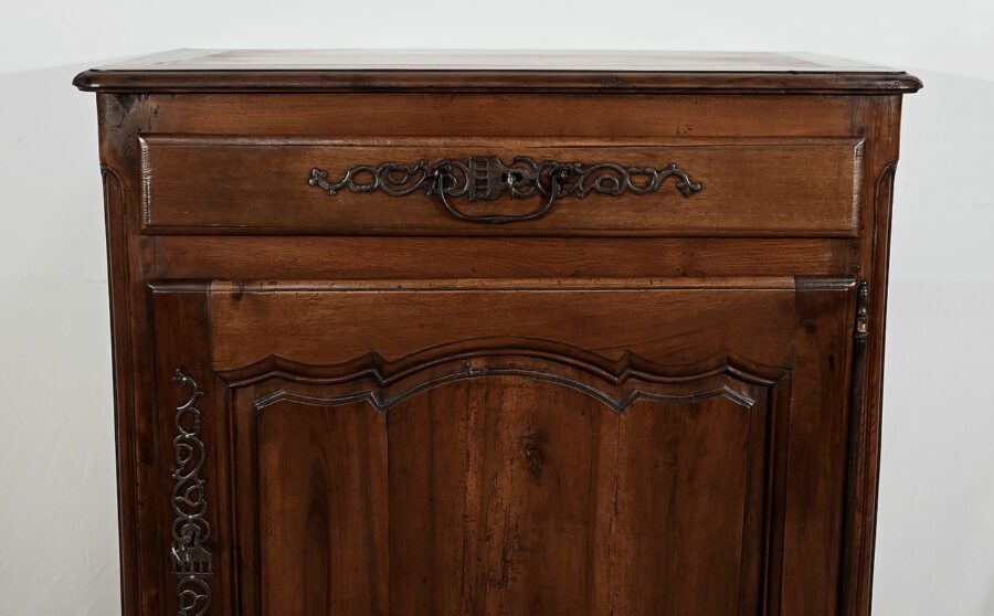 Grand confiturier en noyer massif issu de la région de la Vienne, composé d’une large porte à encadrement moulurée en partie extérieure et intérieure. Celle-ci est flanquée d’un panneau à platebande et d’un carré. Cette porte est également dotée d’un gond en fer avec deux points d’attache. La serrure et la clé sont d’origine, est accompagnées d’une importante entrée verticale en fer ajouré d’origine également. L’intérieur du meuble contient une étagère. Au dessus, nous retrouvons un tiroir en applique au pourtour arrondi. Au centre, celui-ci possède une poignée de tirage en fer. Une belle entrée découpée en fer d’origine souligne le passage de la clé d’origine. Les deux montants de ce confiturier sont arrondis, à défoncement et à moulurations. Ils se terminent par un pied escargot. En partie basse, une belle traverse légèrement découpée forme plusieurs volutes.