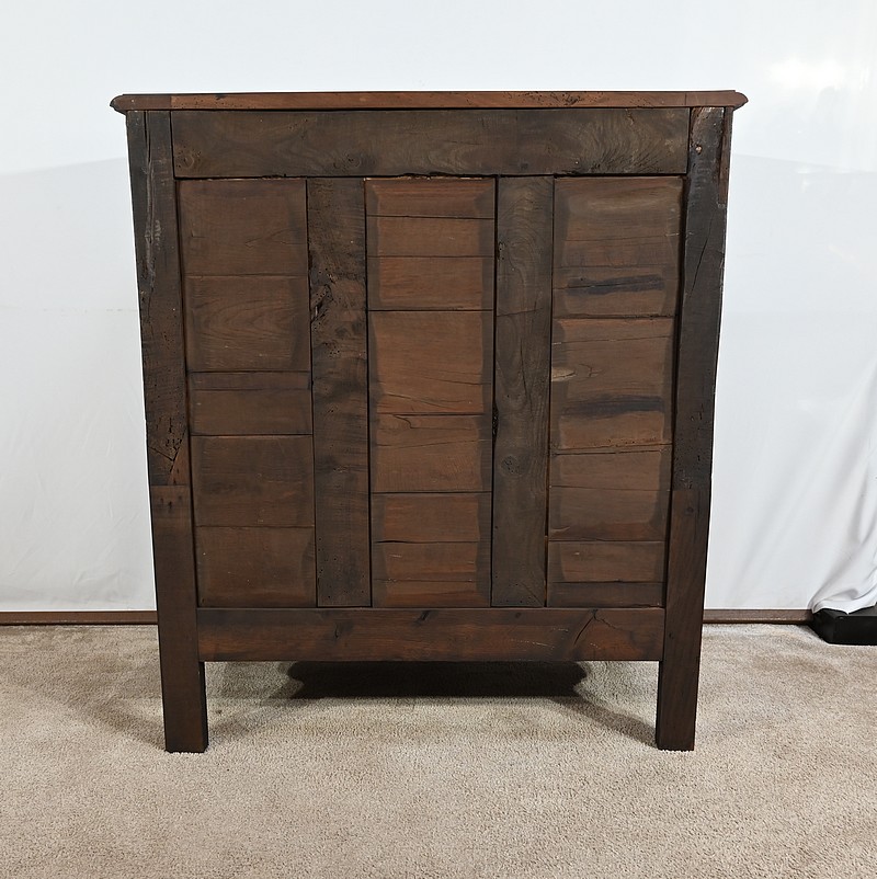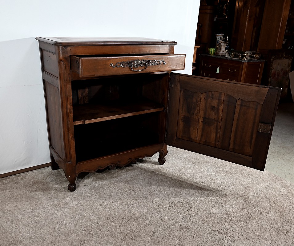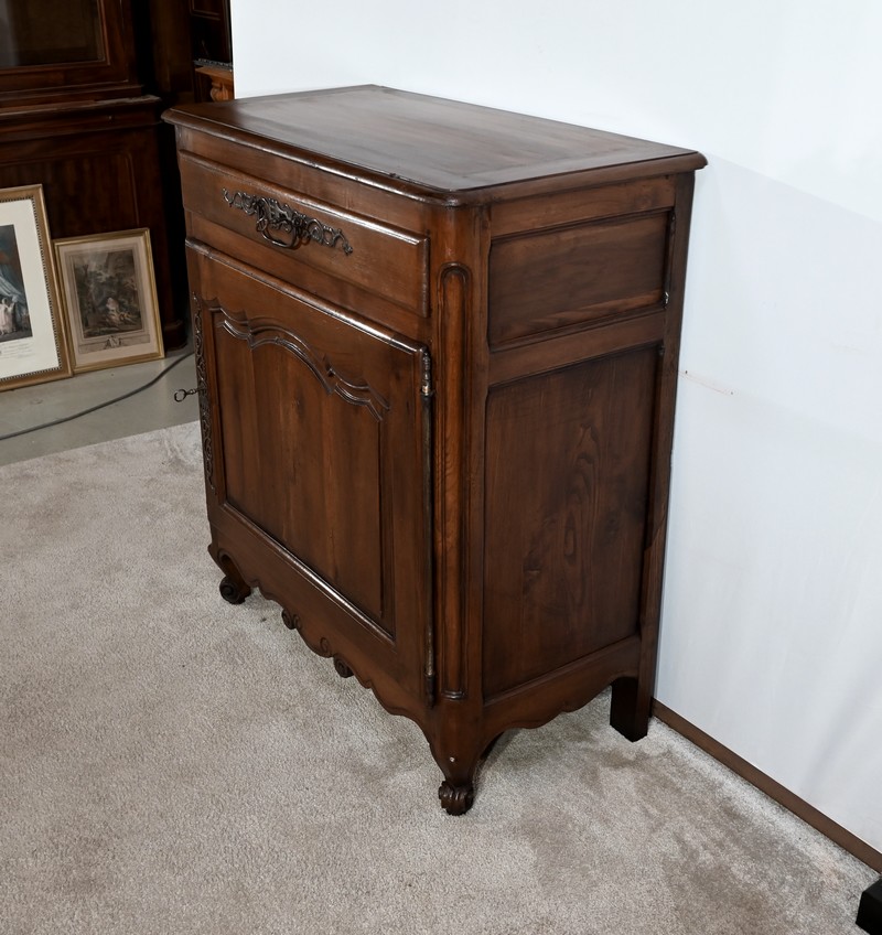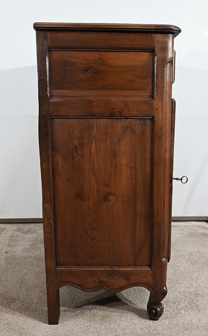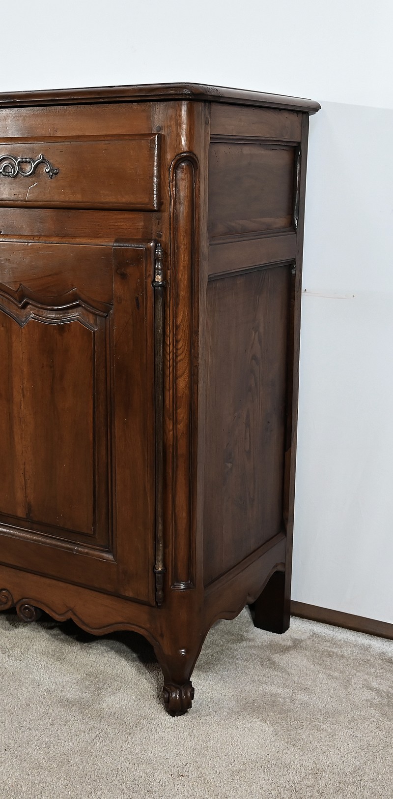 Grand confiturier en noyer massif issu de la région de la Vienne, composé d’une large porte à encadrement moulurée en partie extérieure et intérieure. Celle-ci est flanquée d’un panneau à platebande et d’un carré. Cette porte est également dotée d’un gond en fer avec deux points d’attache. La serrure et la clé sont d’origine, est accompagnées d’une importante entrée verticale en fer ajouré d’origine également. L’intérieur du meuble contient une étagère. Au dessus, nous retrouvons un tiroir en applique au pourtour arrondi. Au centre, celui-ci possède une poignée de tirage en fer. Une belle entrée découpée en fer d’origine souligne le passage de la clé d’origine. Les deux montants de ce confiturier sont arrondis, à défoncement et à moulurations. Ils se terminent par un pied escargot. En partie basse, une belle traverse légèrement découpée forme plusieurs volutes.