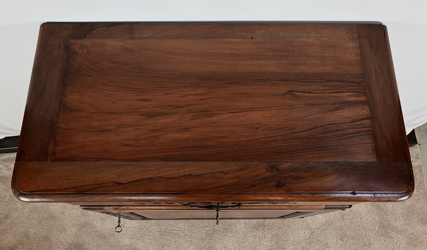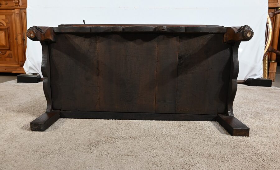 Le dessus comporte un encadrement mouluré foncé d’un panneau de noyer.
