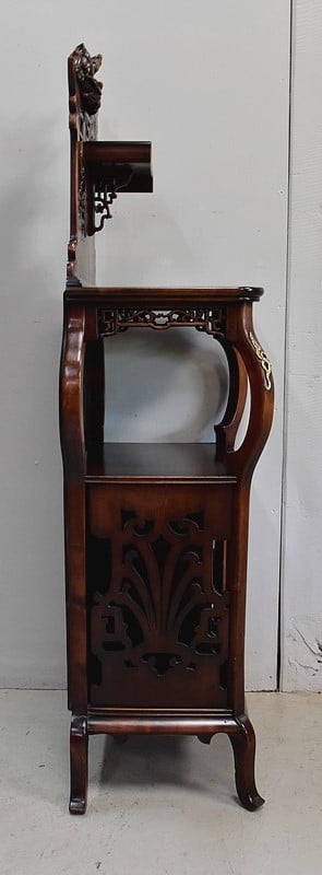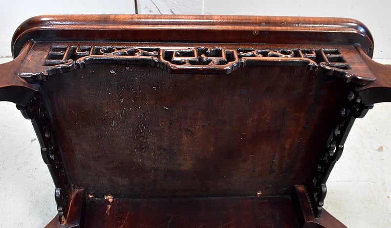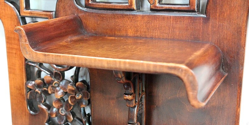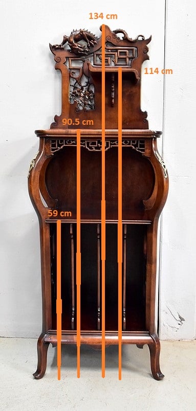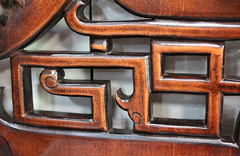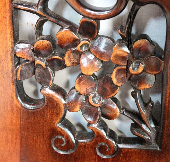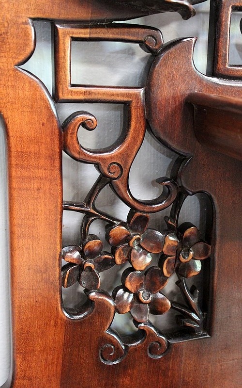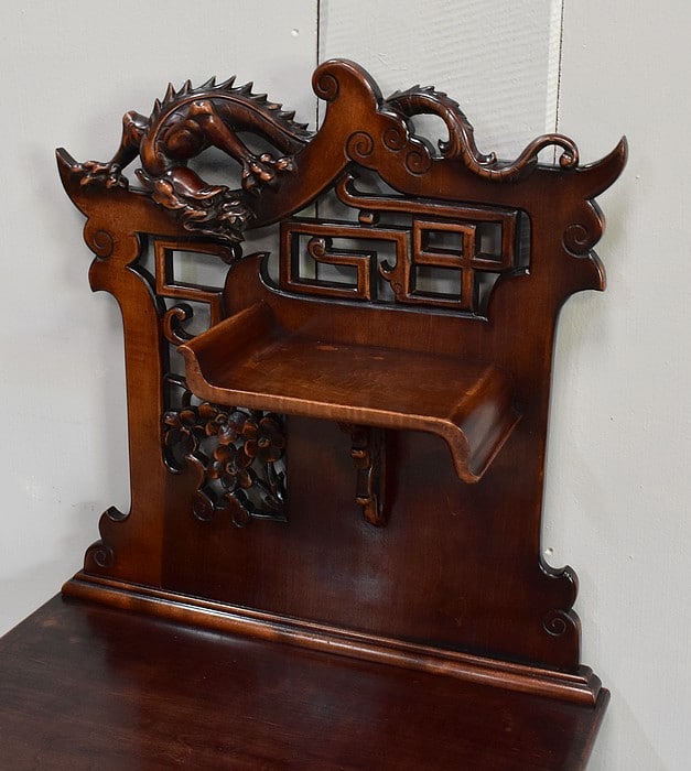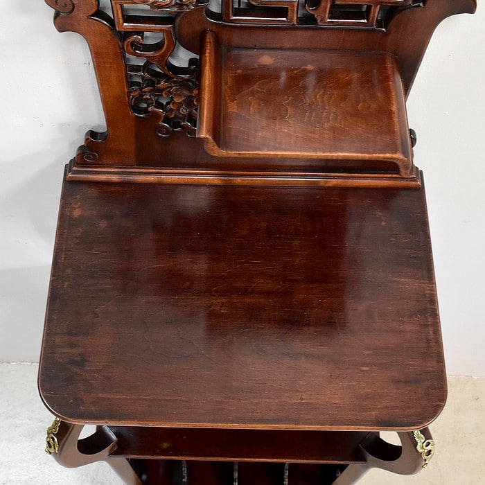 Il se compose en partie haute d’un panneau ajouré, sculpté de Décors caractéristiques de l’Art Asiatique, tels une créature Reptilienne imaginaire et un regroupement de fleurs. Ce fond sert également de support à une petite tablette, dont les côtés ont été taillés en opposition l’un de l’autre.