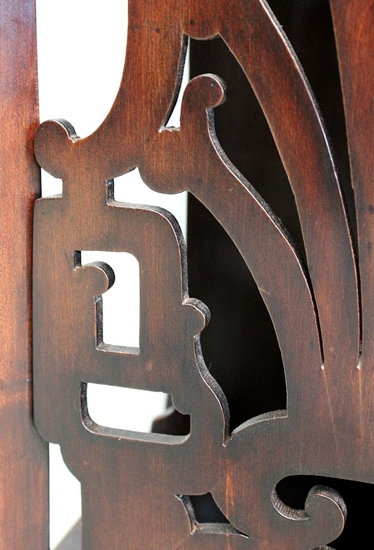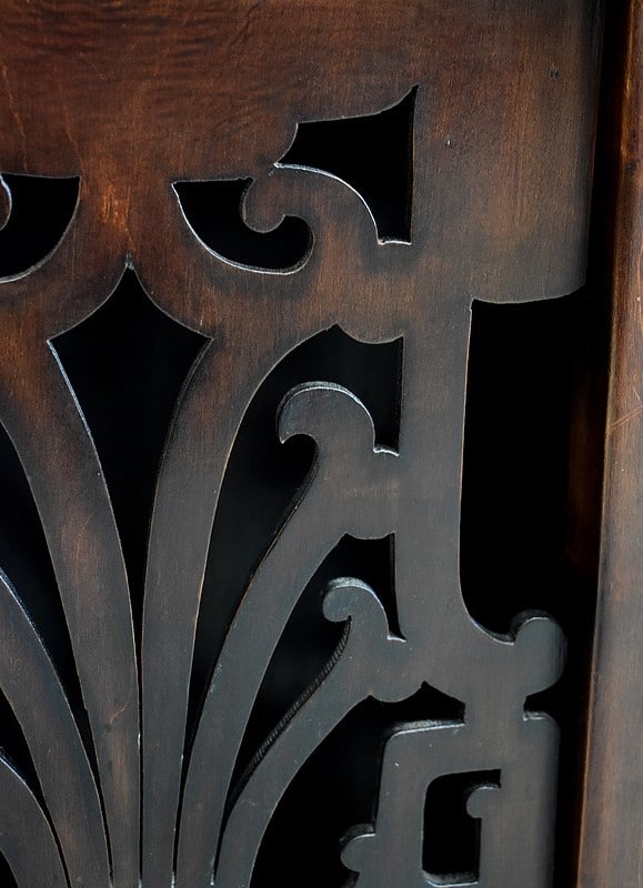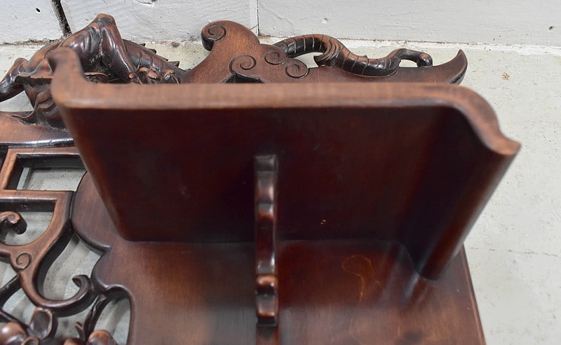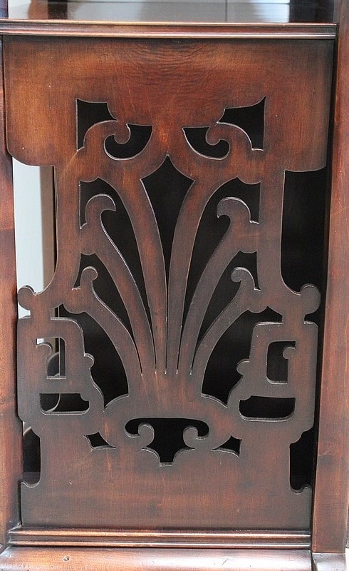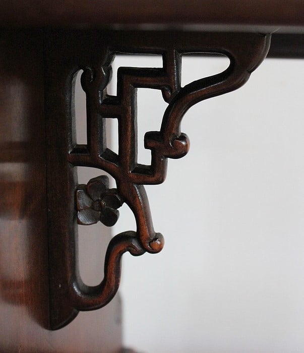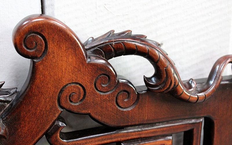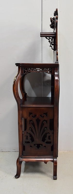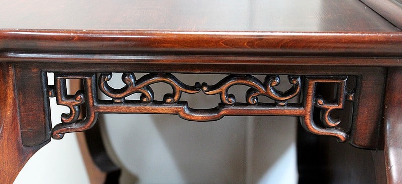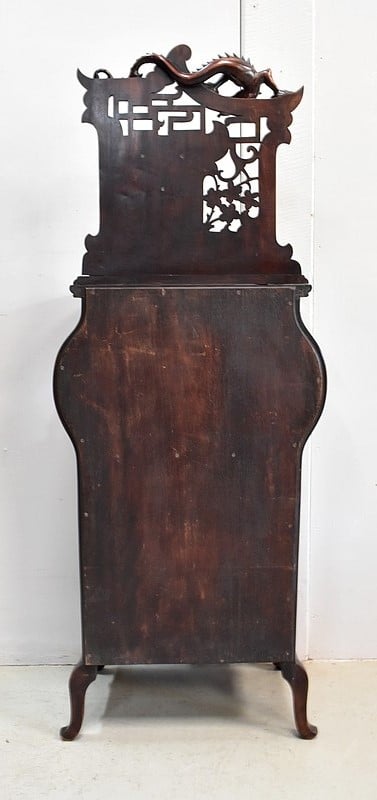 Il se compose en partie haute d’un panneau ajouré, sculpté de Décors caractéristiques de l’Art Asiatique, tels une créature Reptilienne imaginaire et un regroupement de fleurs. Ce fond sert également de support à une petite tablette, dont les côtés ont été taillés en opposition l’un de l’autre.