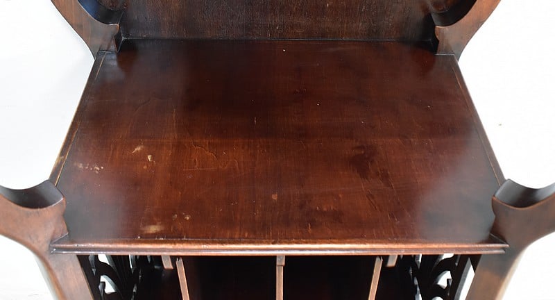 En dessous, ce meuble offre deux plateaux intermédiaires, reliés entre eux par des montants débordants et convexes. Ceux de l’avant, en Angles, sont agrémentés d’animaux ailés en Bronze. Les pourtours supérieurs de cette niche ouverte ainsi formée sont enjolivés de Galeries en Hêtre ajouré.