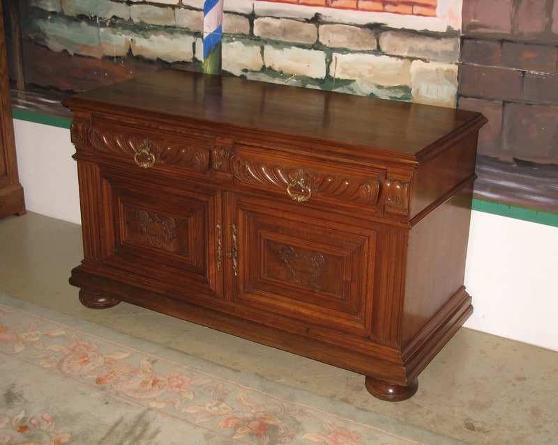 Petit meuble bas de style néo-gothique en noyer, ouvrant par 2 portes et 2 tiroirs avec poignées de tirage et fermant à clé par système central.