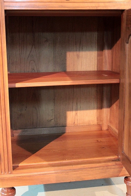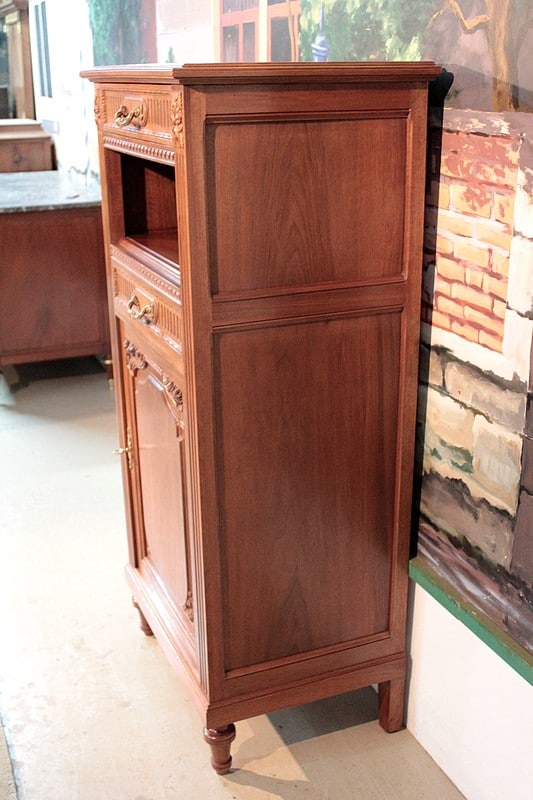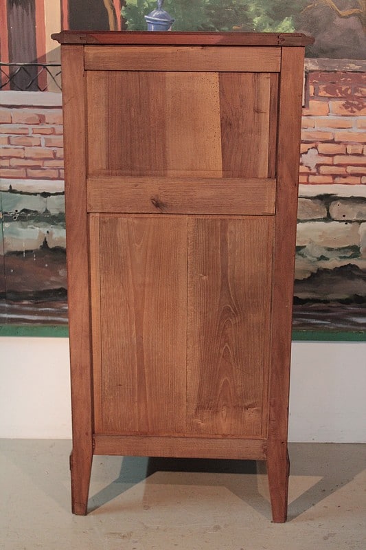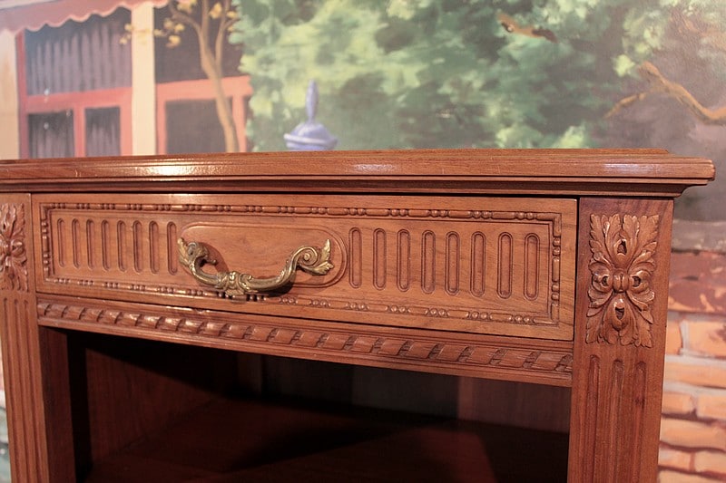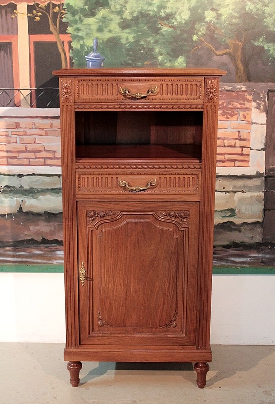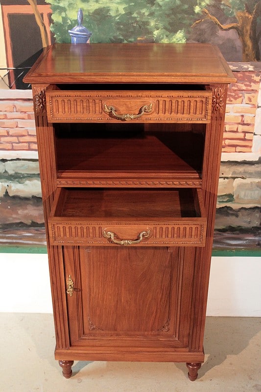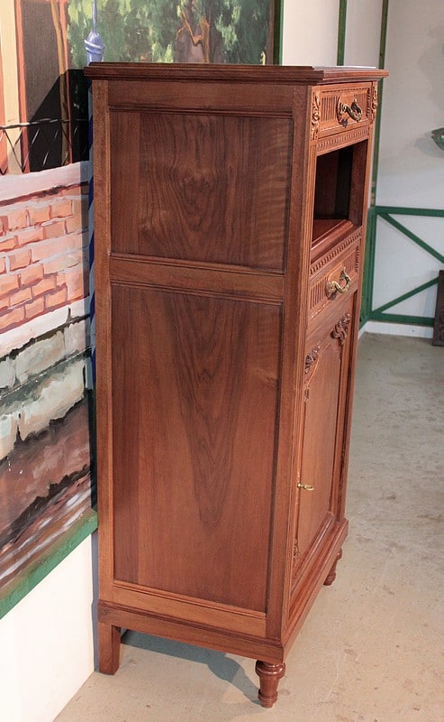 Petit meuble haut d’appui en noyer dans le goût Louis XVI. Il ouvre par 2 tiroirs et une niche en partie haute et par 1 porte en partie basse. Son intérieur est garni d’une étagère. Il repose sur des pieds avants ‘toupie’ et des pieds arrières droits. Montants et façades de tiroirs à cannelures.