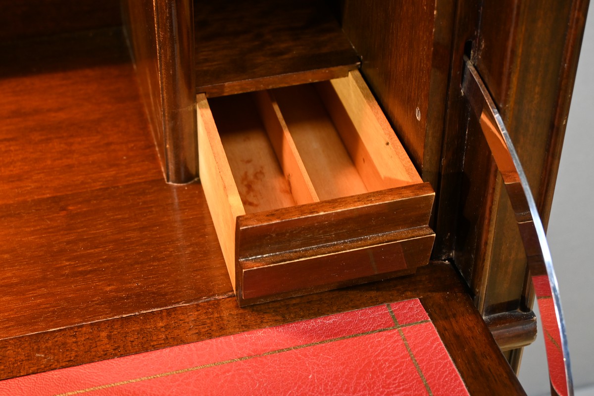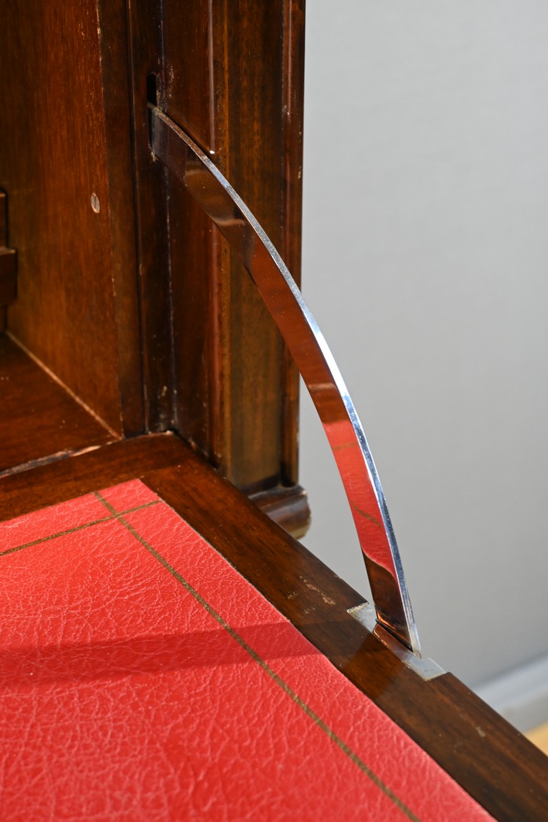 Un secrétaire avec un système d’éclairage intégré qui s’active à l’ouverture de l’abattant, recouvert de cuir rouge, ajoutant une touche de luxe.