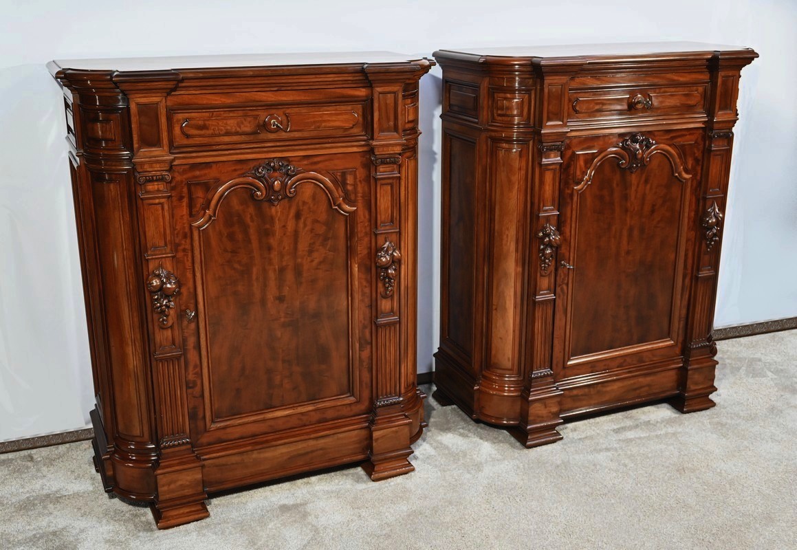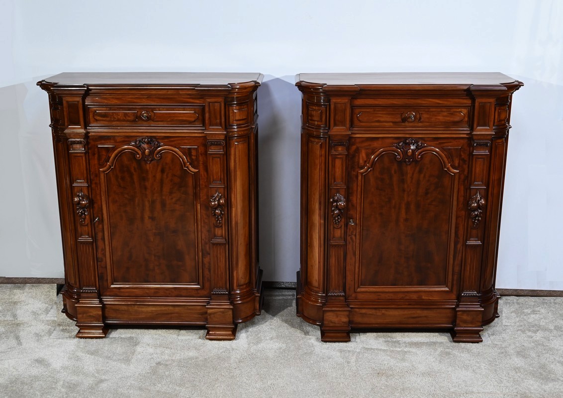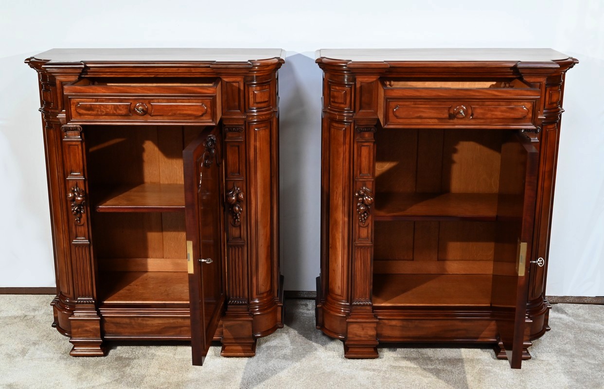 Paire de meubles d’appui en acajou de fabrication parisienne identique et richement sculptés.