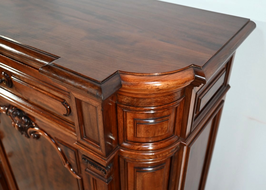 En dessous, une porte à cadre, avec moulurations intérieures, volutes et motifs sculptés, est également équipée d’une serrure d’origine en état de fonctionnement.