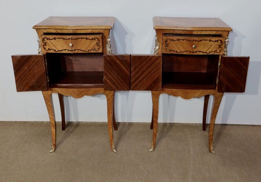 Belle paire de petits meubles en marqueterie de bois de rose et d’amarante, galbés en façade et sur les côtés, rappelant la forme tombeau typique des meubles Louis XV.