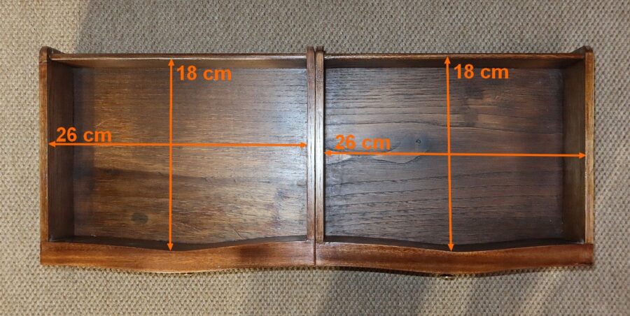 Ses portes s’ouvrent par deux petits gonds en laiton en relief et des boutons lentilles.