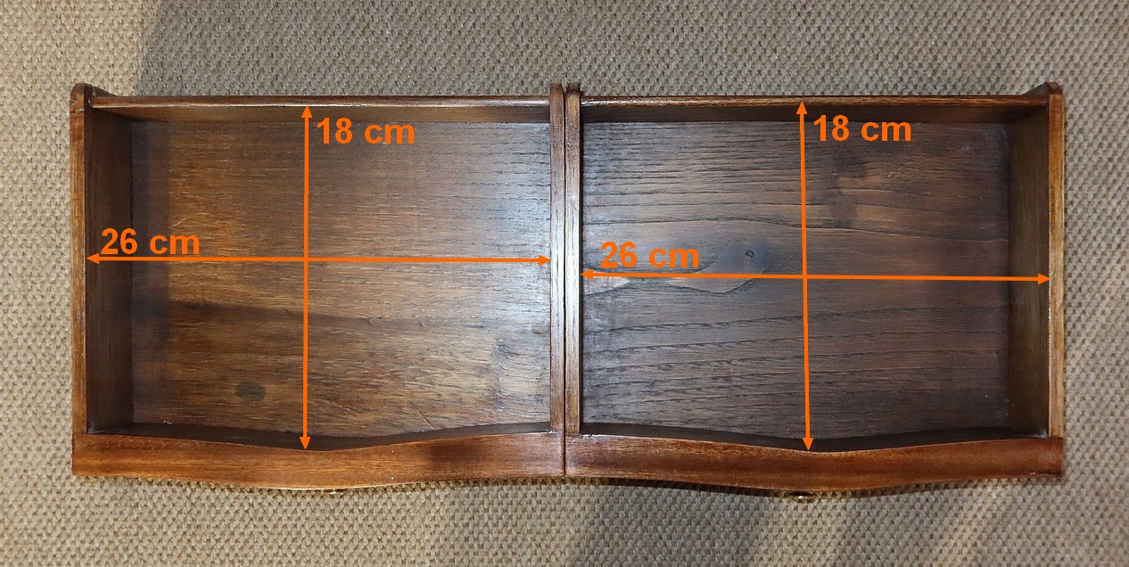 En dessous deux petites portes galbées dans les 2 sens ont un placage identique au tiroir, avec festonnage, ruban de volutes et placage de bois de rose.