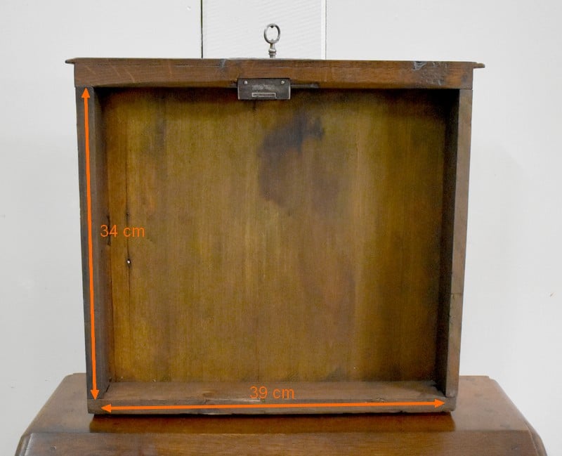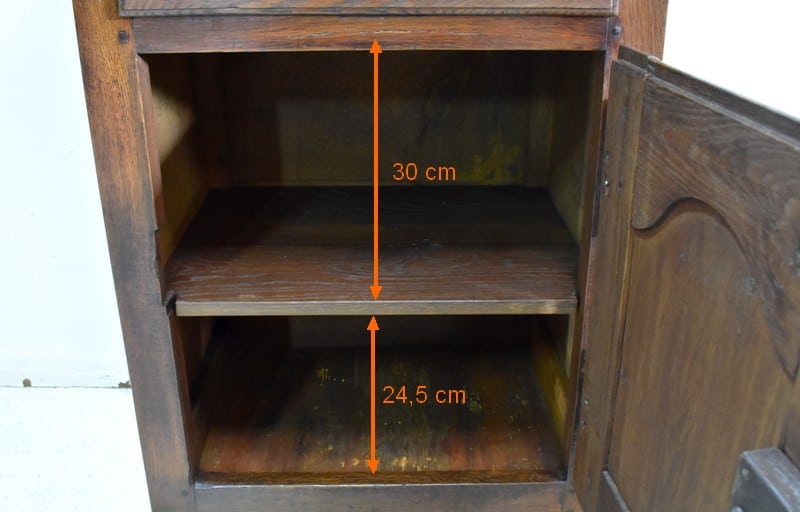 En dessous, il propose une Petite porte avec panneau central en retrait, et encadrement Mouluré en, chapeau de Gendarme sur la traverse haute. Elle révèle deux compartiments de rangement formés par la présence d’une étagère amovible.
