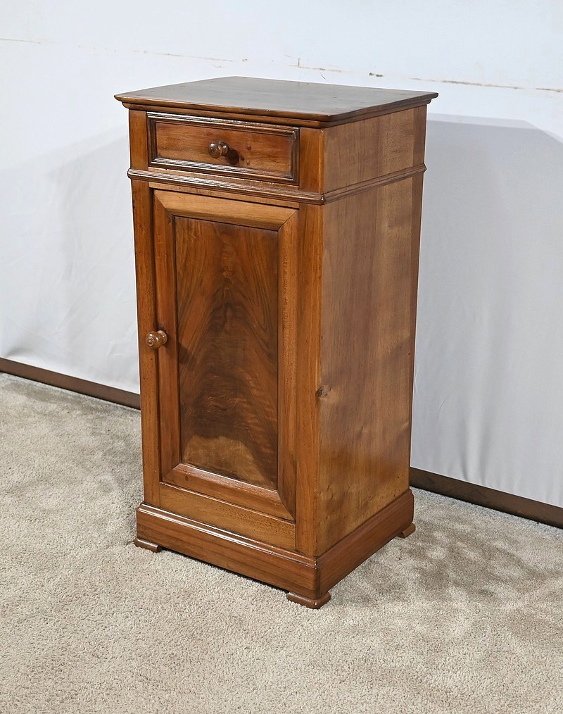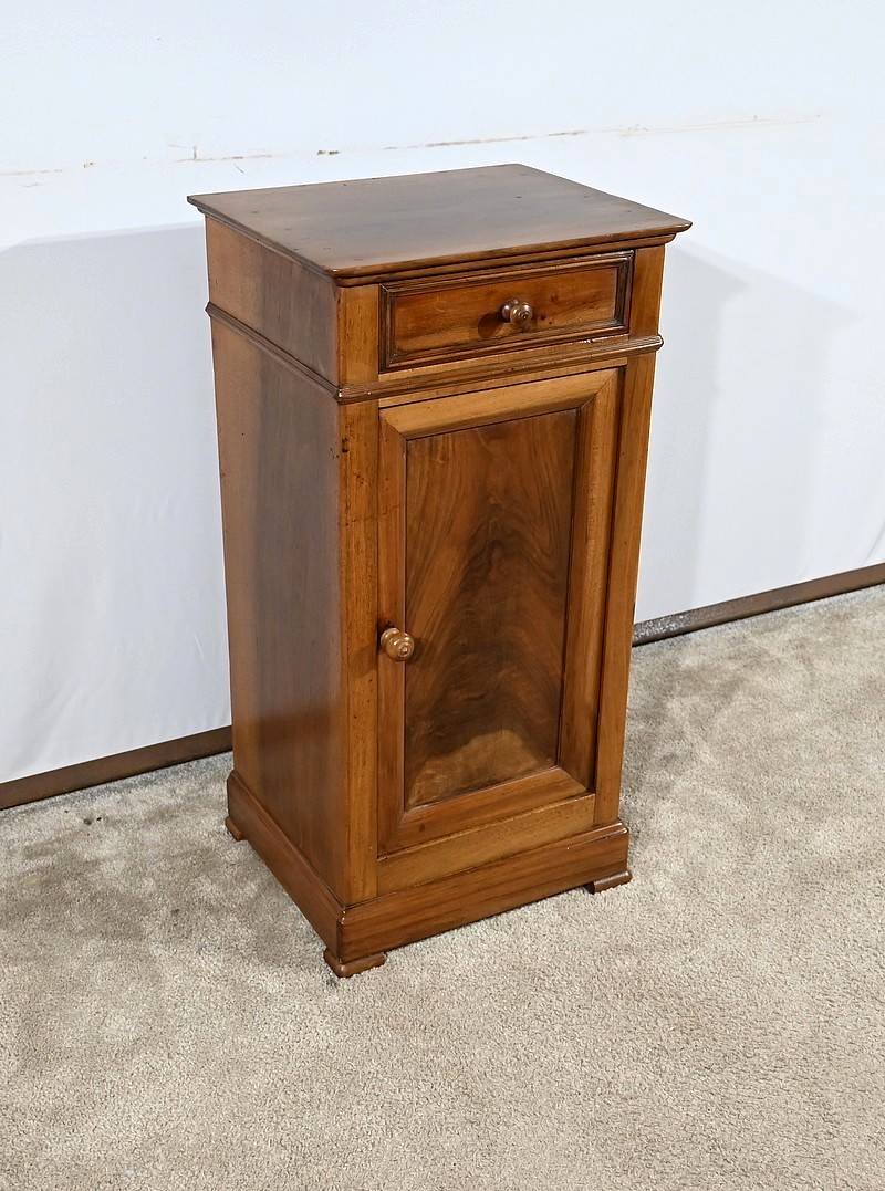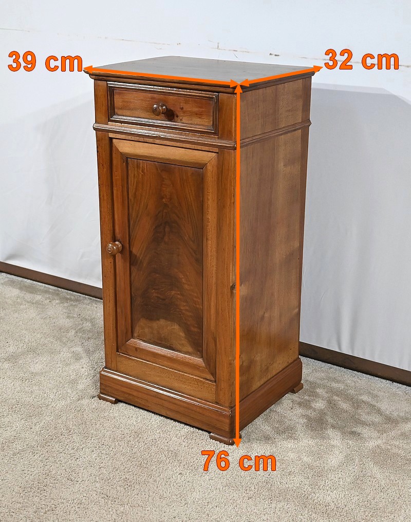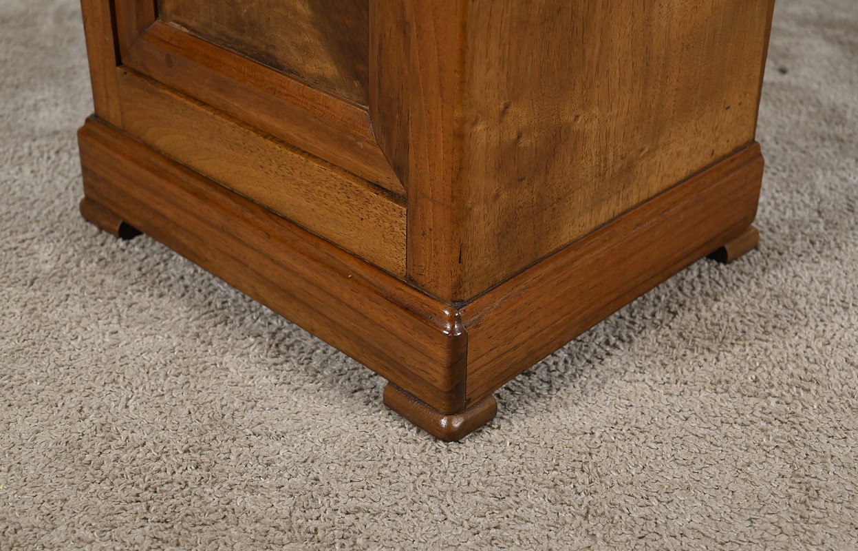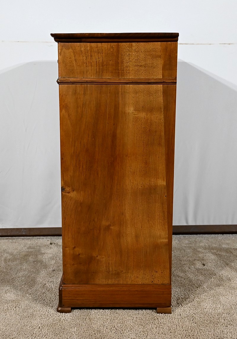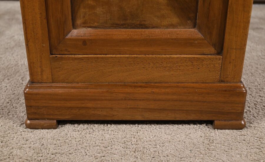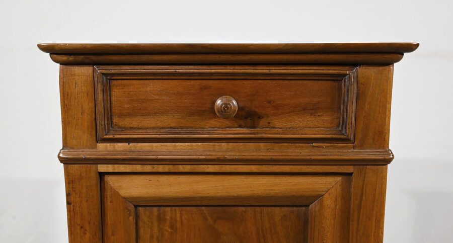 Ce meuble en noyer massif est composé d’une porte avec encadrement à coupe d’onglet possédant un intérieur chanfreiné et est foncé d’un seul panneau en ronce de noyer.