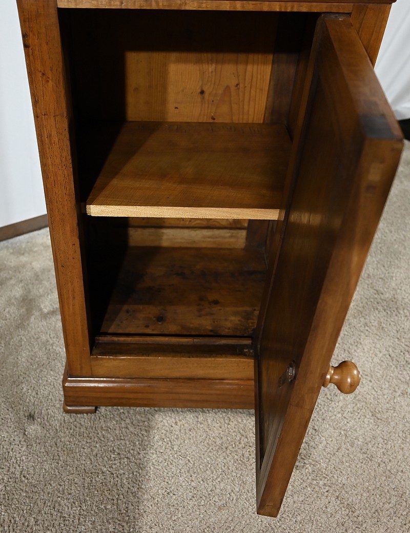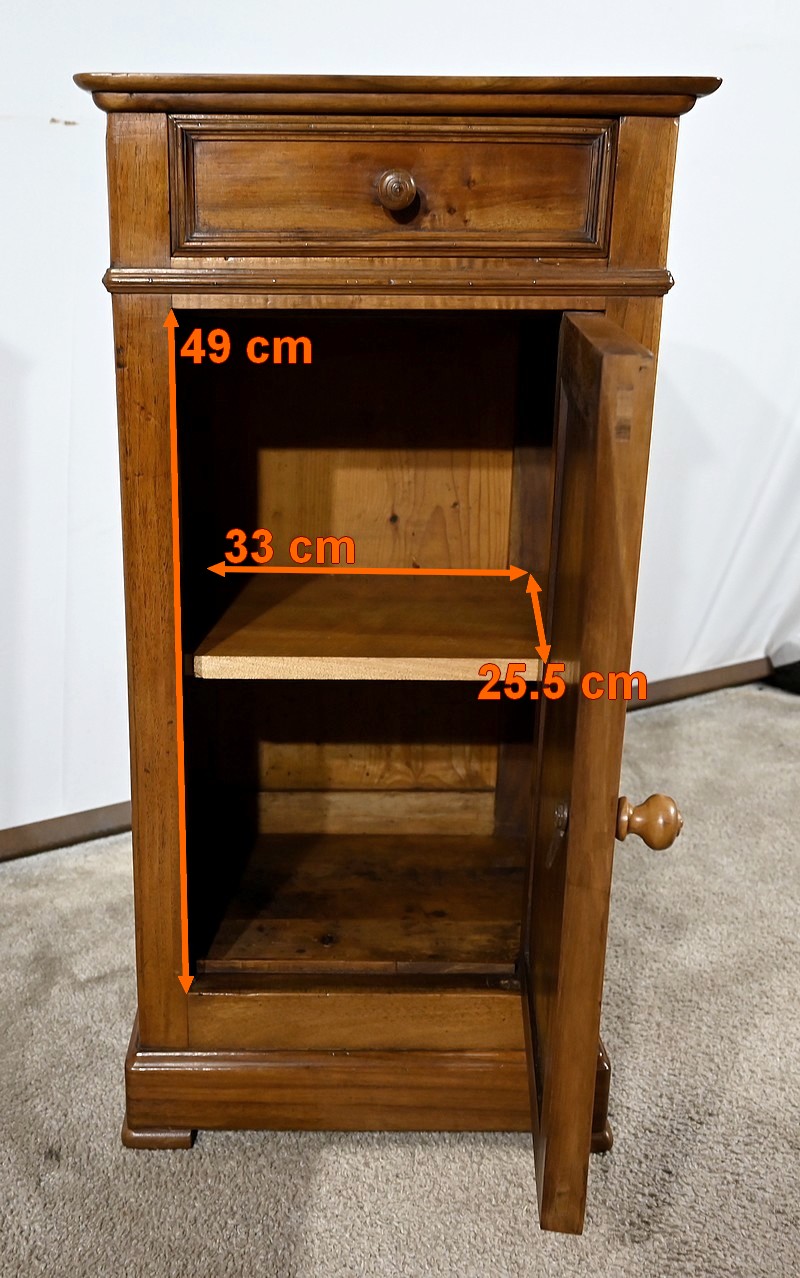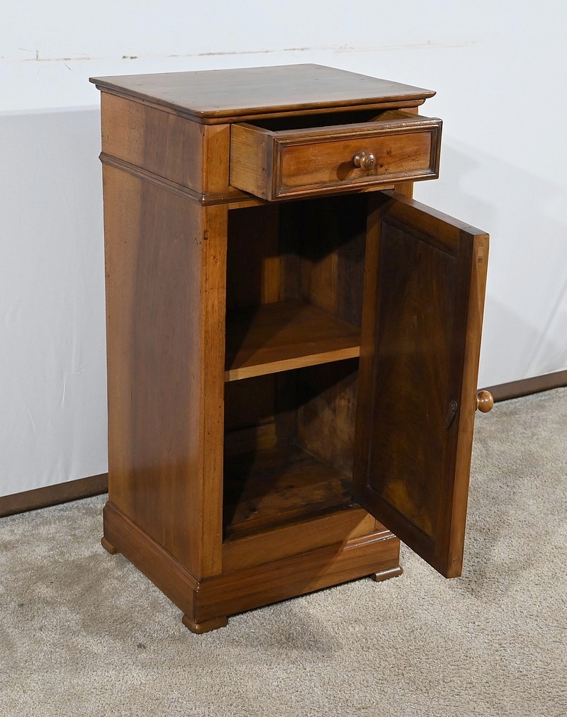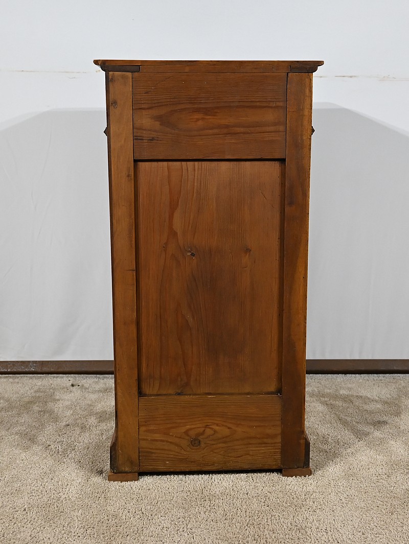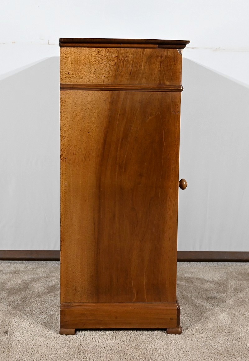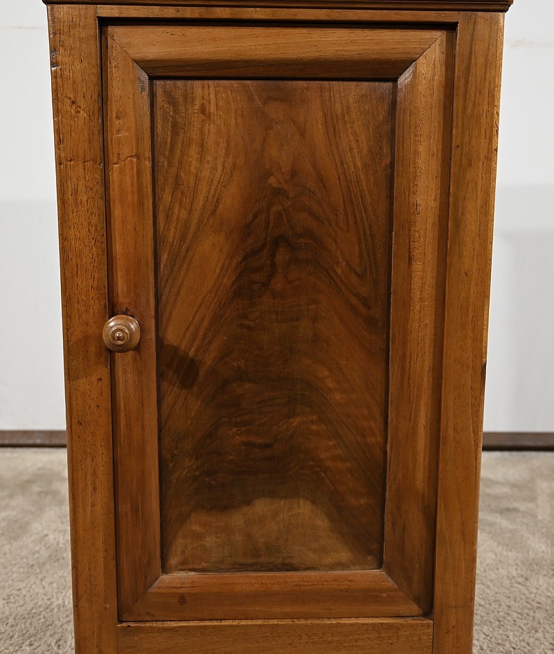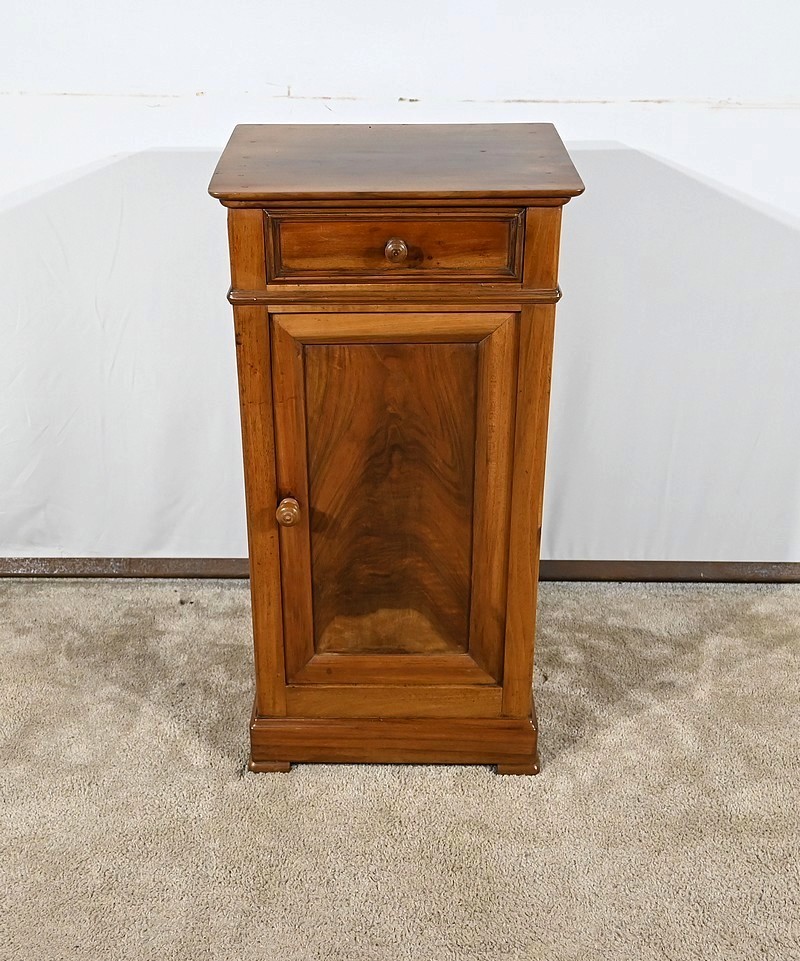 Ce meuble en noyer massif est composé d’une porte avec encadrement à coupe d’onglet possédant un intérieur chanfreiné et est foncé d’un seul panneau en ronce de noyer.