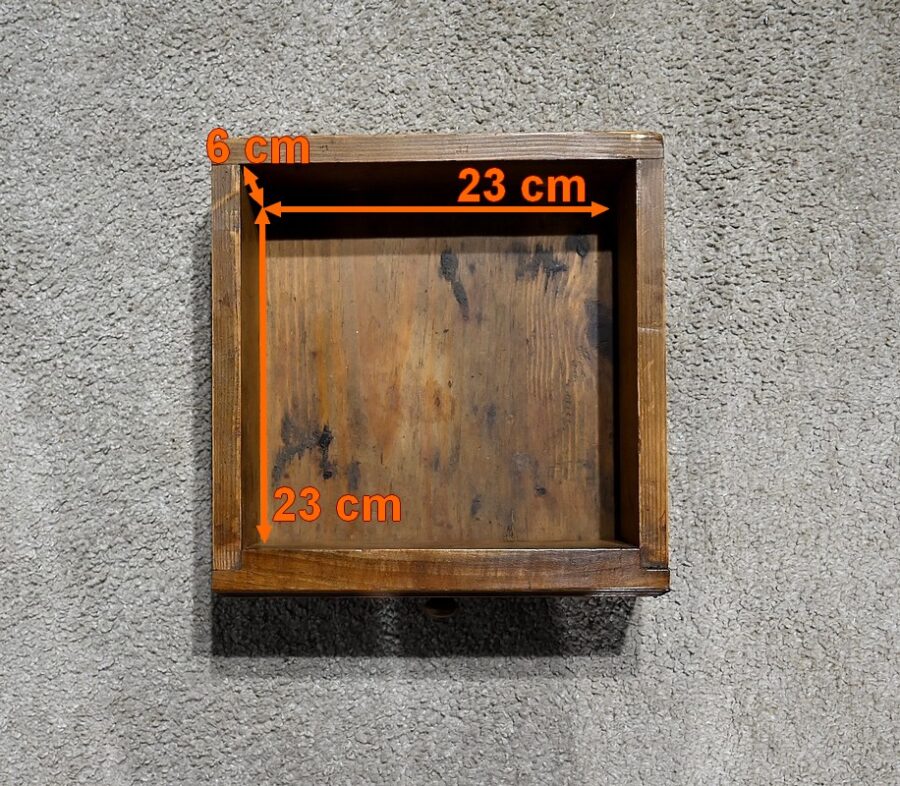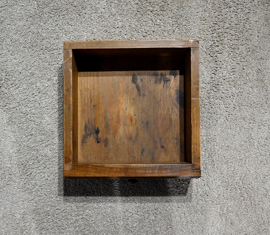 Cette porte est agrémentée d’un bouton bois avec fermoir fer. A l’intérieur nous découvrons une étagère. Au dessus un tiroir est muni d’une moulure et d’un bouton bois. La plinthe est légèrement en saillie avec une gorge sur le devant.