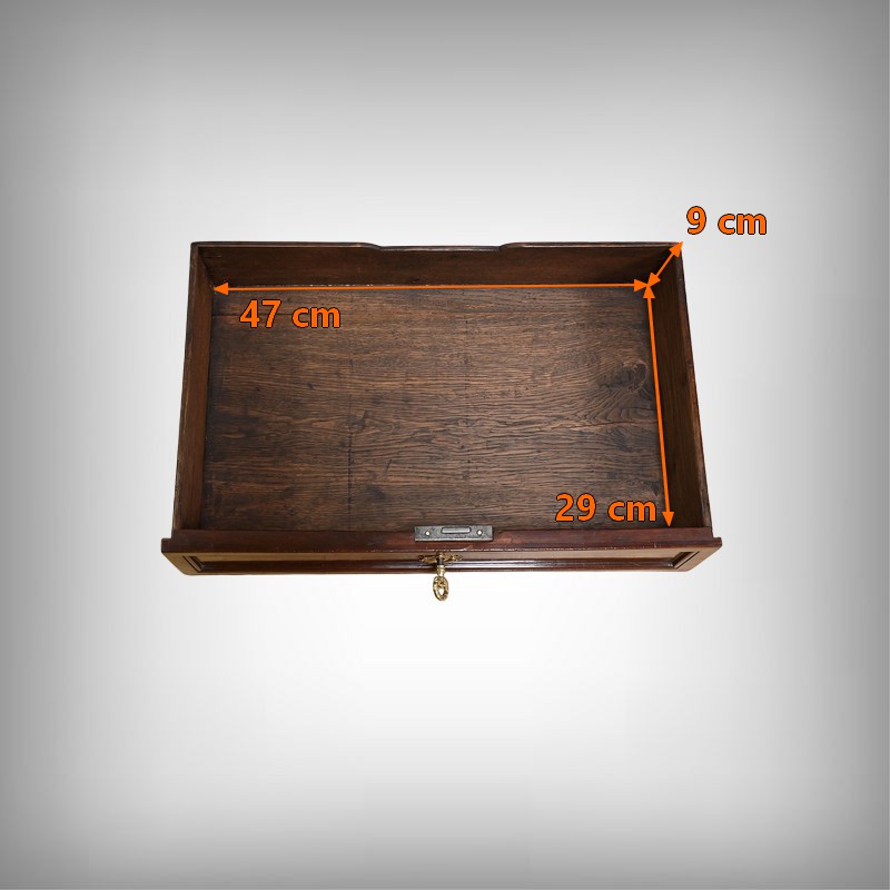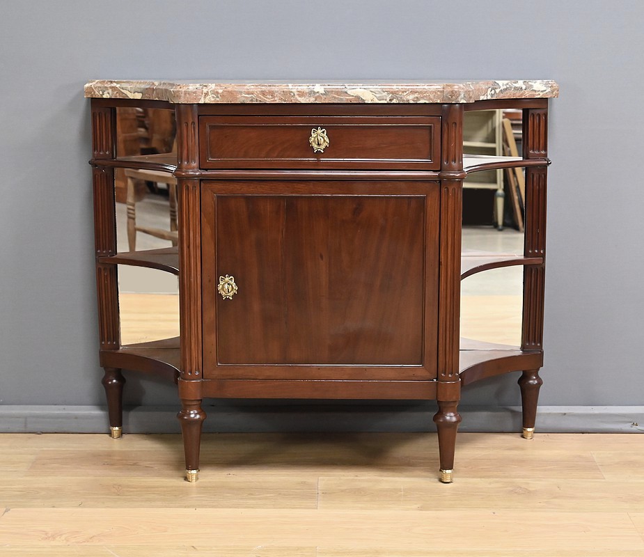 Ce ravissant petit meuble desserte en acajou de style Louis XVI, datant du XIXe siècle, séduit par l’élégance de ses lignes et la richesse de ses détails. Il est sommé d’un épais marbre Brèche de Bohème, sculpté d’une gorge périphérique qui souligne les formes du meuble. Ce dernier est muni de côtés concaves et d’angles avant arrondis, conférant à l’ensemble une silhouette douce et harmonieuse. Ce meuble est muni d’un tiroir et d’une porte, tous deux ornés d’une entrée enrubannée en bronze doré, typique du style Louis XVI. Une clé ouvragée accompagne la serrure, qui est en parfait état de fonctionnement.