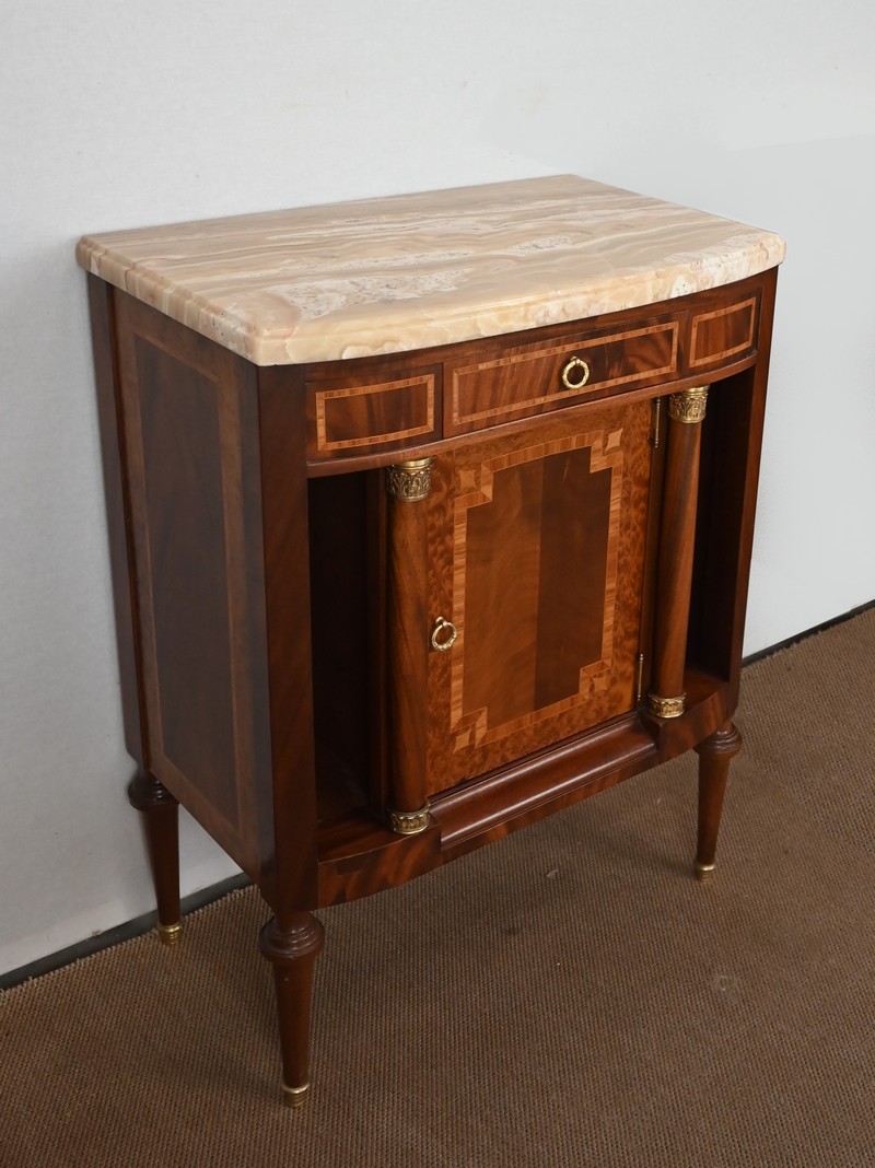 Petit meuble, à façade légèrement galbée, sommé d’un marbre épais à gorge.
