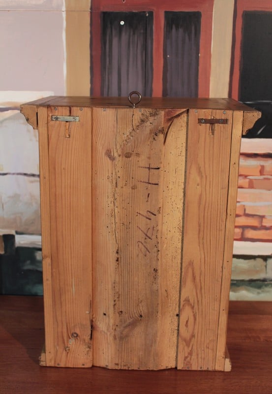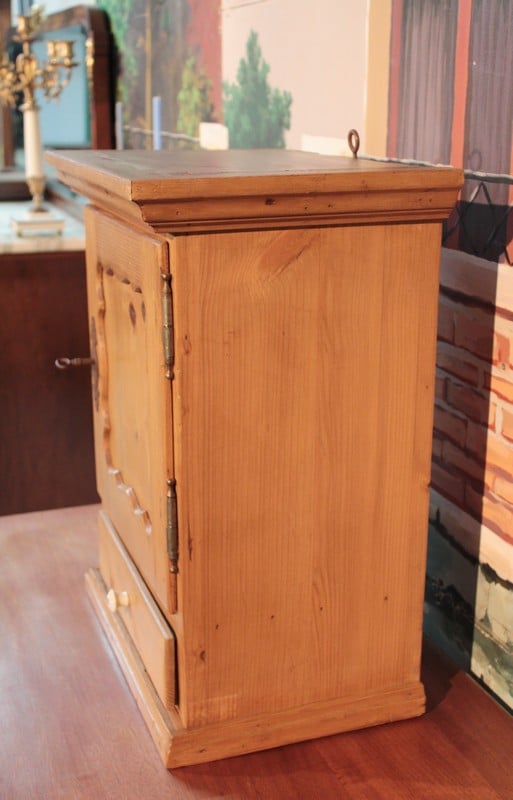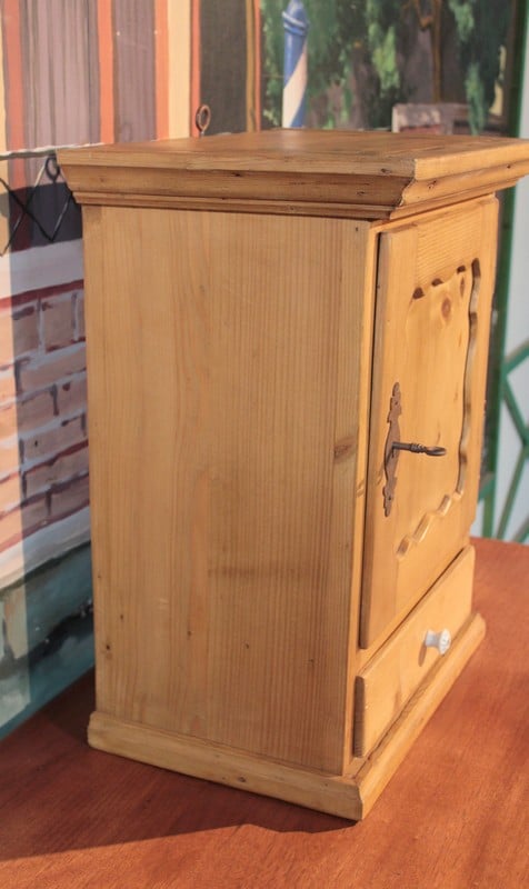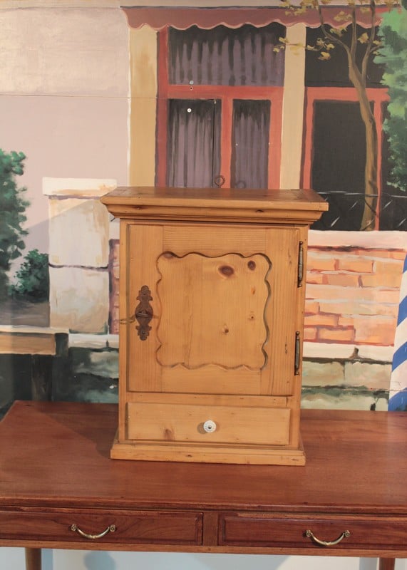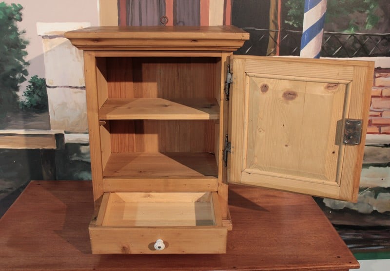 Petit meuble en pin à poser ou suspendre ouvrant par une porte et un tiroir avec bouton de porcelaine blanche. Époque 1920.