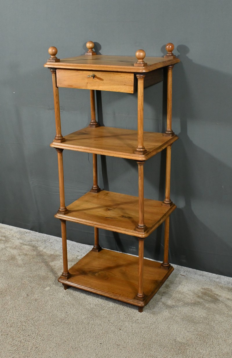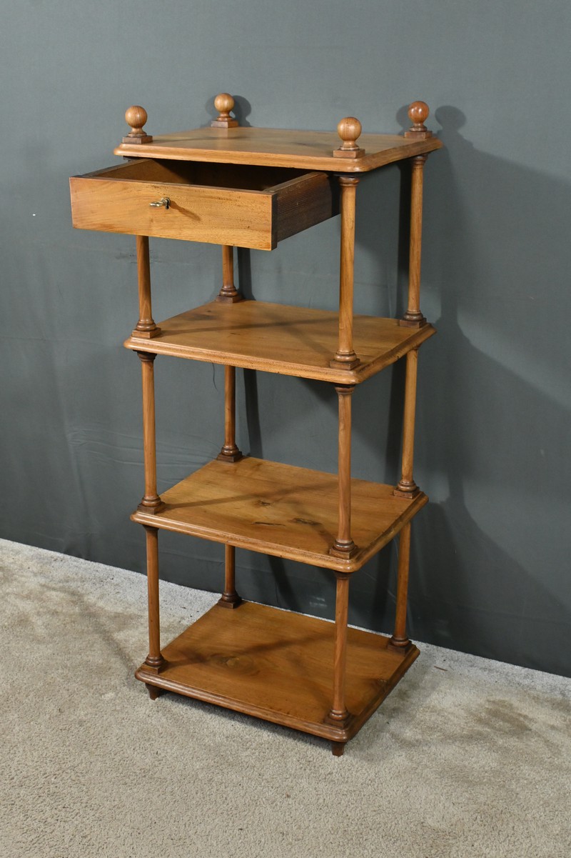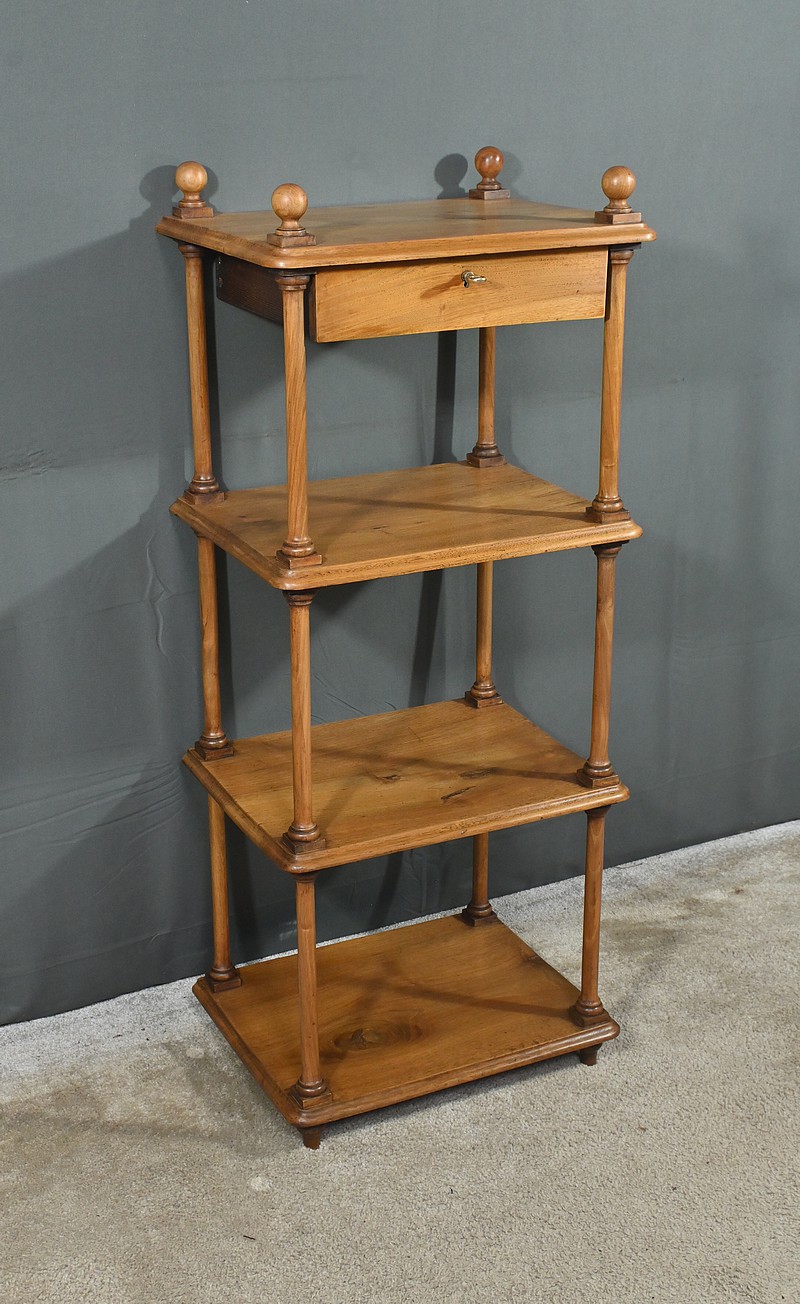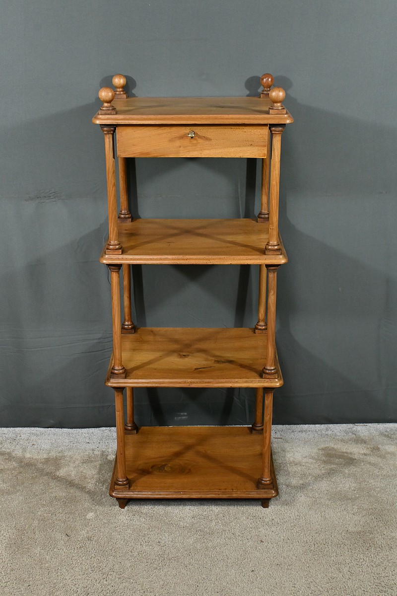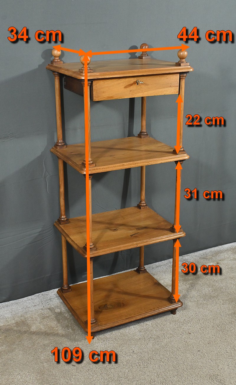 Découvrez ce charmant petit meuble étagère daté des années 1900. Ce meuble intemporel et fonctionnel apportera une touche d’authenticité à votre intérieur. Fabriqué en noyer massif, ce meuble est composé de quatre niveaux, dont trois étagères ouvertes et un tiroir situé sous le plateau supérieur. Chaque coin du plateau supérieur est orné d’une boule en bois et les étagères sont soutenues par des colonnettes tournées en bois, qui confèrent au meuble une allure classique. Le tiroir est équipé d’une petite clé laiton accompagné de sa serrure fonctionnelle. Grâce à son design compact et polyvalent, il s’intégrera parfaitement dans divers espaces de votre maison, que ce soit dans un salon, une chambre ou un bureau.