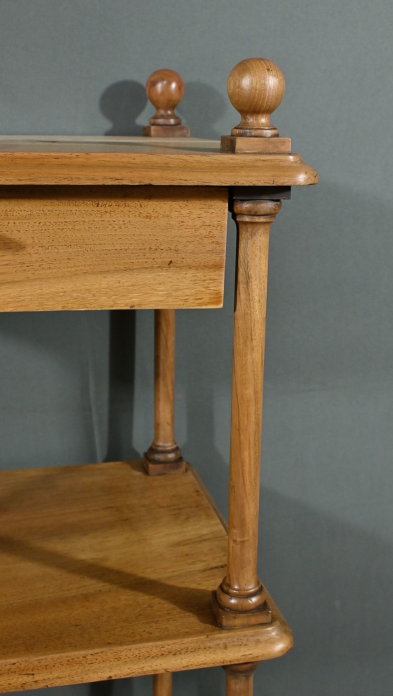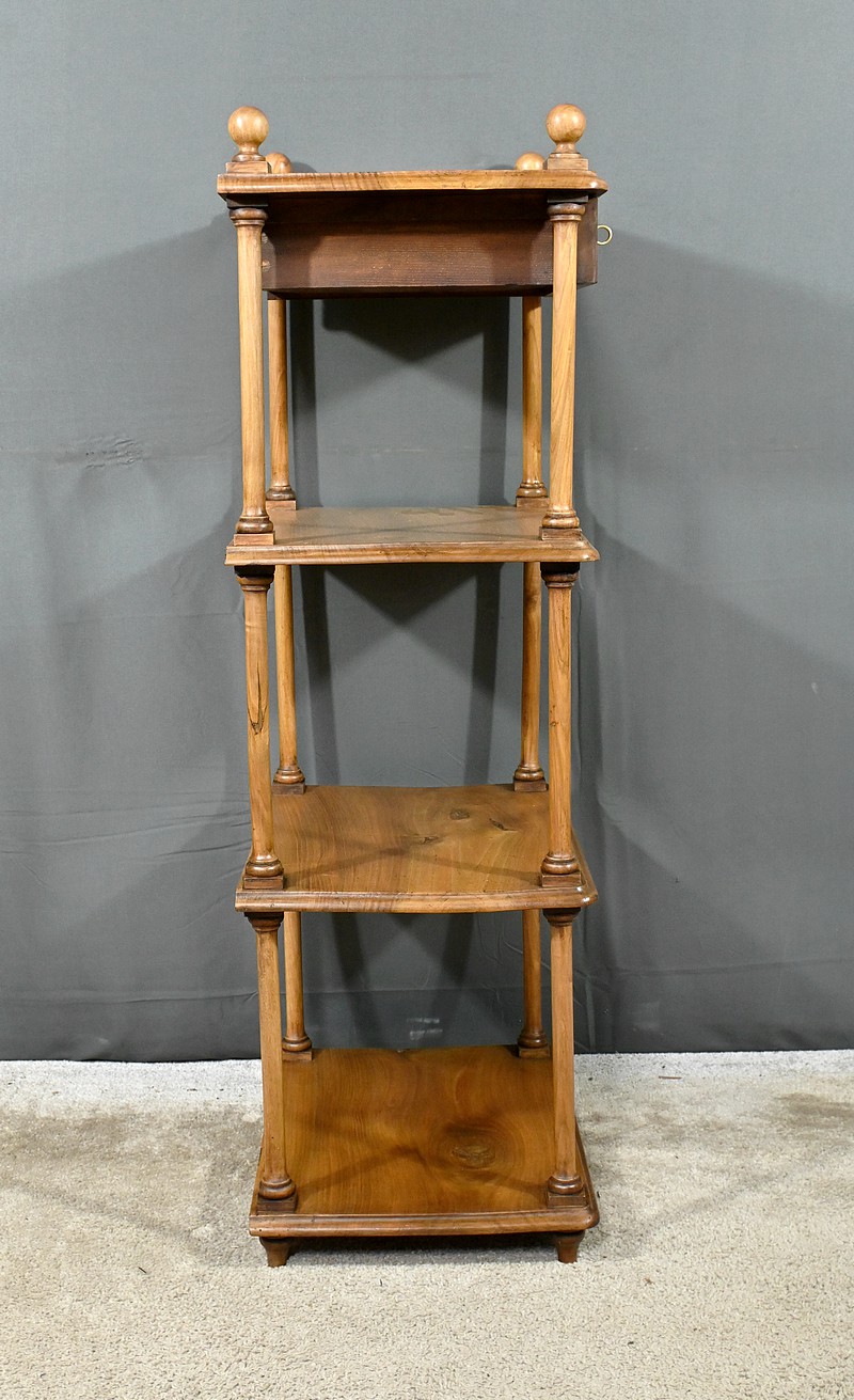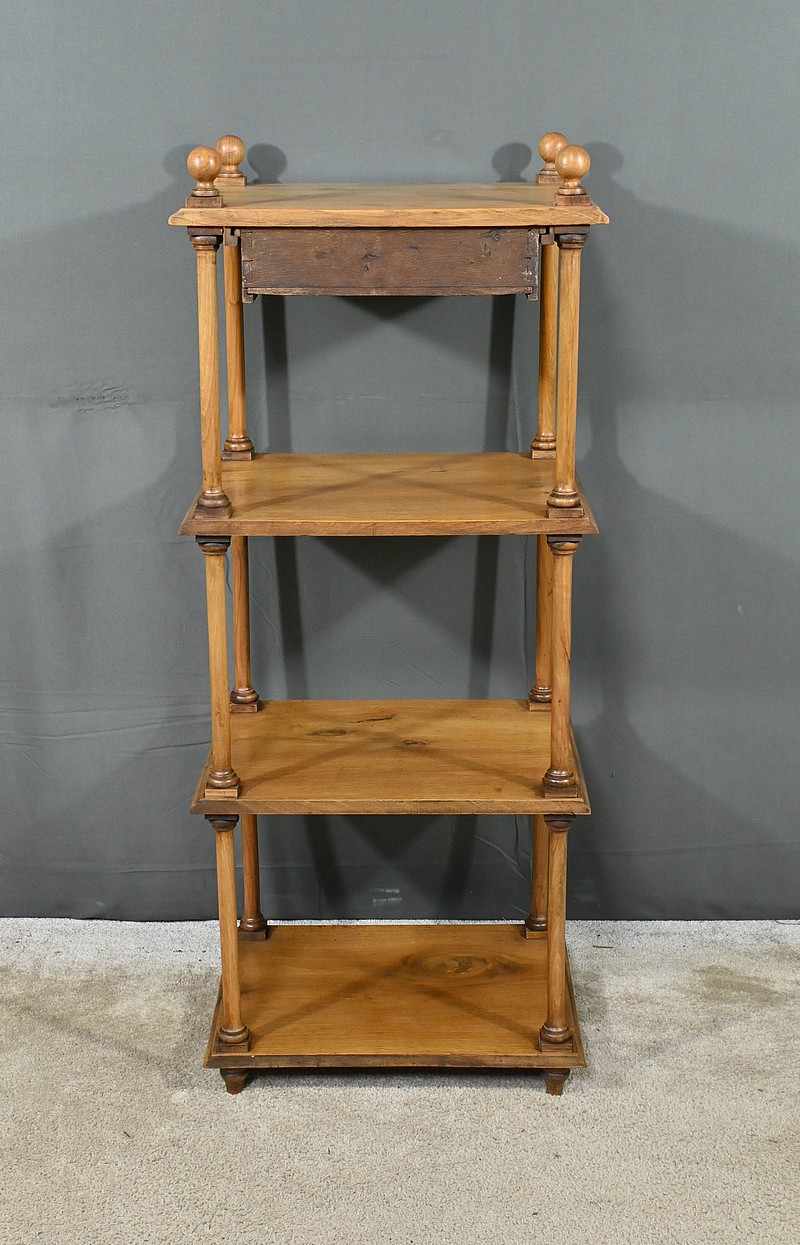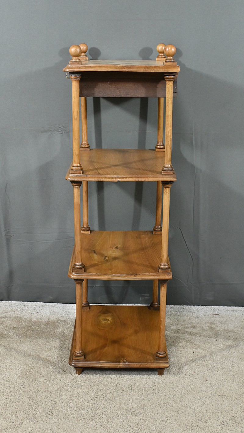 Découvrez ce charmant petit meuble étagère daté des années 1900. Ce meuble intemporel et fonctionnel apportera une touche d’authenticité à votre intérieur. Fabriqué en noyer massif, ce meuble est composé de quatre niveaux, dont trois étagères ouvertes et un tiroir situé sous le plateau supérieur. Chaque coin du plateau supérieur est orné d’une boule en bois et les étagères sont soutenues par des colonnettes tournées en bois, qui confèrent au meuble une allure classique. Le tiroir est équipé d’une petite clé laiton accompagné de sa serrure fonctionnelle. Grâce à son design compact et polyvalent, il s’intégrera parfaitement dans divers espaces de votre maison, que ce soit dans un salon, une chambre ou un bureau.