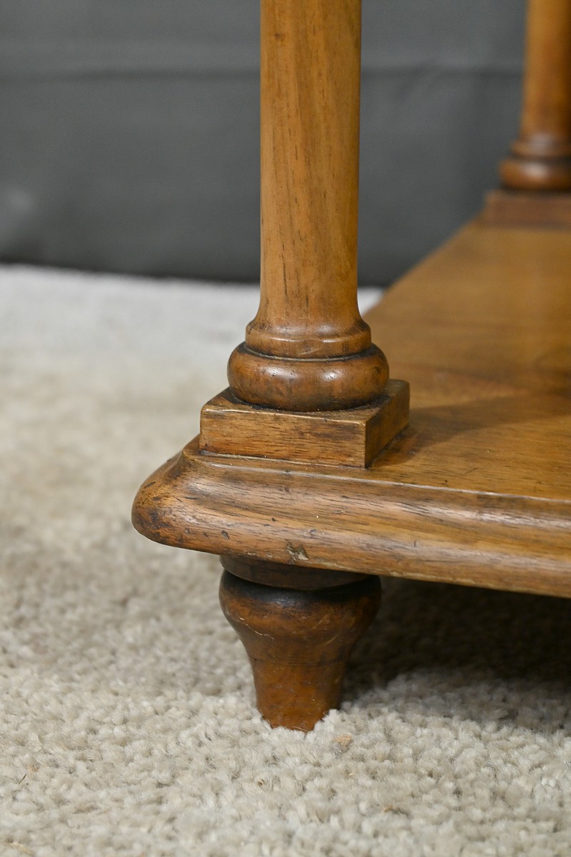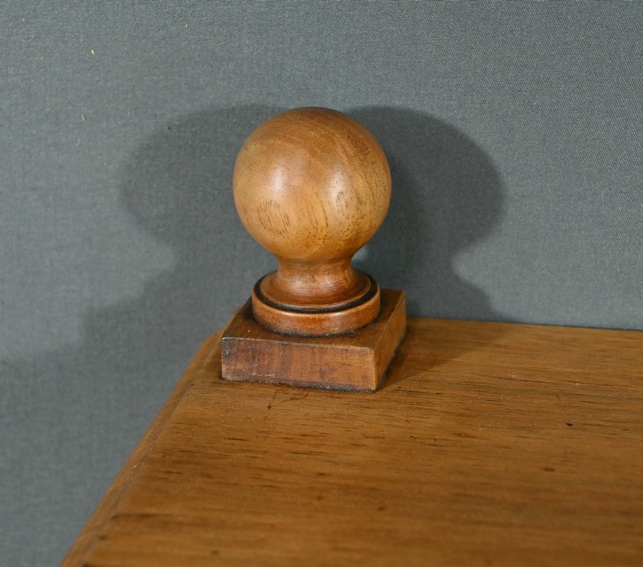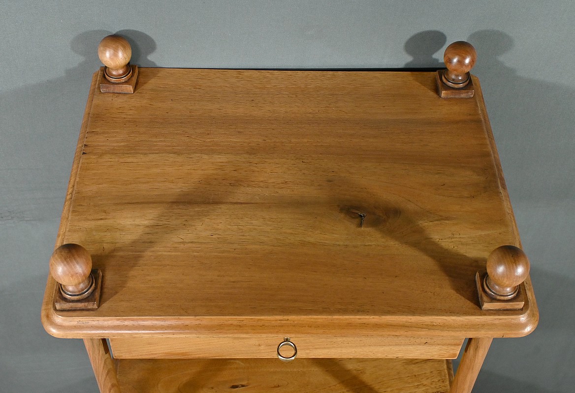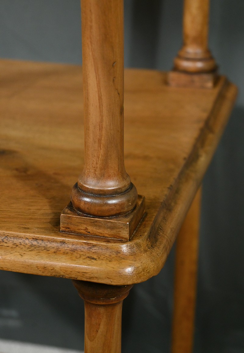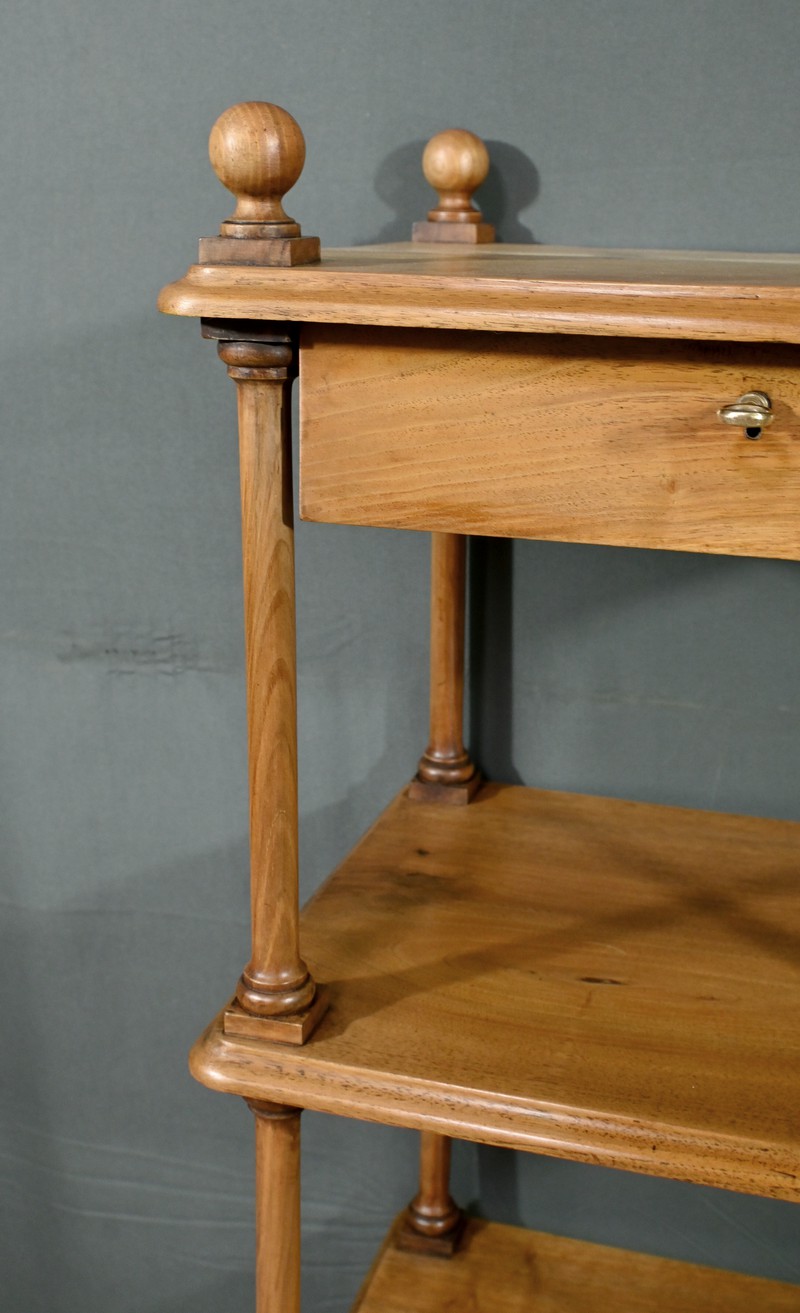 Découvrez ce charmant petit meuble étagère daté des années 1900. Ce meuble intemporel et fonctionnel apportera une touche d’authenticité à votre intérieur. Fabriqué en noyer massif, ce meuble est composé de quatre niveaux, dont trois étagères ouvertes et un tiroir situé sous le plateau supérieur. Chaque coin du plateau supérieur est orné d’une boule en bois et les étagères sont soutenues par des colonnettes tournées en bois, qui confèrent au meuble une allure classique. Le tiroir est équipé d’une petite clé laiton accompagné de sa serrure fonctionnelle. Grâce à son design compact et polyvalent, il s’intégrera parfaitement dans divers espaces de votre maison, que ce soit dans un salon, une chambre ou un bureau.