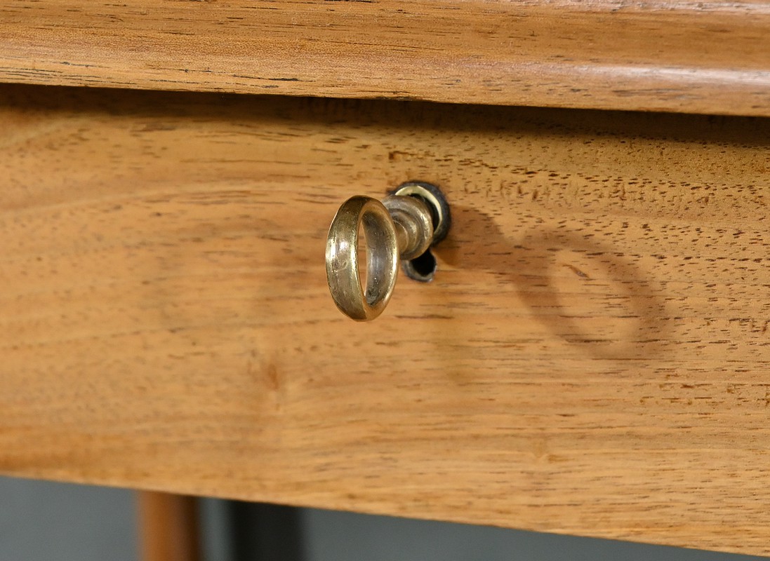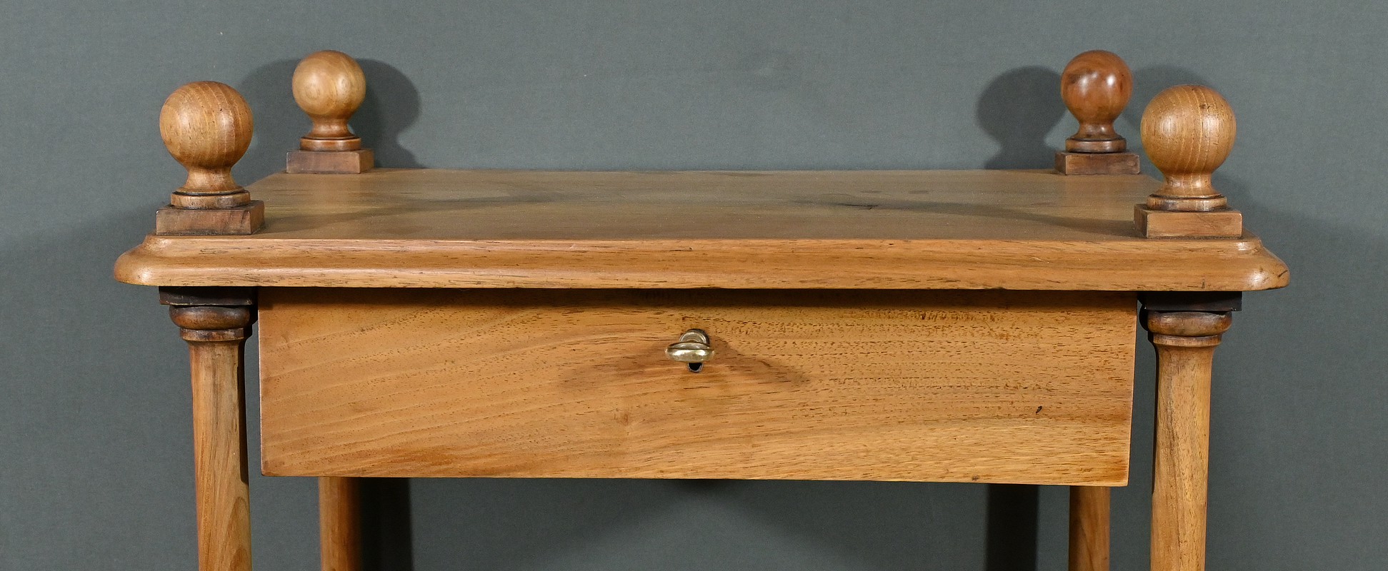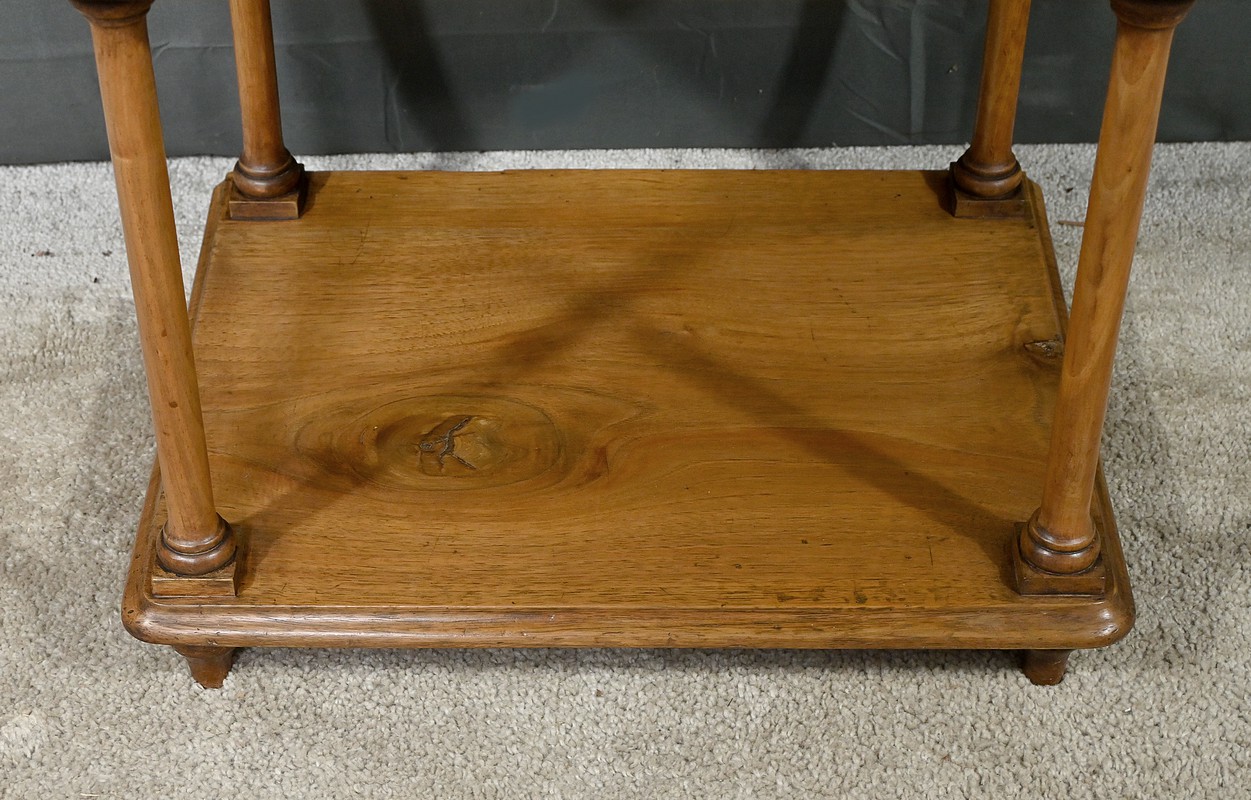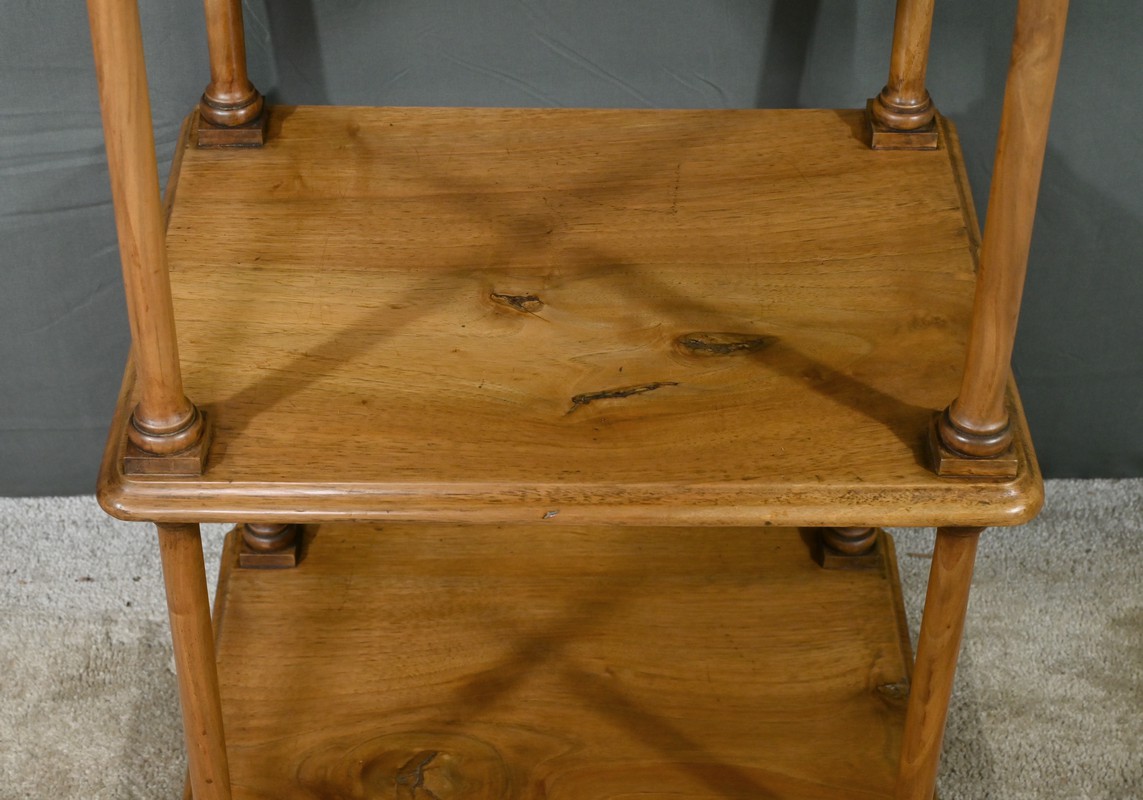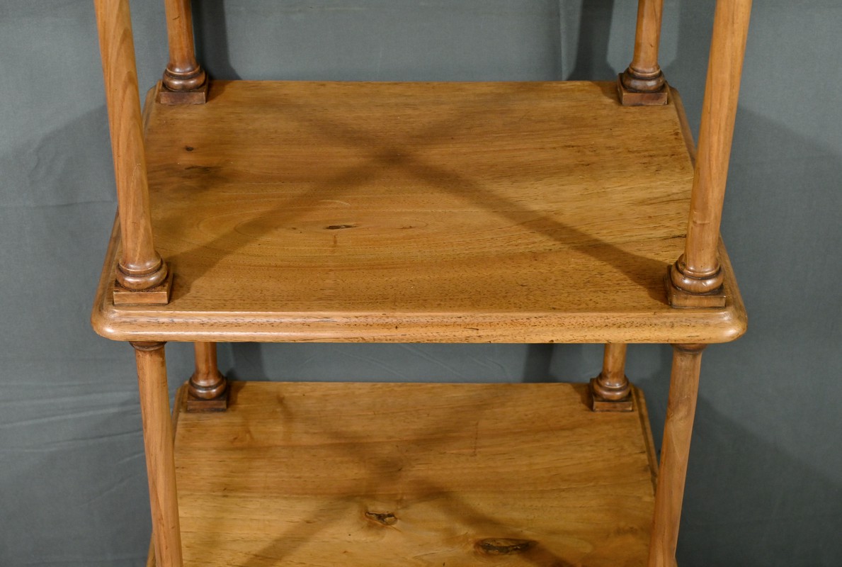 Découvrez ce charmant petit meuble étagère daté des années 1900. Ce meuble intemporel et fonctionnel apportera une touche d’authenticité à votre intérieur. Fabriqué en noyer massif, ce meuble est composé de quatre niveaux, dont trois étagères ouvertes et un tiroir situé sous le plateau supérieur. Chaque coin du plateau supérieur est orné d’une boule en bois et les étagères sont soutenues par des colonnettes tournées en bois, qui confèrent au meuble une allure classique. Le tiroir est équipé d’une petite clé laiton accompagné de sa serrure fonctionnelle. Grâce à son design compact et polyvalent, il s’intégrera parfaitement dans divers espaces de votre maison, que ce soit dans un salon, une chambre ou un bureau.