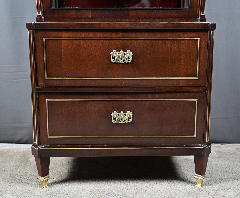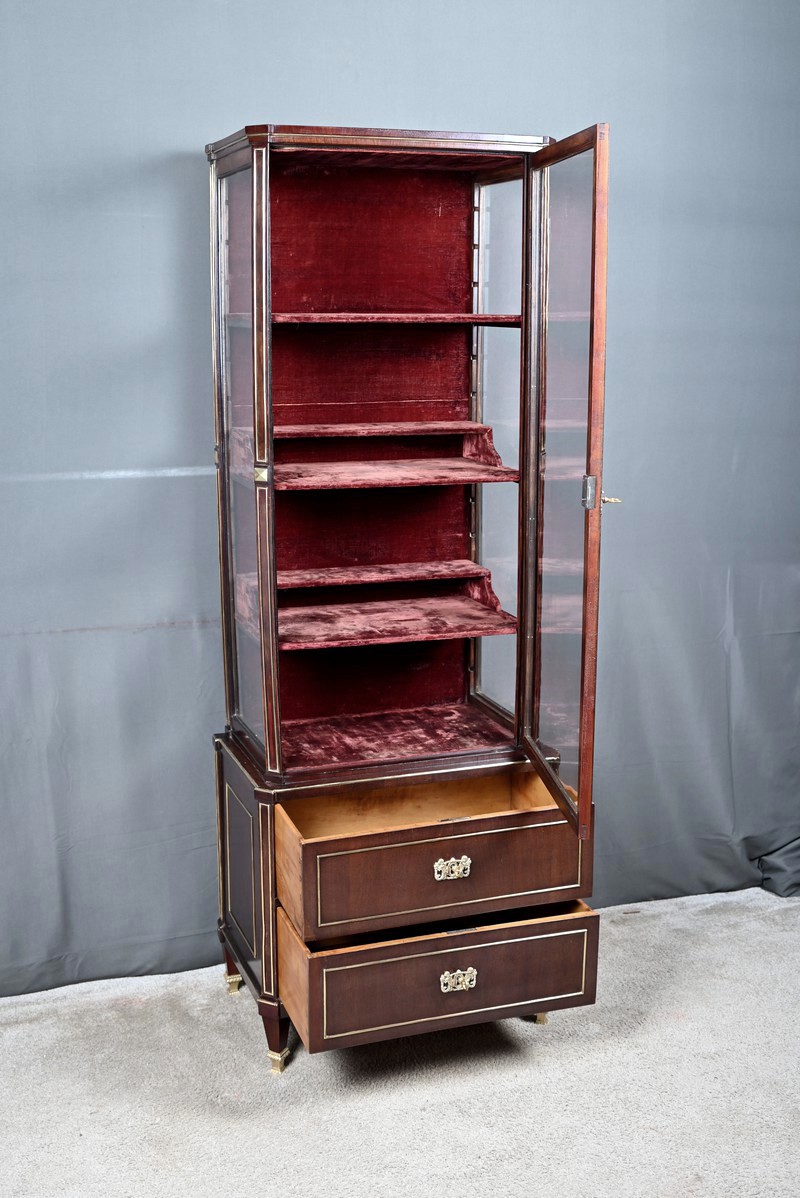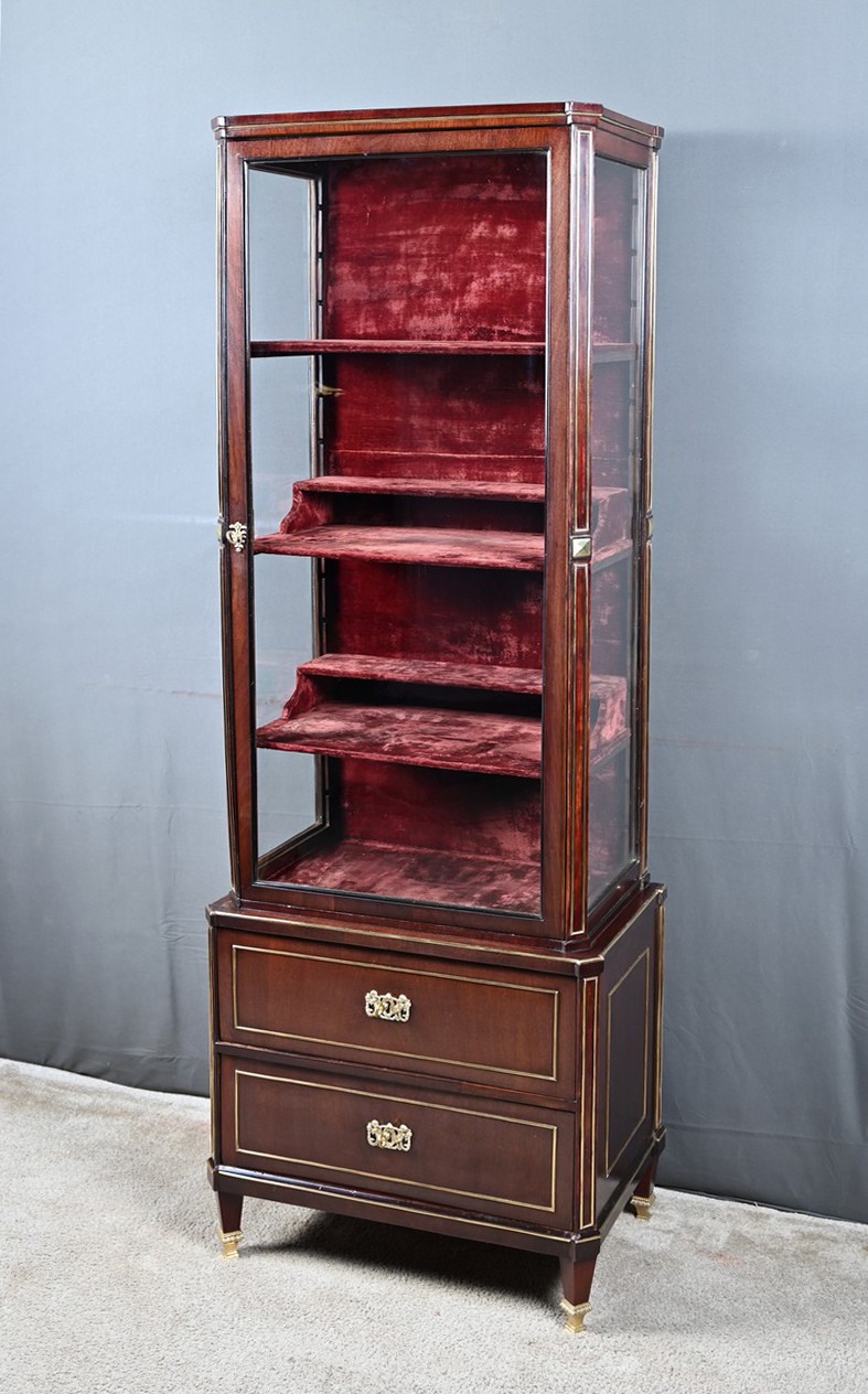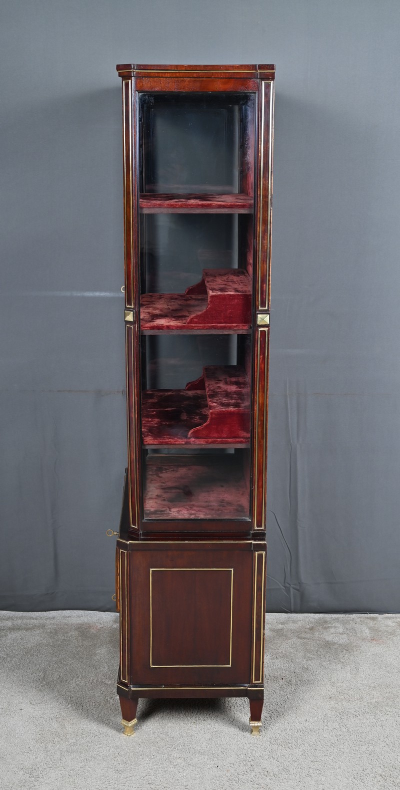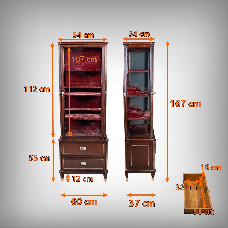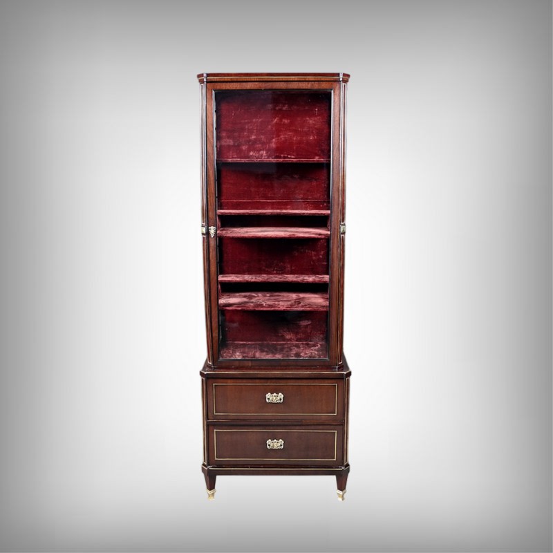 Cette élégante vitrine toutes faces est réalisée en acajou massif et placage d’acajou. Elle s’ouvre en partie haute par une porte vitrée, permettant une vue dégagée sur les objets exposés, et en partie basse par deux tiroirs munis de serrures.