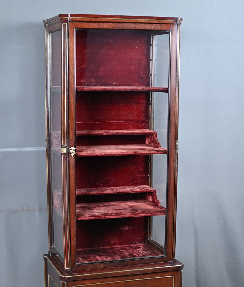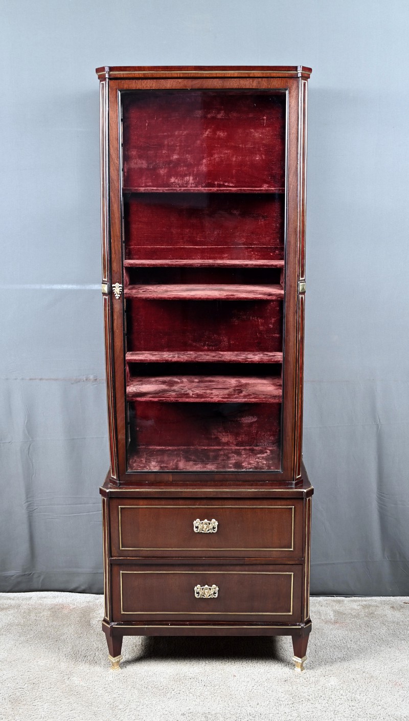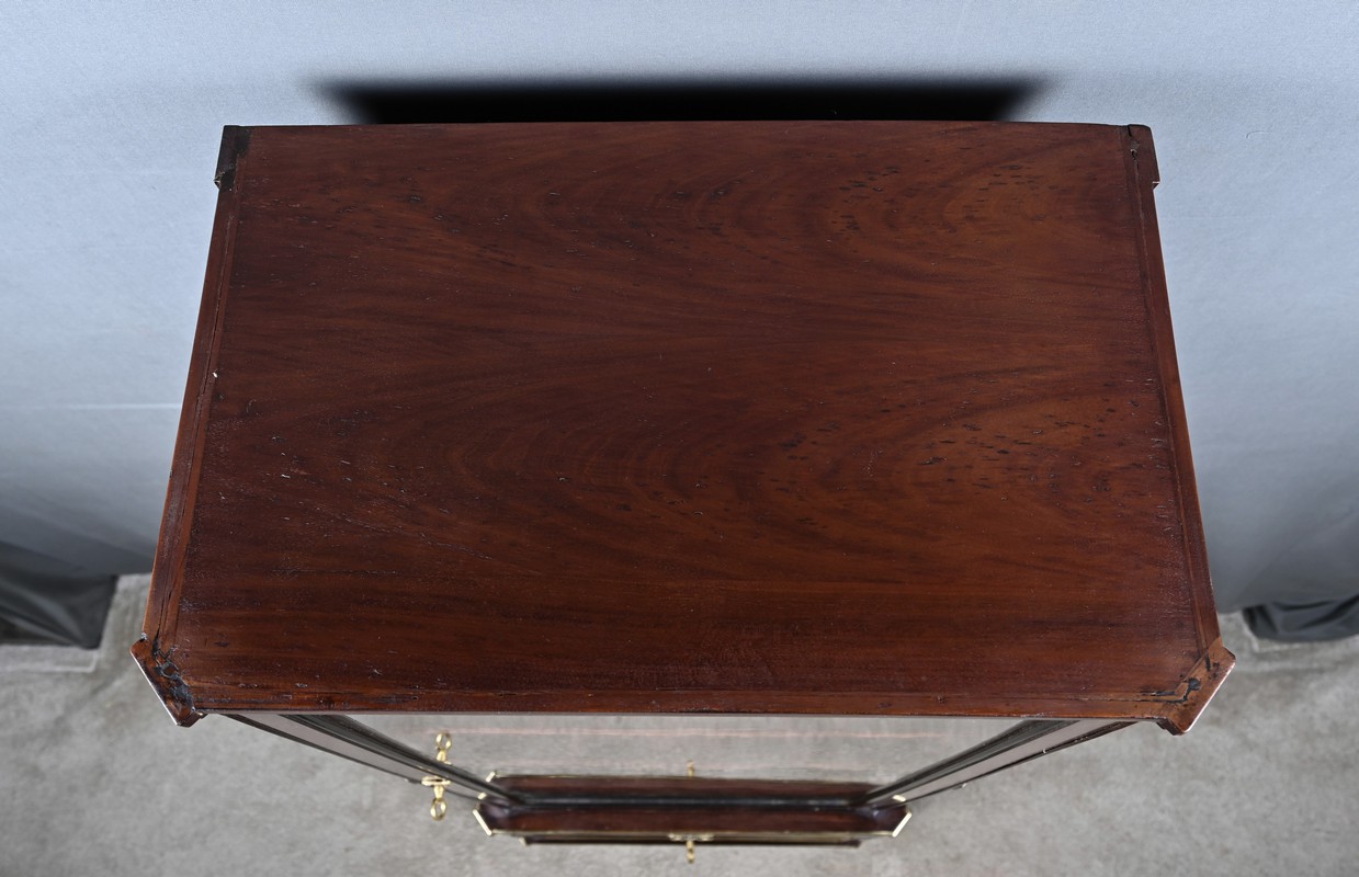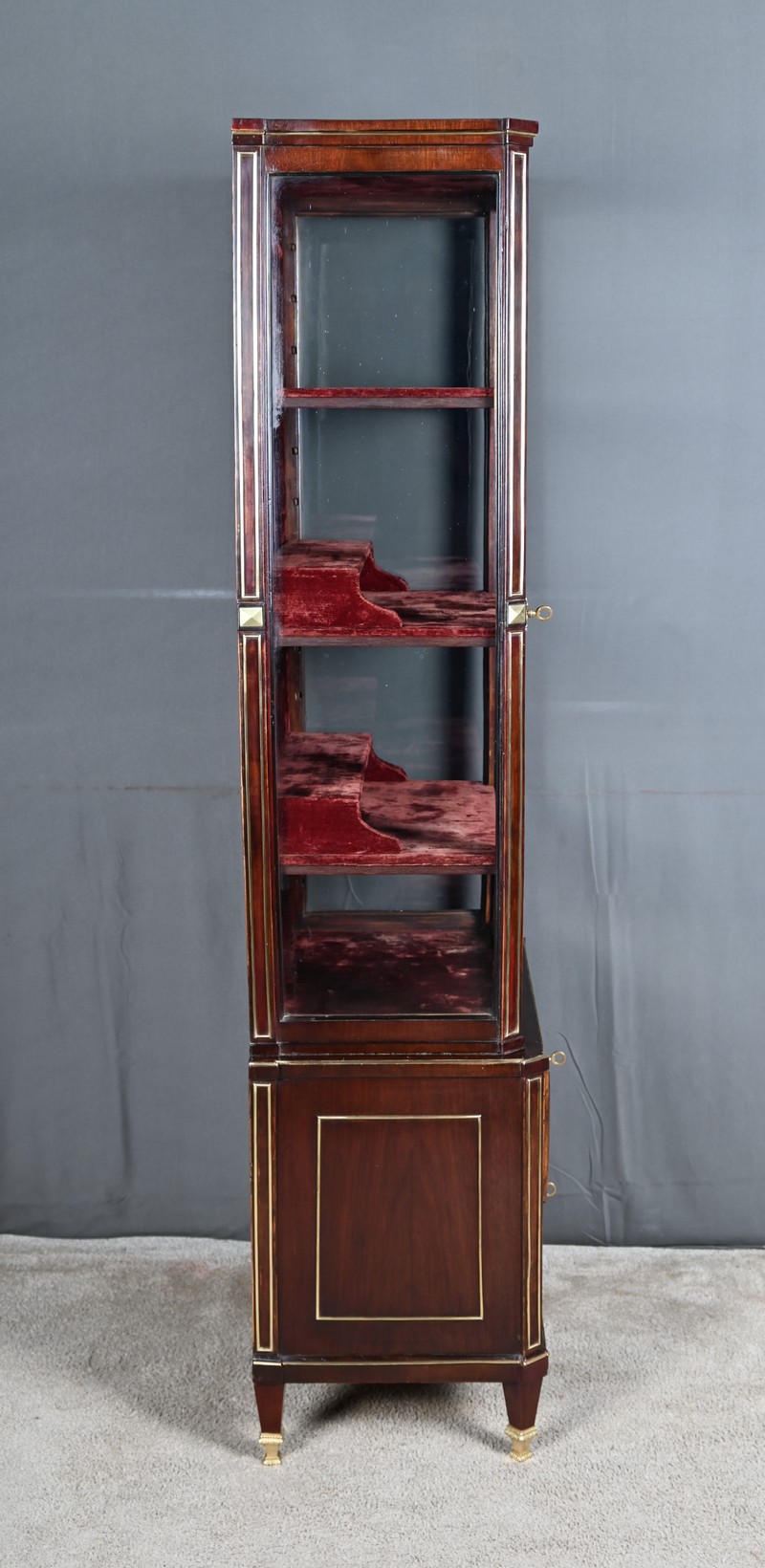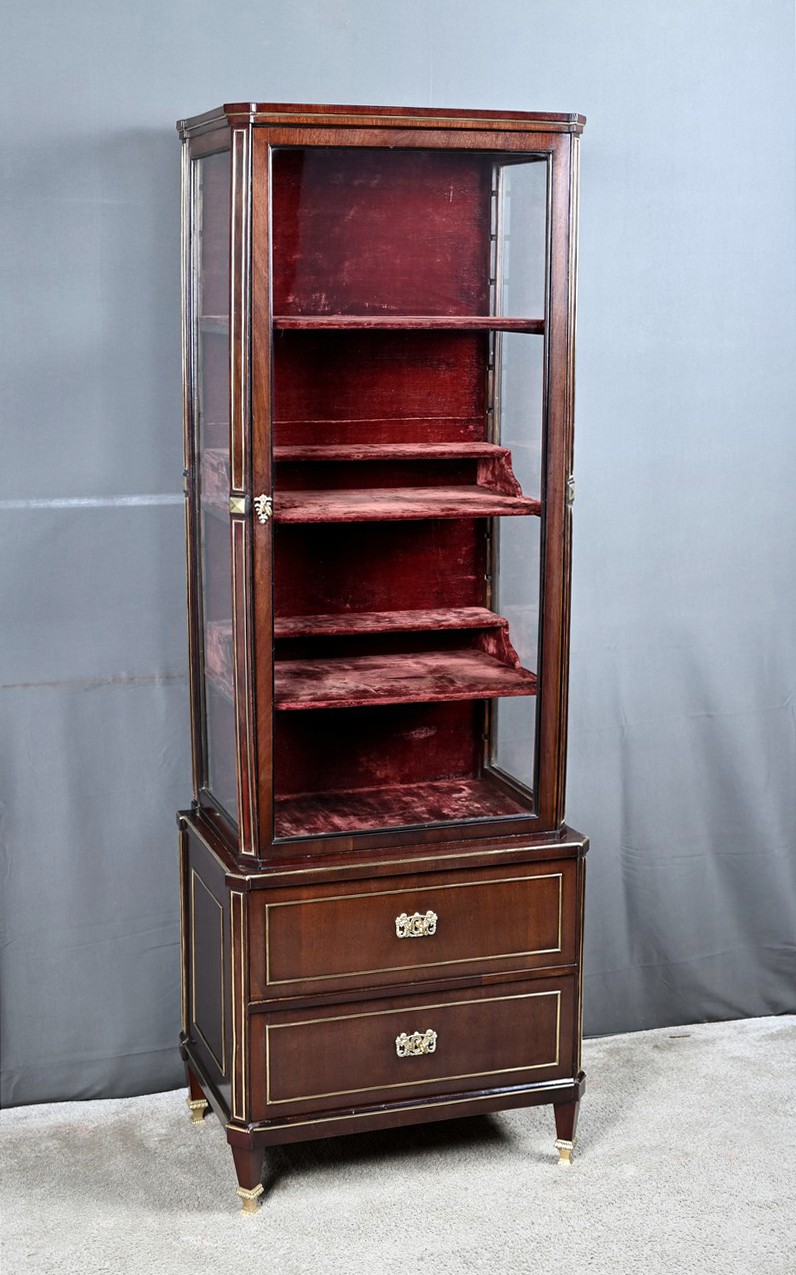 Cette élégante vitrine toutes faces est réalisée en acajou massif et placage d’acajou. Elle s’ouvre en partie haute par une porte vitrée, permettant une vue dégagée sur les objets exposés, et en partie basse par deux tiroirs munis de serrures.