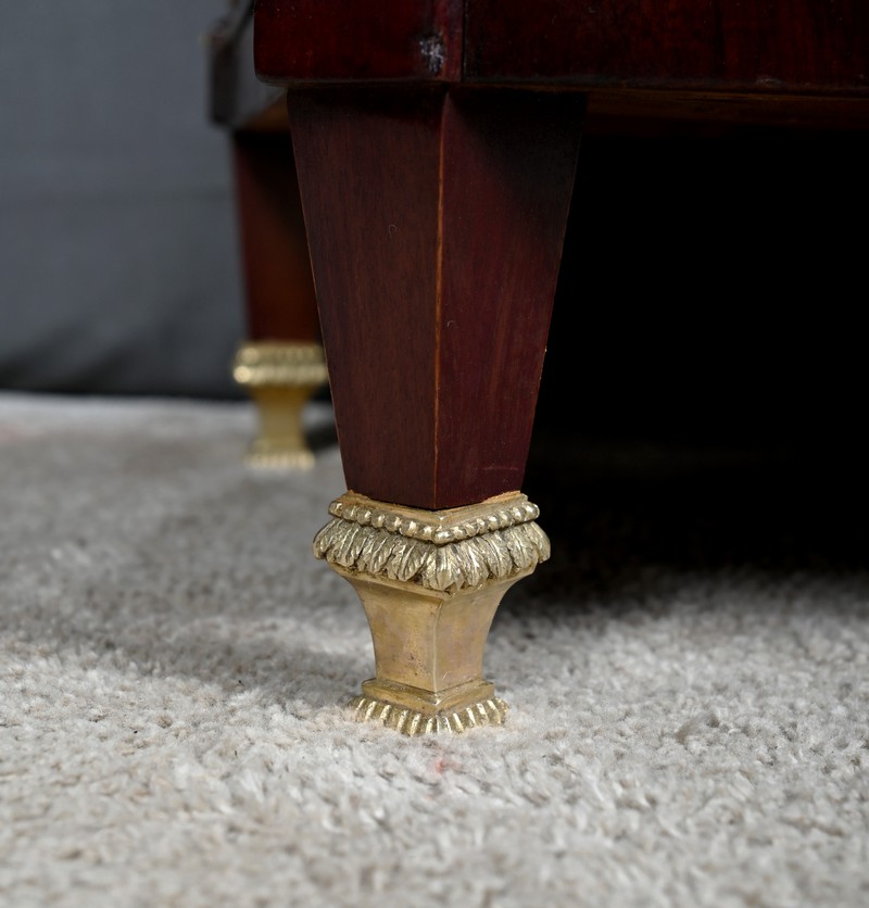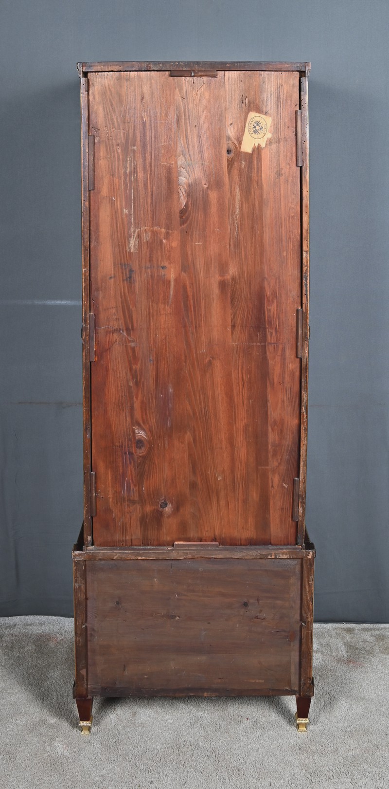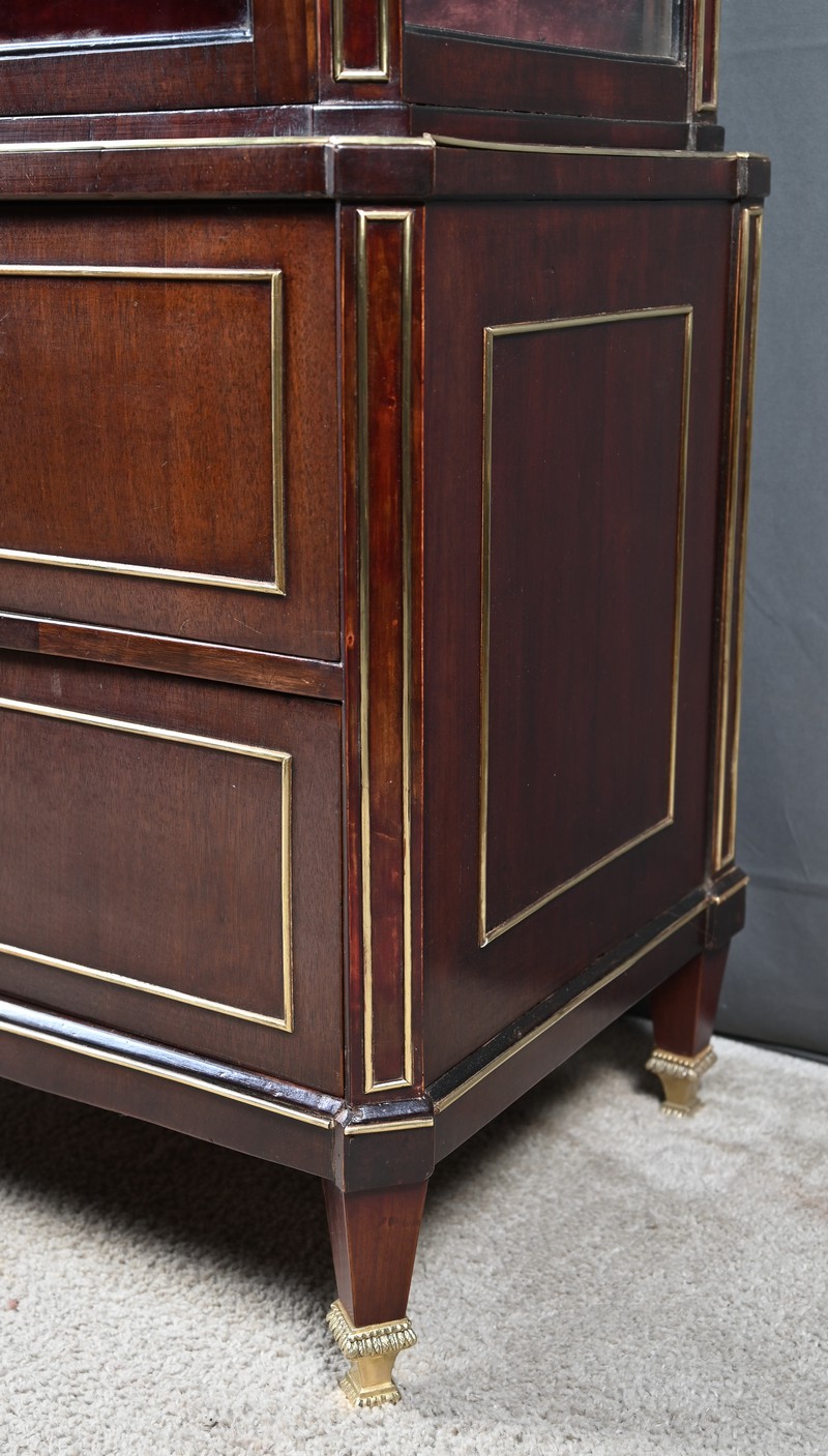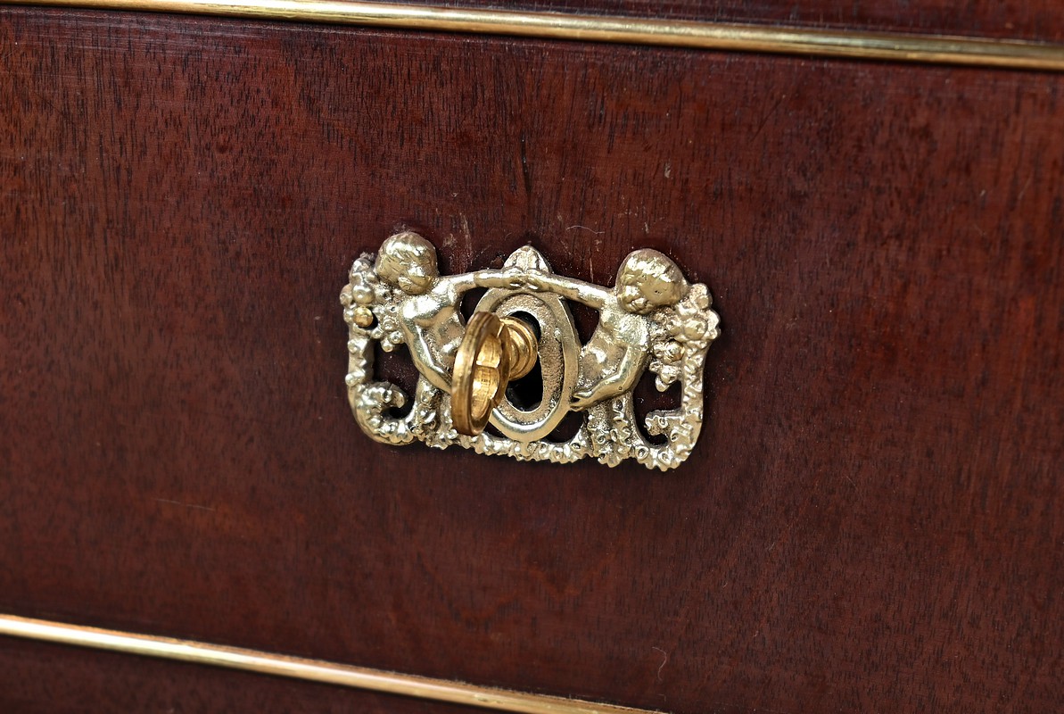L’ensemble du meuble est délicatement souligné par des filets de laiton qui en rehaussent les lignes et accentuent son caractère précieux. Les angles avant sont à pans coupés. Les ornementations en bronze sont particulièrement soignées : les serrures sont accompagnées de belles entrées finement ouvragées, et les clés sont ciselées. Les entrées de serrure des tiroirs représentent des angelots, tandis que celle de la porte vitrée figure une palmette raffinée.