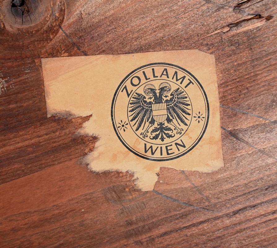 Le meuble repose sur des pieds fuselés qui se terminent par des sabots feuillagés, ajoutant une touche de sophistication à l’ensemble. Les plinthes en relief renforcent la présence et l’élégance du meuble. L’arrière du meuble est étiqueté « Zollamt Wien ».