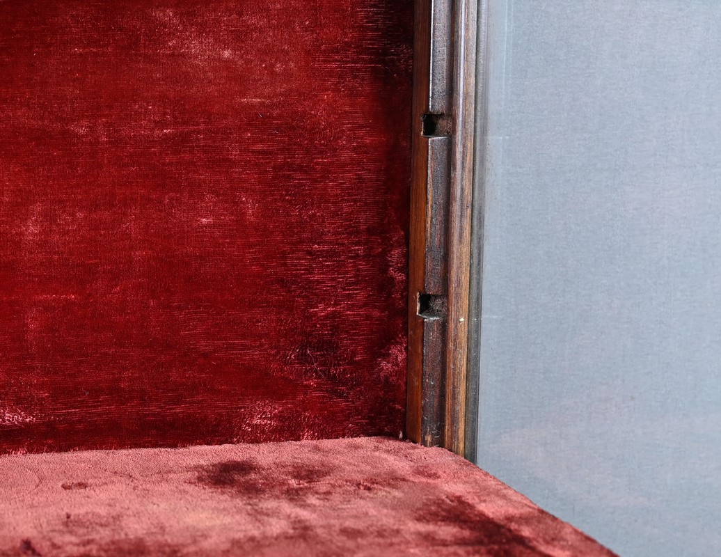 L’intérieur de la vitrine est habillé d’un tissu en velours bordeaux, créant un écrin chaleureux et luxueux pour les objets exposés. Trois étagères réglables en hauteur permettent d’adapter l’agencement selon les besoins.
