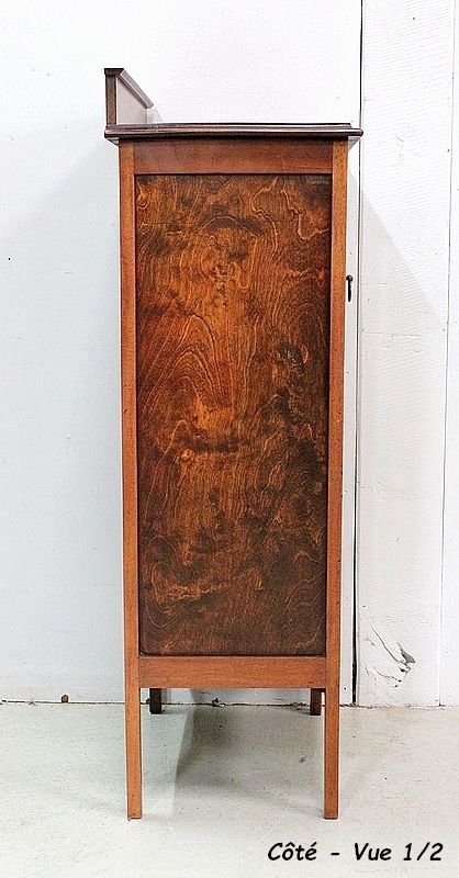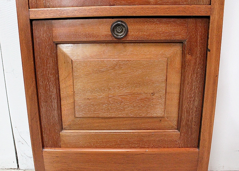 En partie basse, ce Meuble propose un Abattant avec Panneau central à Plates Bandes, en Acajou blond. Il révèle trois Compartiments, qui vous permettront d’ordonner vos catalogues , journaux , magazines etc …