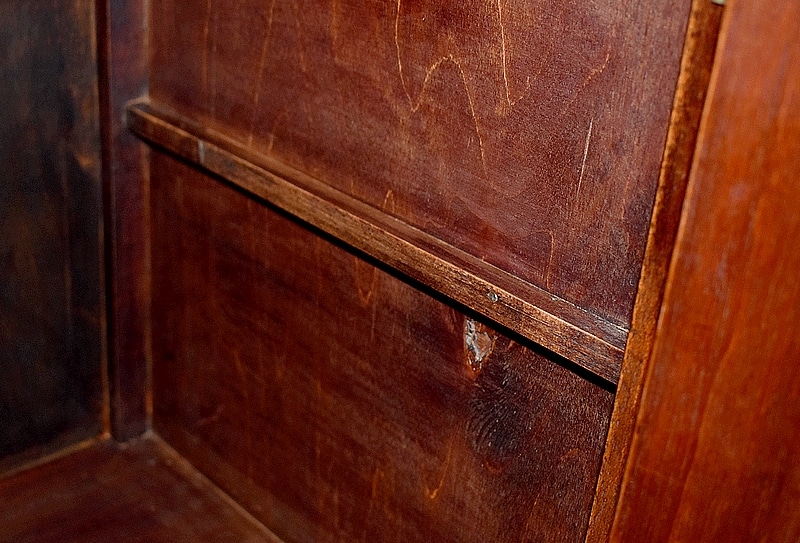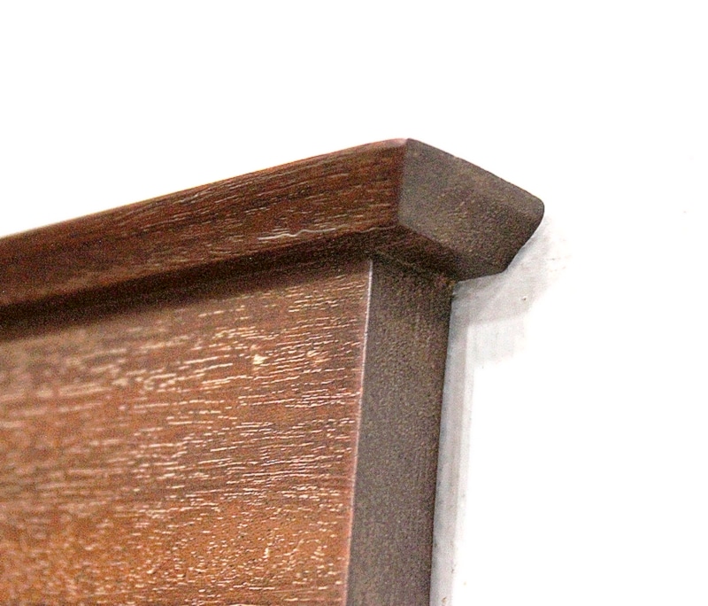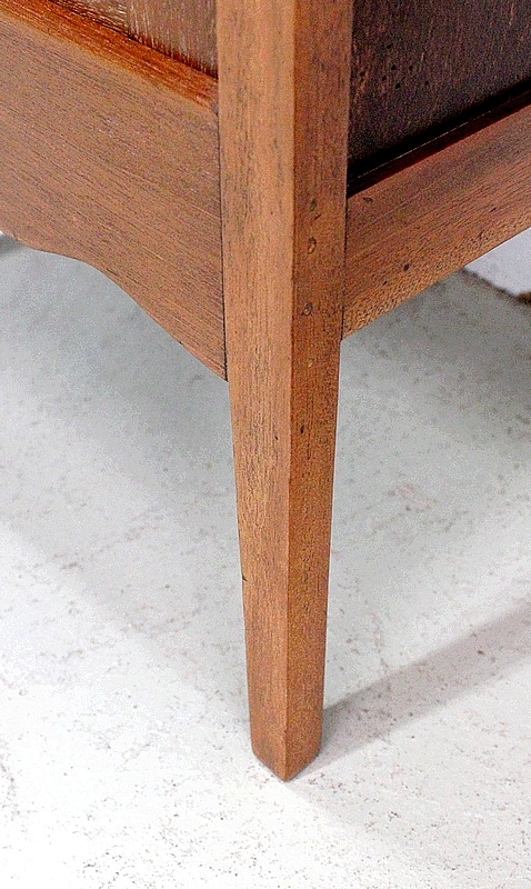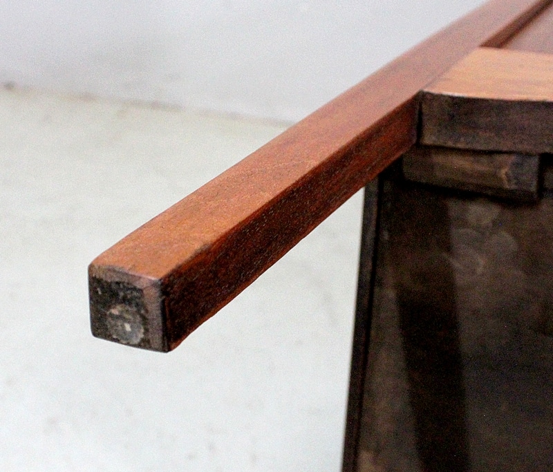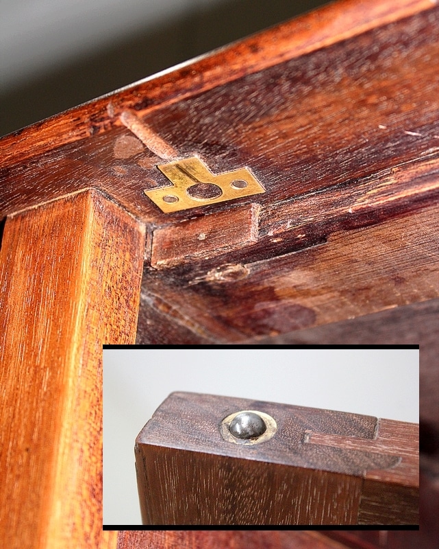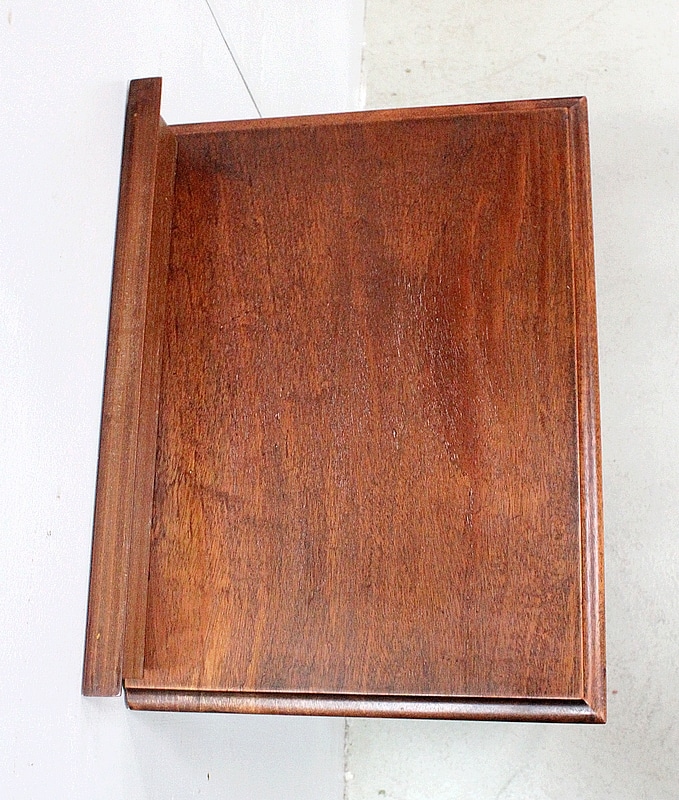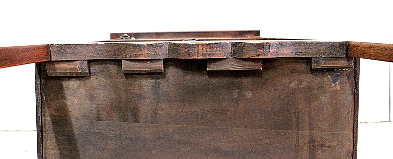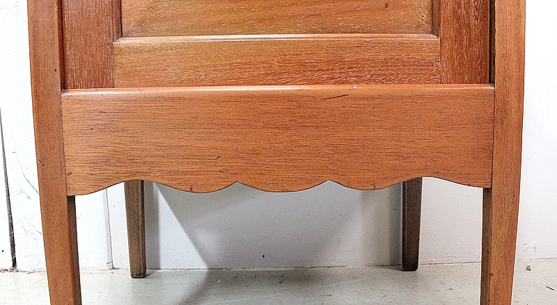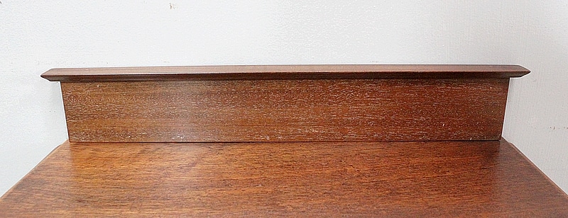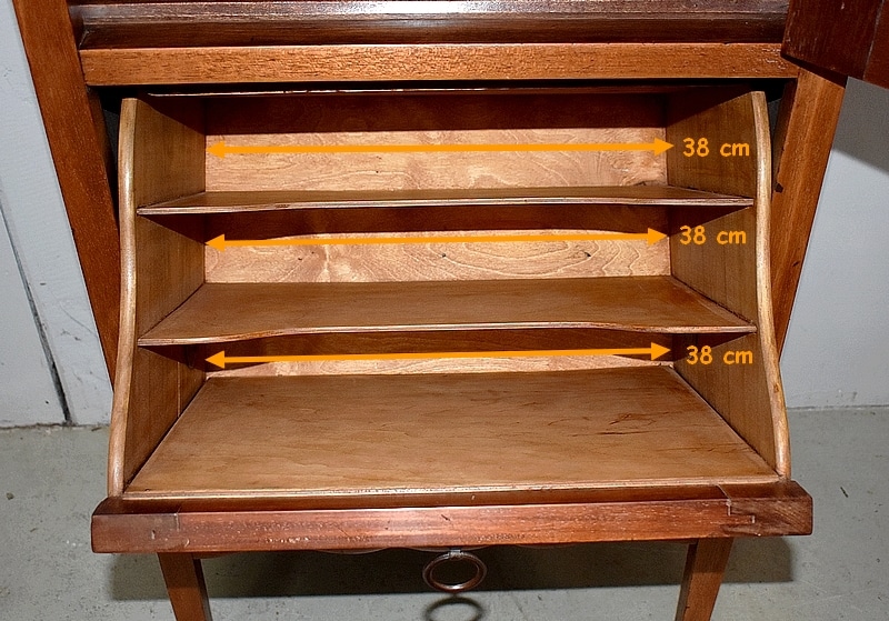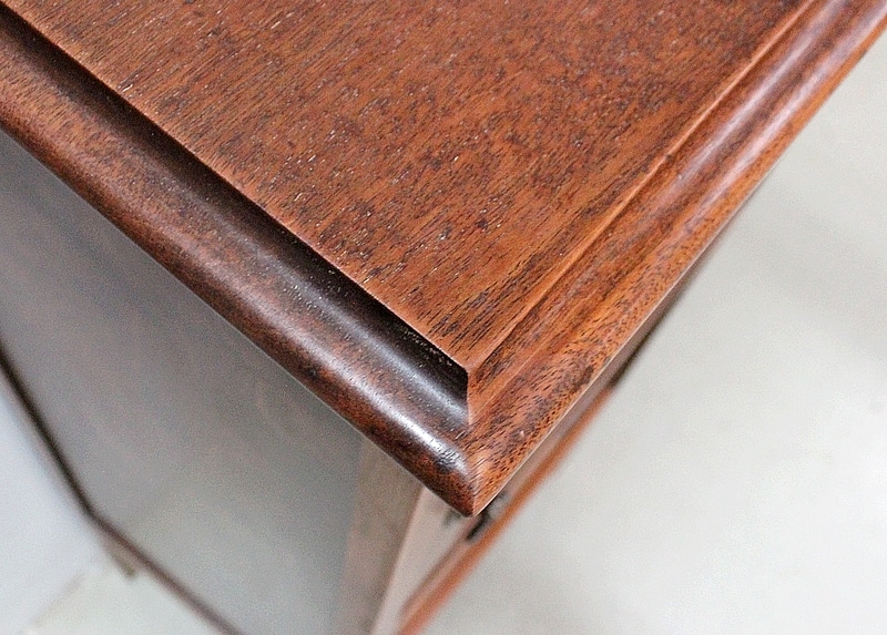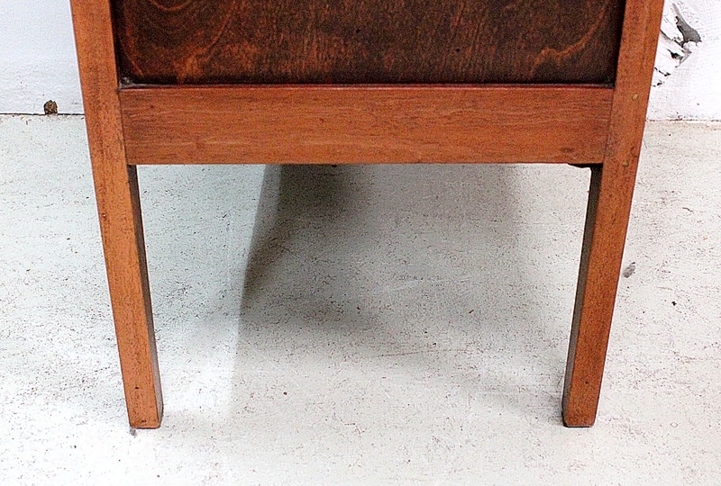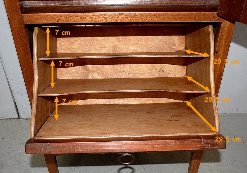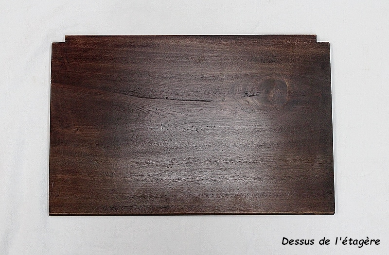 Son dessus se compose d’une seule Planche en Acajou foncé Massif, accompagnée d’une fine Moulure à Gorge dans son pourtour. Ce plateau est sommé d’un Dosseret, de la même Essence, formant une butée.