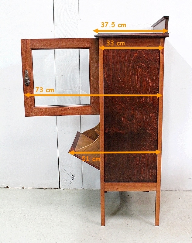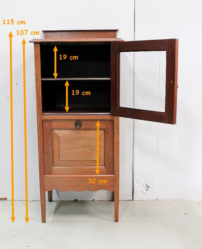 En dessous, ce Joli Mobilier est constitué d’une petite porte Vitrée, se fermant à l’aide d’un système à bille. Elle découvre deux Espaces de Rangements formés par la présence d’une étagère Mobile, profonde de 30 cm, et posée sur Tasseaux Fixes.