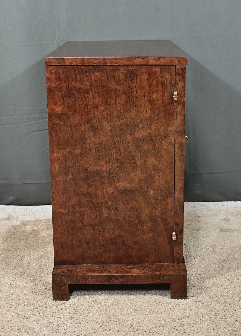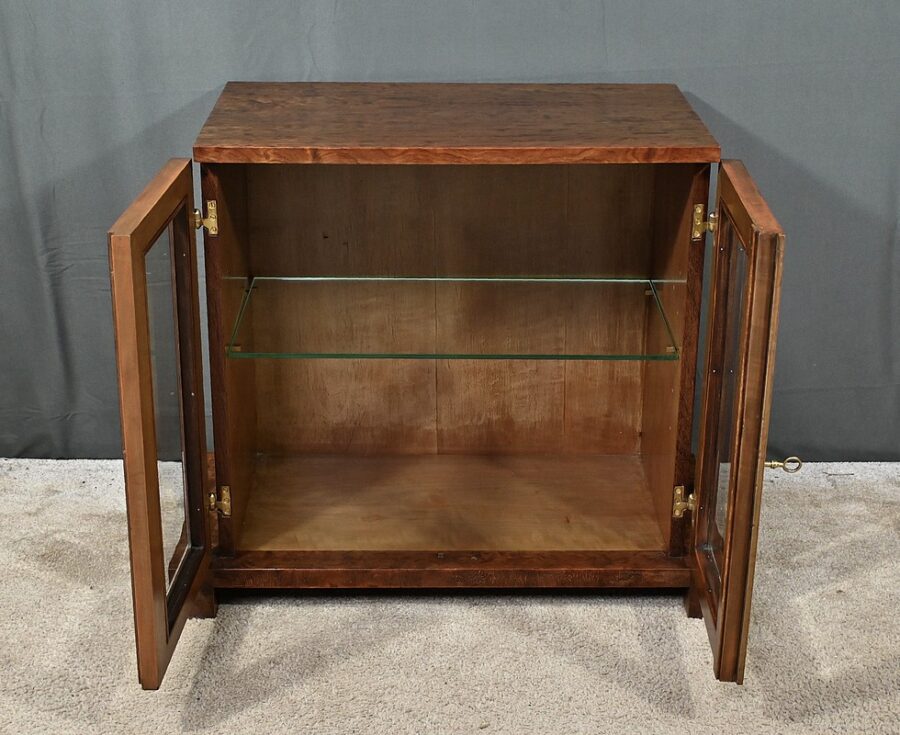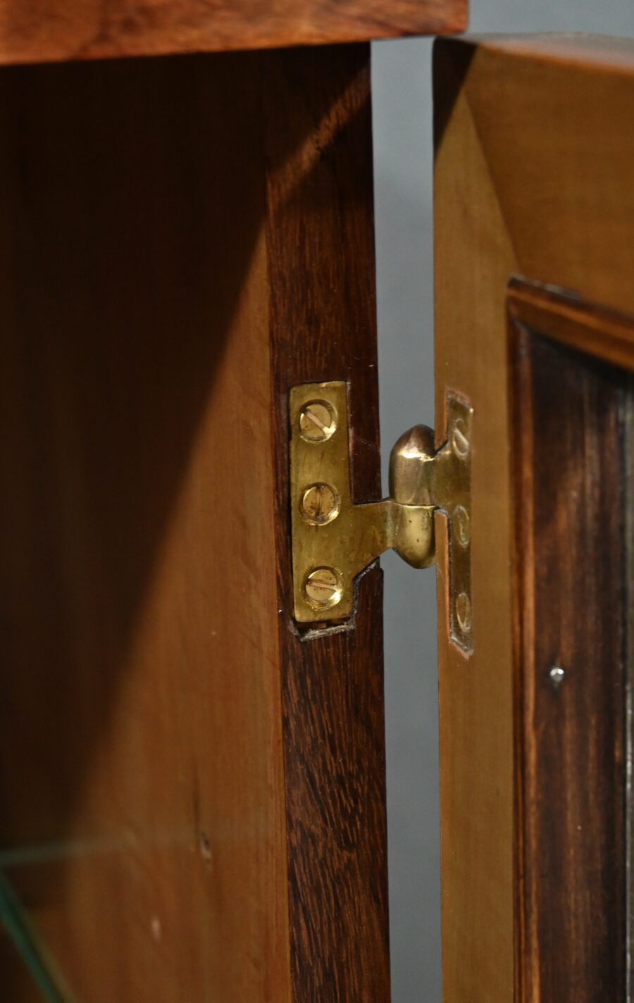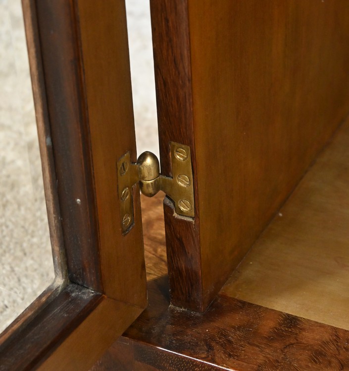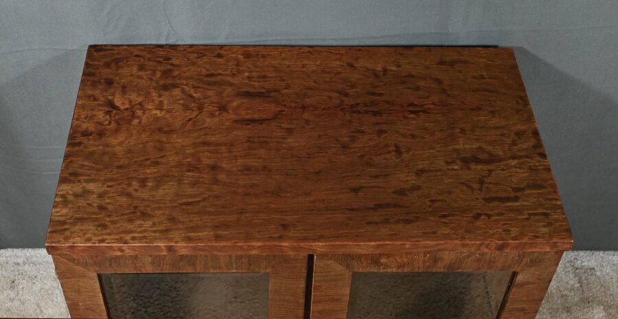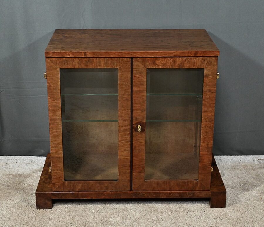 Cette petite vitrine en placage d’acajou moucheté, datant du début du XXe siècle, est une pièce de mobilier élégante et raffinée. Elle se distingue par ses deux portes à panneaux vitrés et droits, qui permettent de mettre en valeur et de protéger vos objets décoratifs ou vos livres. L’acajou moucheté confère à cette vitrine une allure unique, tandis que l’étagère en verre à l’intérieur ajoutent une touche de légèreté. Ce meuble est parfait pour les amateurs de mobilier Art Déco.