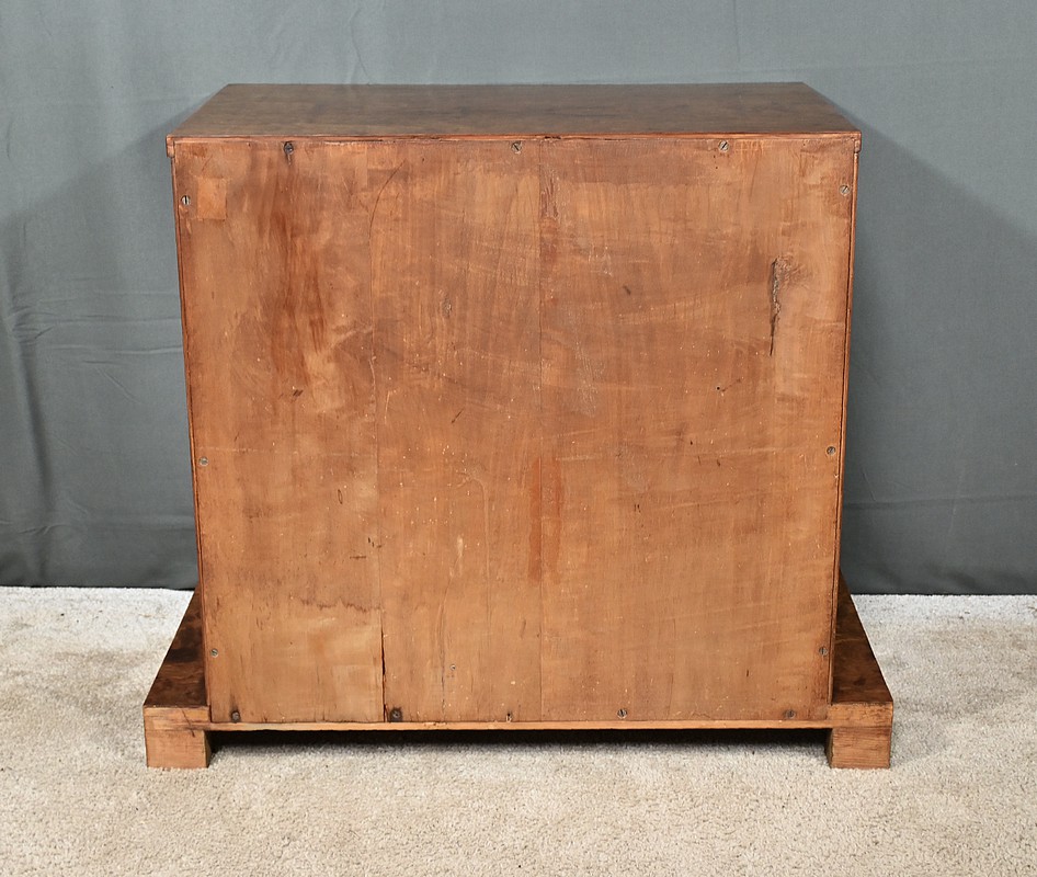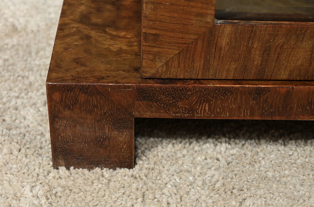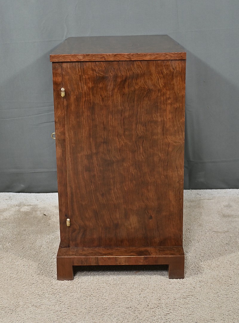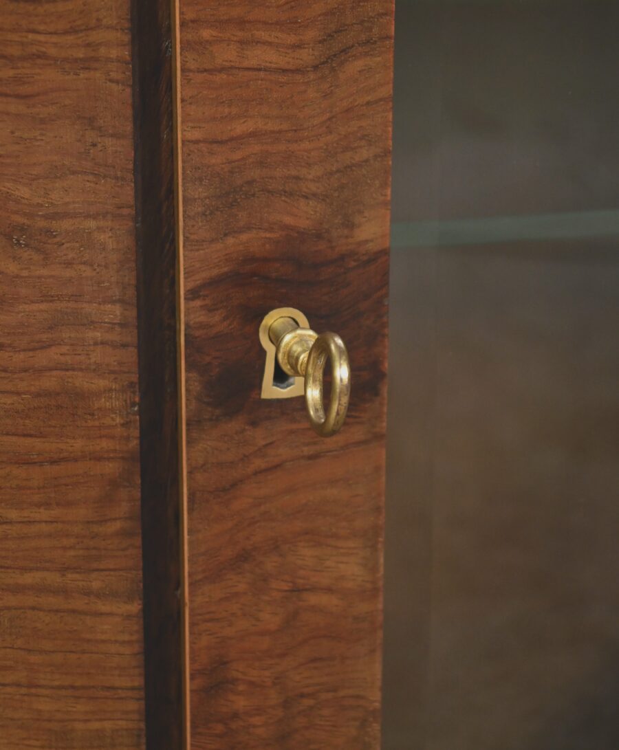 Cette petite vitrine en placage d’acajou moucheté, datant du début du XXe siècle, est une pièce de mobilier élégante et raffinée. Elle se distingue par ses deux portes à panneaux vitrés et droits, qui permettent de mettre en valeur et de protéger vos objets décoratifs ou vos livres. L’acajou moucheté confère à cette vitrine une allure unique, tandis que l’étagère en verre à l’intérieur ajoutent une touche de légèreté. Ce meuble est parfait pour les amateurs de mobilier Art Déco.