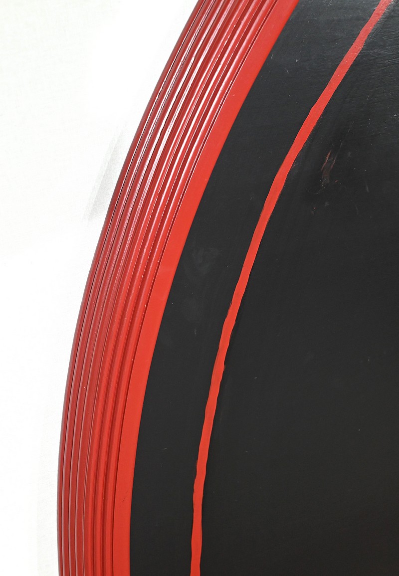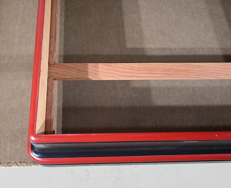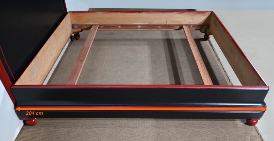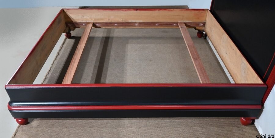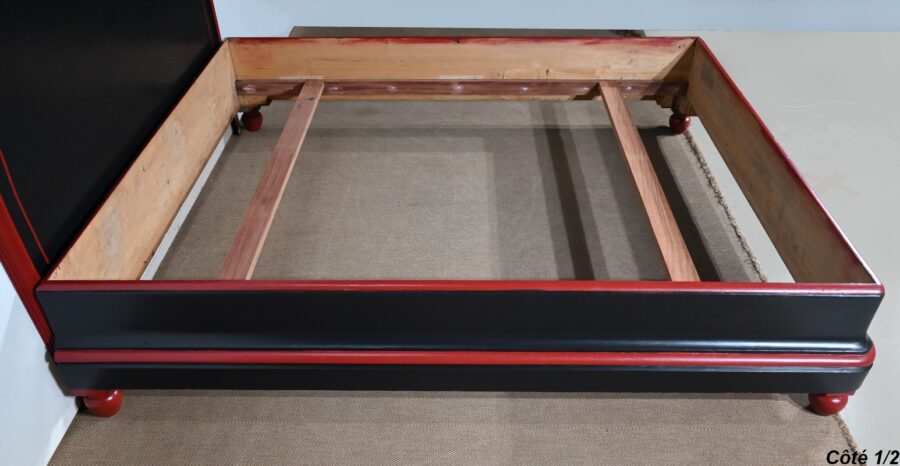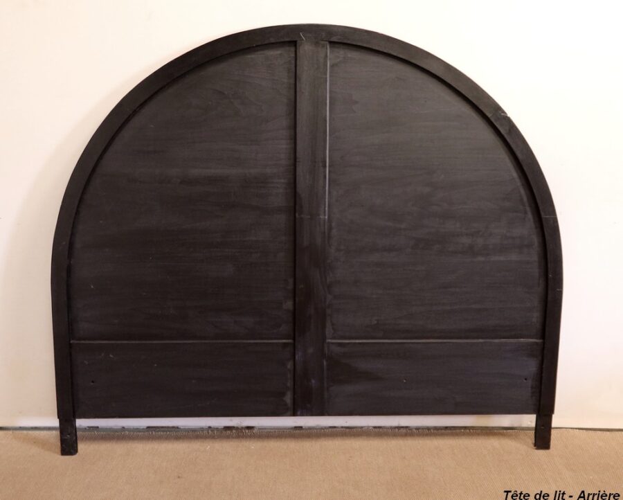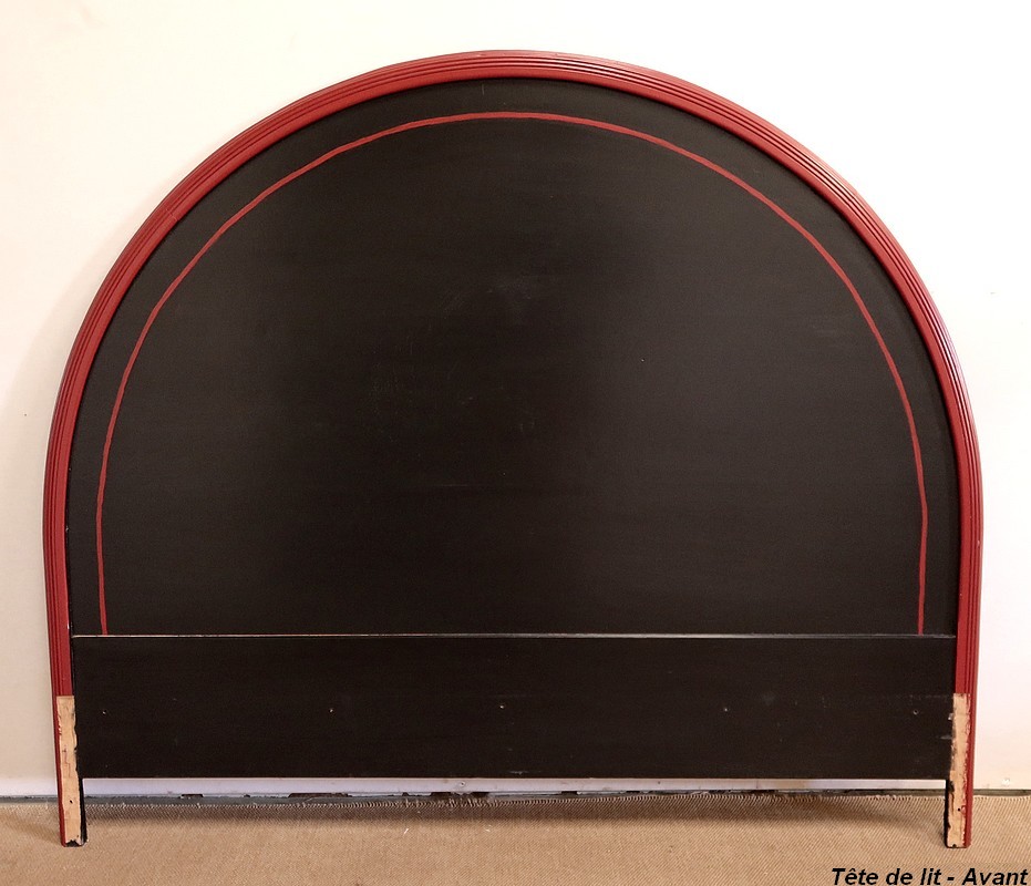Ce lit est accompagné d’une tête en demi-cercle moulurée en saillie dans le pourtour. Elle se compose d’un grand panneau souligné d’un fin liseré rouge.