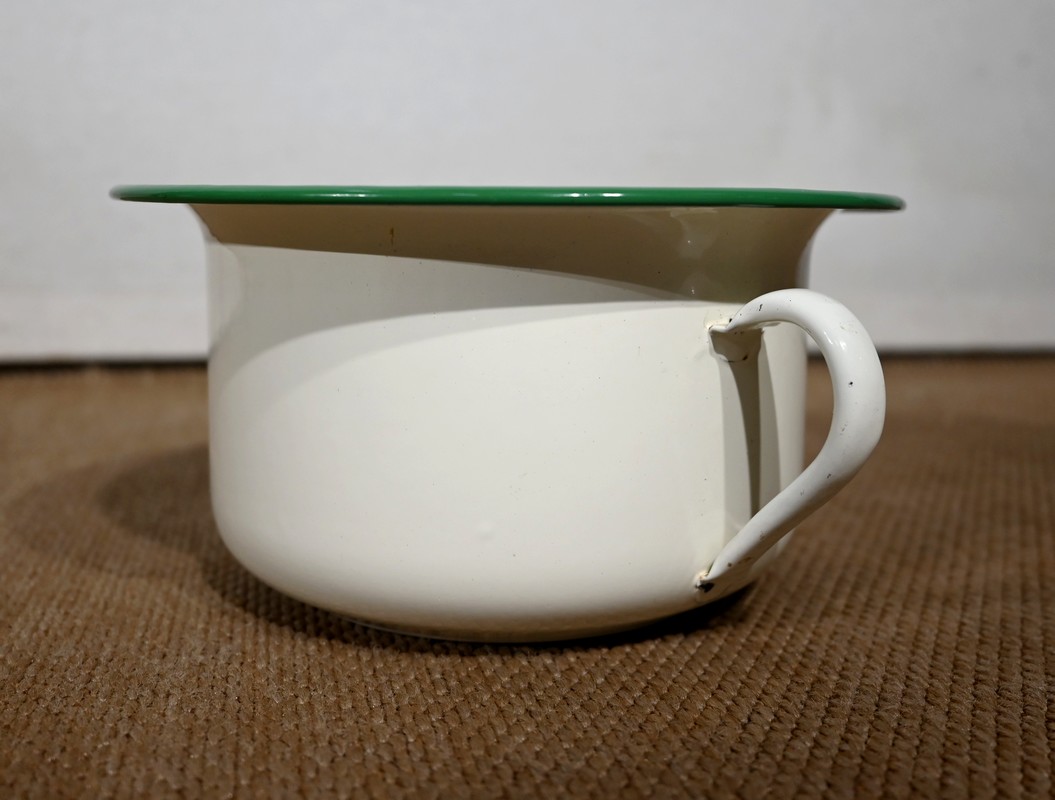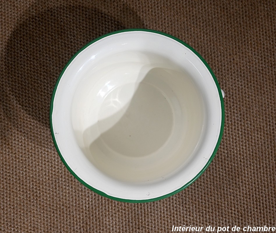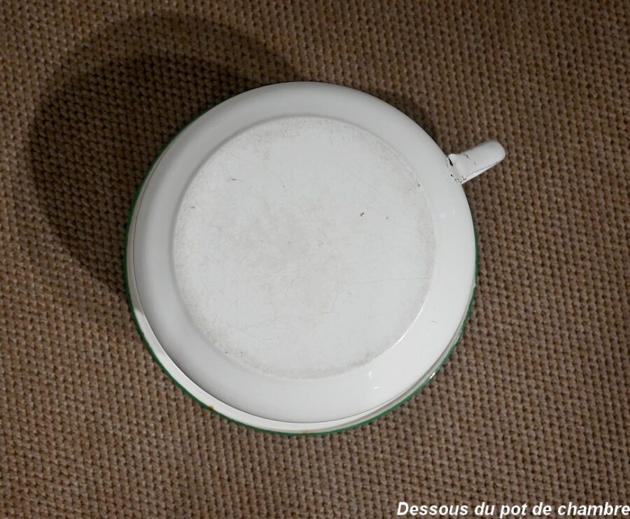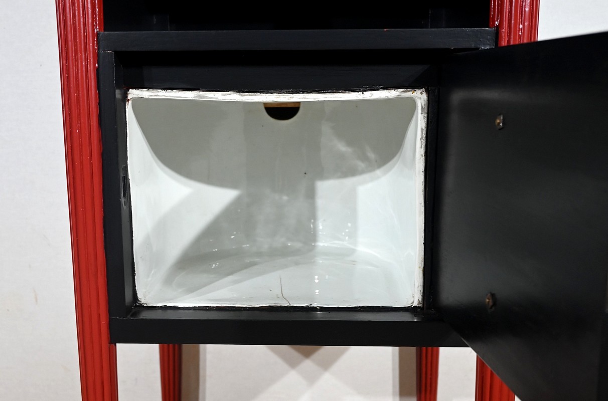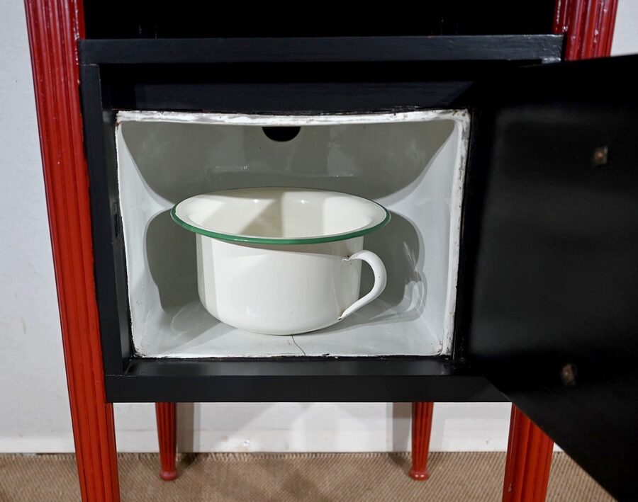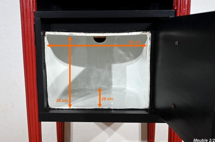 Seule différence entre ces deux articles : l’un comprend un espace de quatre casiers horizontaux tandis que l’autre offre une porte simulant deux tiroirs habillés de pendentifs en bronze ciselé. L’intérieur, en faïence, était à l’origine prévu pour accueillir un pot de chambre (inclus).