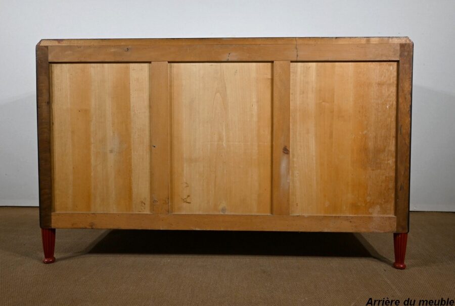 Le dessus, en marbre des Pyrénées, est sommé d’un dosseret en anse de panier.
